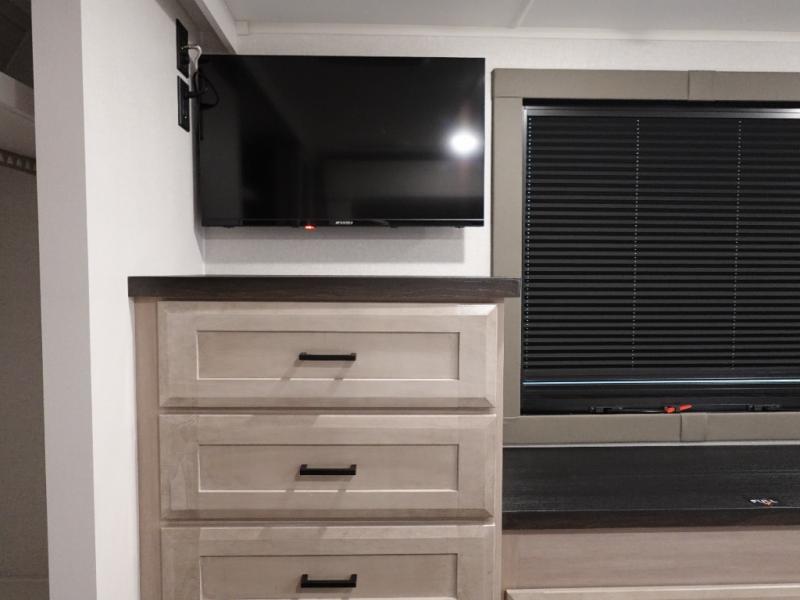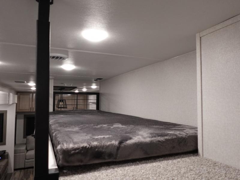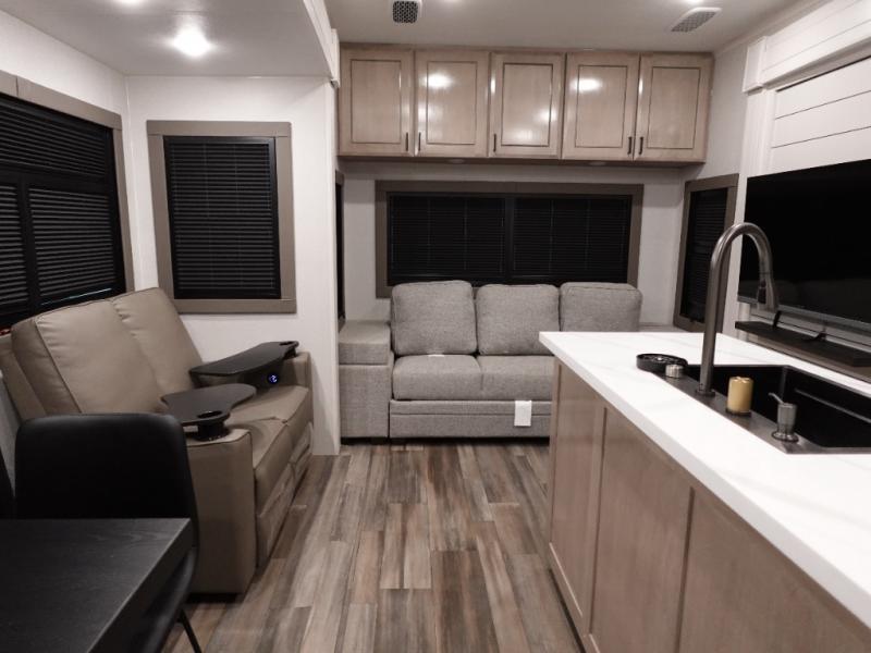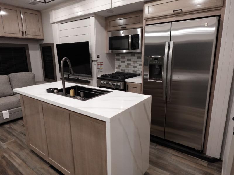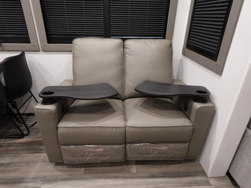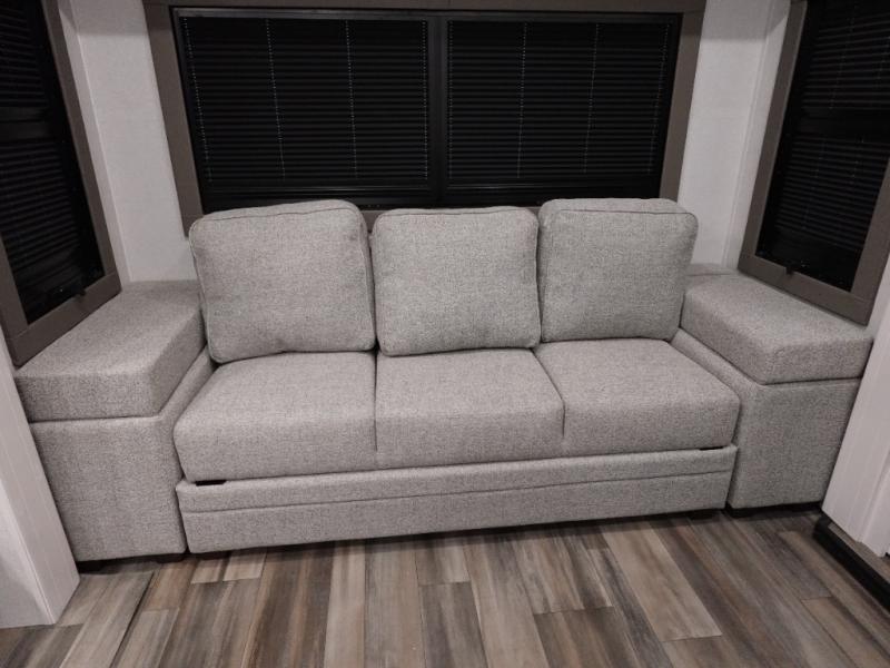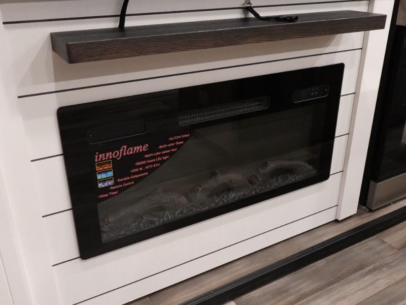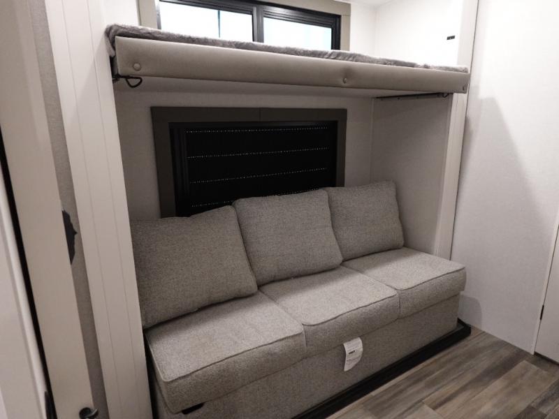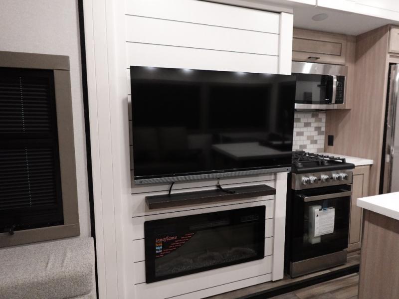 You won't even feel like you are camping in this fifth wheel! The rear living area features theater seats, as well as a tri-fold sofa with adjustable headrests. It's the perfect place to watch a movie with the Smart entertainment HDTV that has Bluetooth, soundbar, and built-in stereo, plus there is a cozy fireplace! The kitchen includes a full suite of GE residential appliances including a 4-burner range, a 21 cu. ft. refrigerator, and an over-the range microwave. Also, standard are a dishwasher and central vacuum system so cleaning up is easy! At night retire to the bedroom with its king bed with power base slide. A second TV lets you watch your favorite shows as you fall asleep. Storage abounds including a full wardrobe and dresser with pull-out top. A dual-entry full bath is easily accessible and includes even more storage with a linen closet. The second bedroom has slide that houses a flip-up bunk above a bi-fold sofa and a desk/dresser with overhead storage, and above it all is a loft for extra sleeping or storage space!