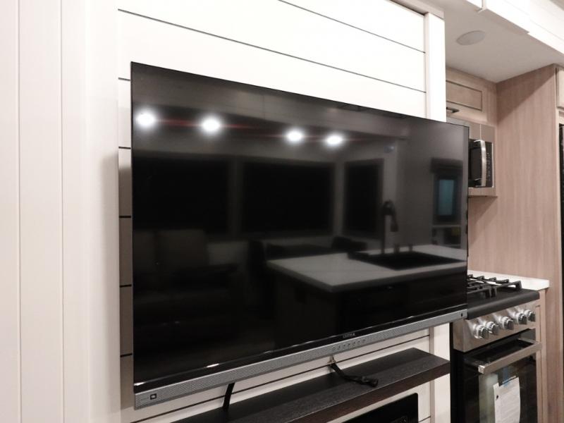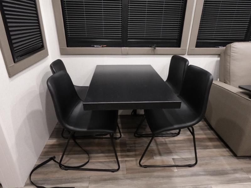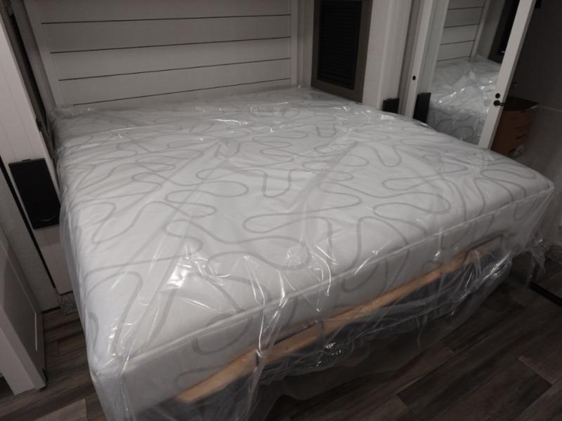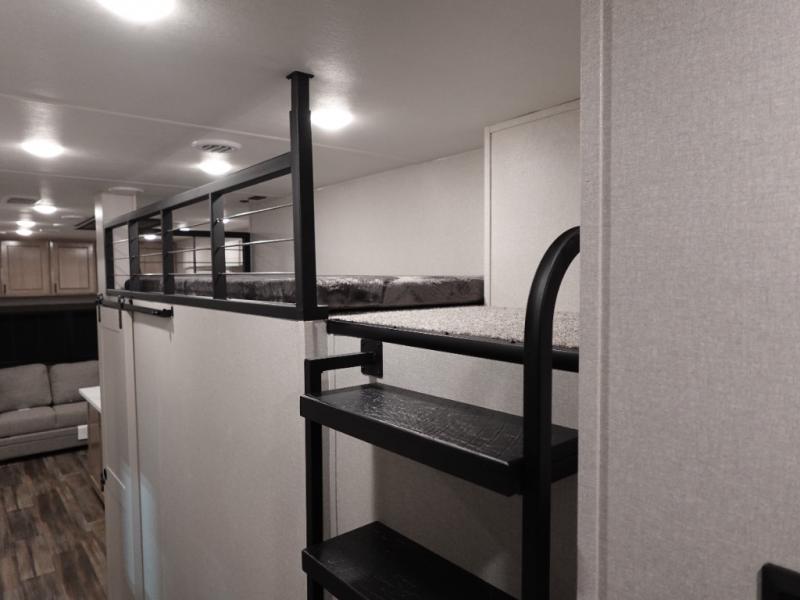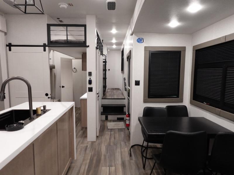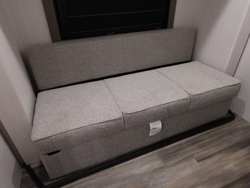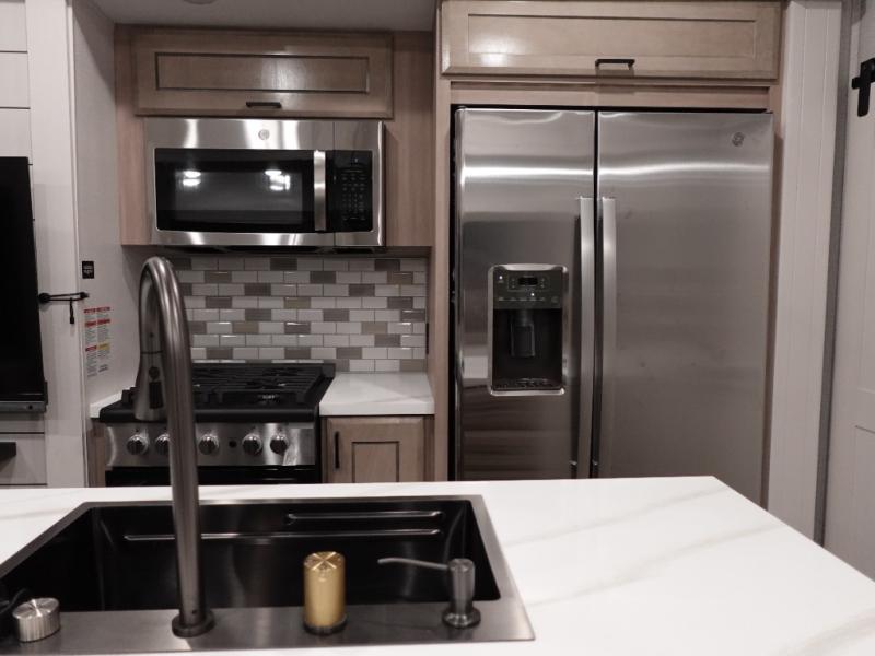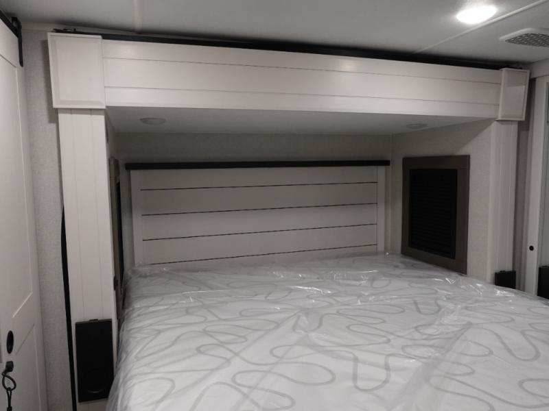You won't even feel like you are camping in this fifth wheel! The rear living area features theater seats, as well as a tri-fold sofa with adjustable headrests. It's the perfect place to watch a movie with the Smart entertainment HDTV that has Bluetooth, soundbar, and built-in stereo, plus there is a cozy fireplace! The kitchen includes a full suite of GE residential appliances including a 4-burner range, a 21 cu. ft. refrigerator, and an over-the range microwave. Also, standard are a dishwasher and central vacuum system so cleaning up is easy! At night retire to the bedroom with its king bed with power base slide. A second TV lets you watch your favorite shows as you fall asleep. Storage abounds including a full wardrobe and dresser with pull-out top. A dual-entry full bath is easily accessible and includes even more storage with a linen closet. The second bedroom has slide that houses a flip-up bunk above a bi-fold sofa and a desk/dresser with overhead storage, and above it all is a loft for extra sleeping or storage space!