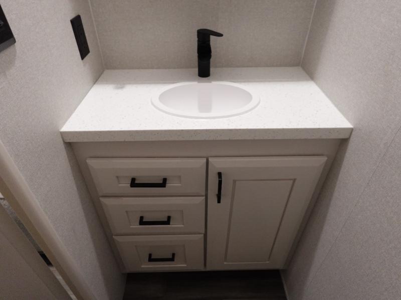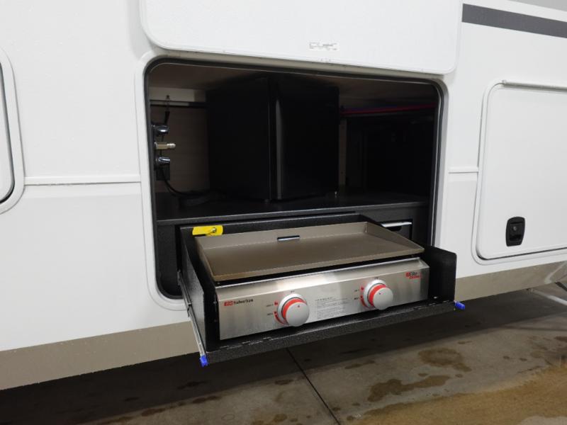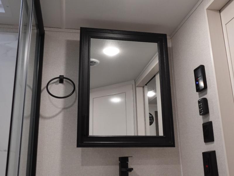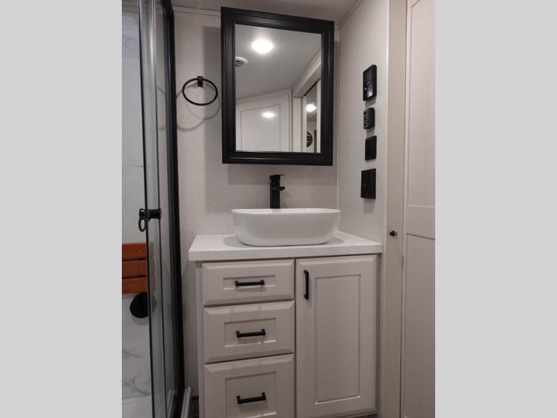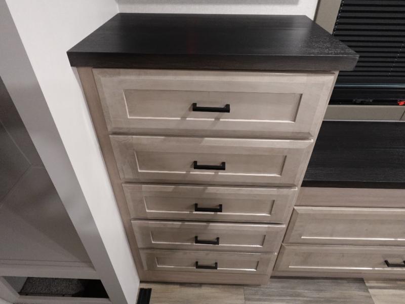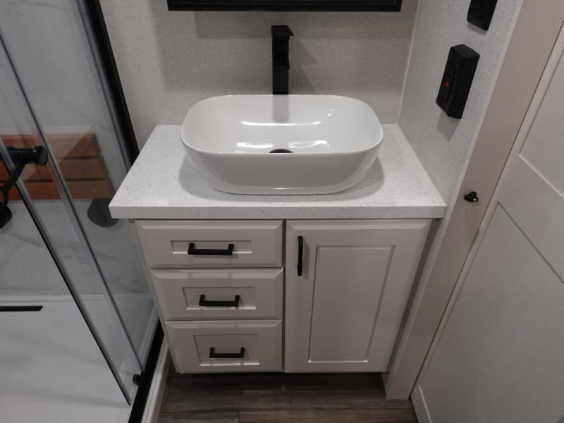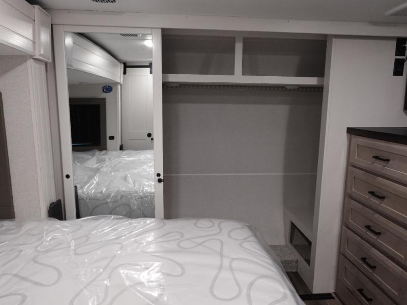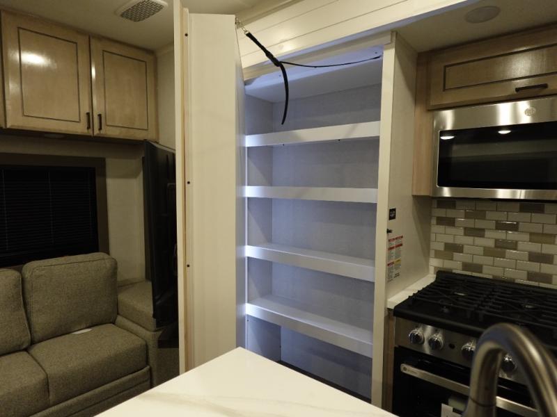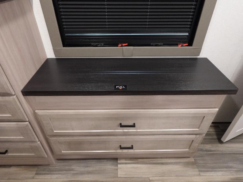 You won't even feel like you are camping in this fifth wheel! The rear living area features theater seats, as well as a tri-fold sofa with adjustable headrests. It's the perfect place to watch a movie with the Smart entertainment HDTV that has Bluetooth, soundbar, and built-in stereo, plus there is a cozy fireplace! The kitchen includes a full suite of GE residential appliances including a 4-burner range, a 21 cu. ft. refrigerator, and an over-the range microwave. Also, standard are a dishwasher and central vacuum system so cleaning up is easy! At night retire to the bedroom with its king bed with power base slide. A second TV lets you watch your favorite shows as you fall asleep. Storage abounds including a full wardrobe and dresser with pull-out top. A dual-entry full bath is easily accessible and includes even more storage with a linen closet. The second bedroom has slide that houses a flip-up bunk above a bi-fold sofa and a desk/dresser with overhead storage, and above it all is a loft for extra sleeping or storage space!
