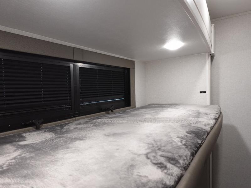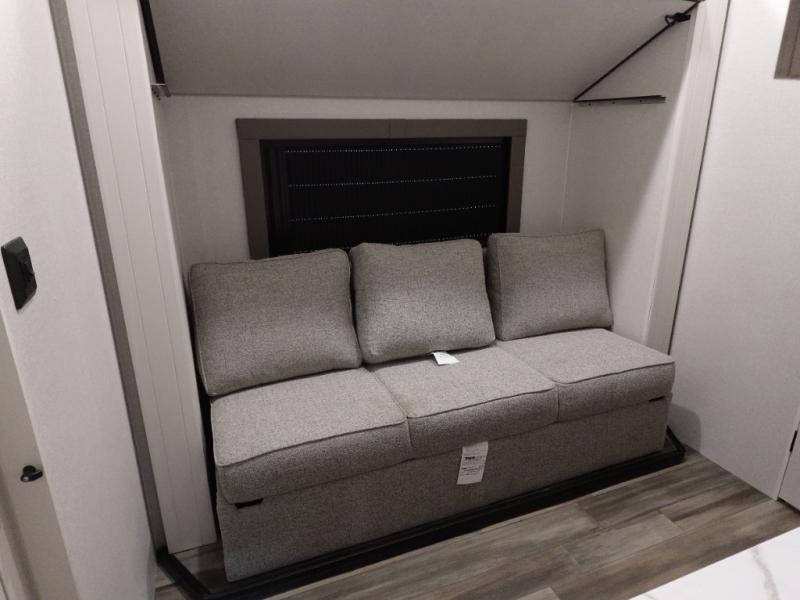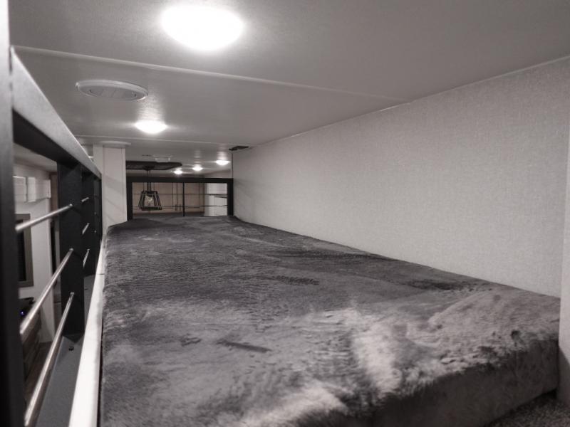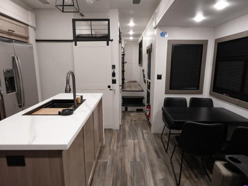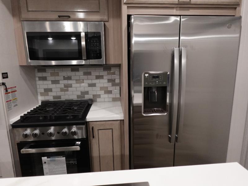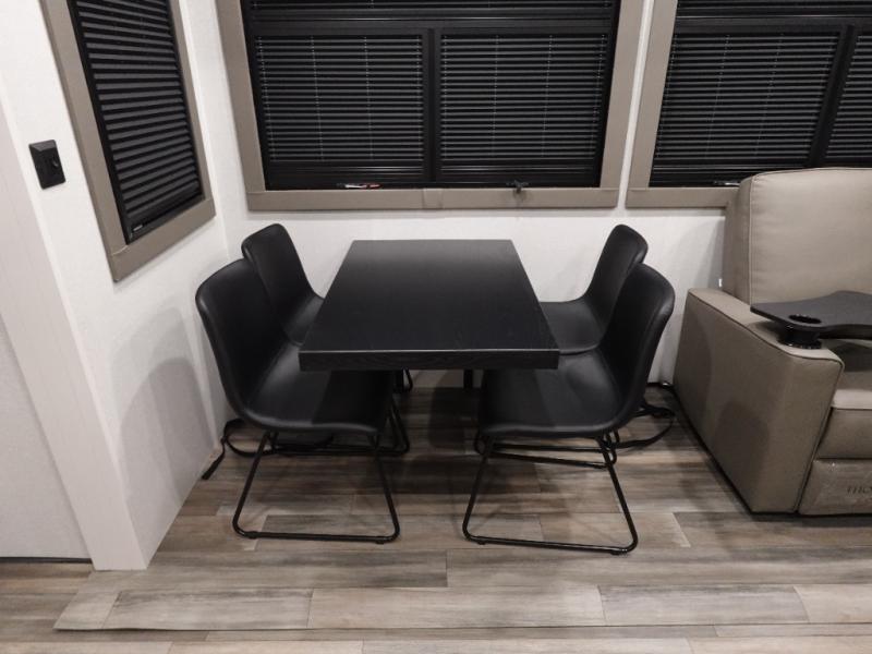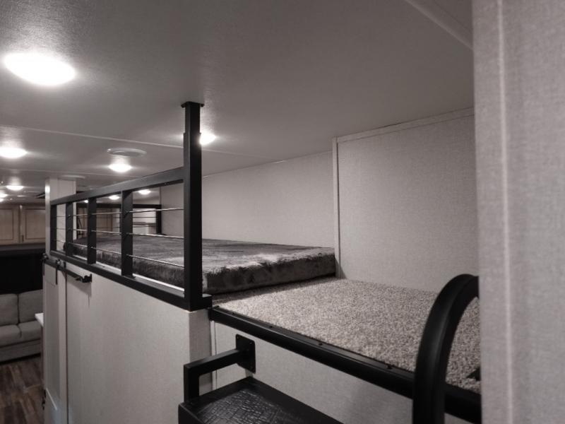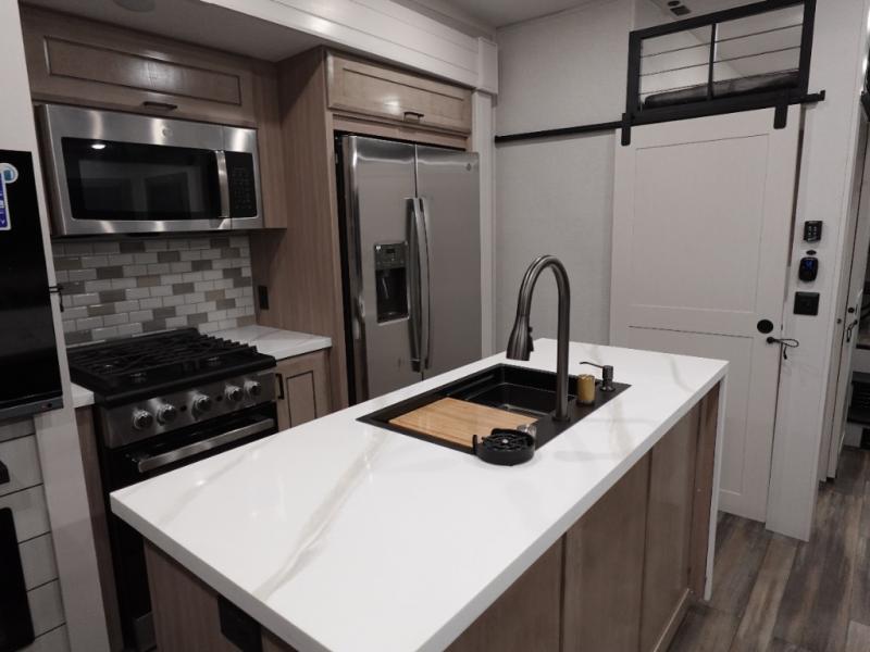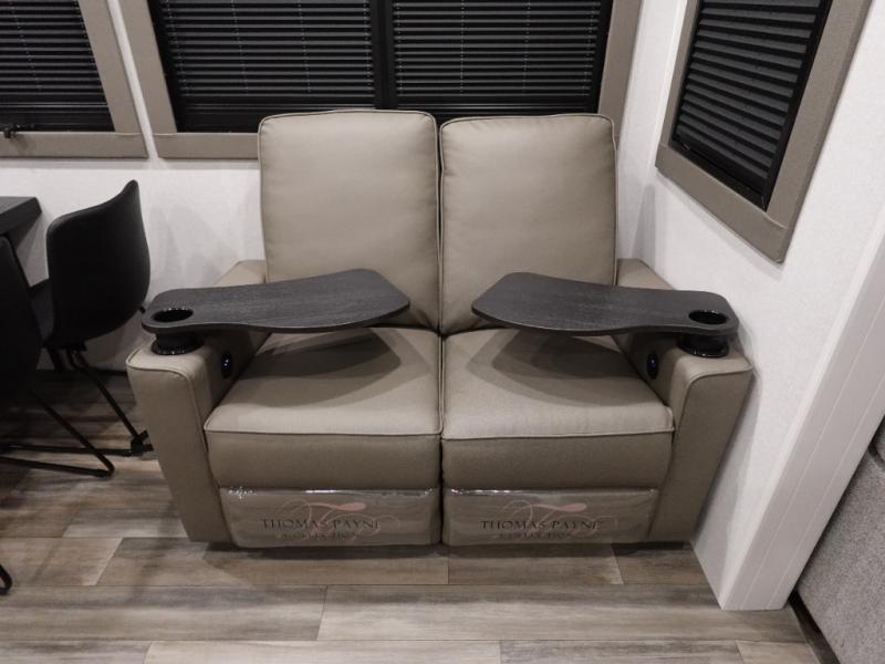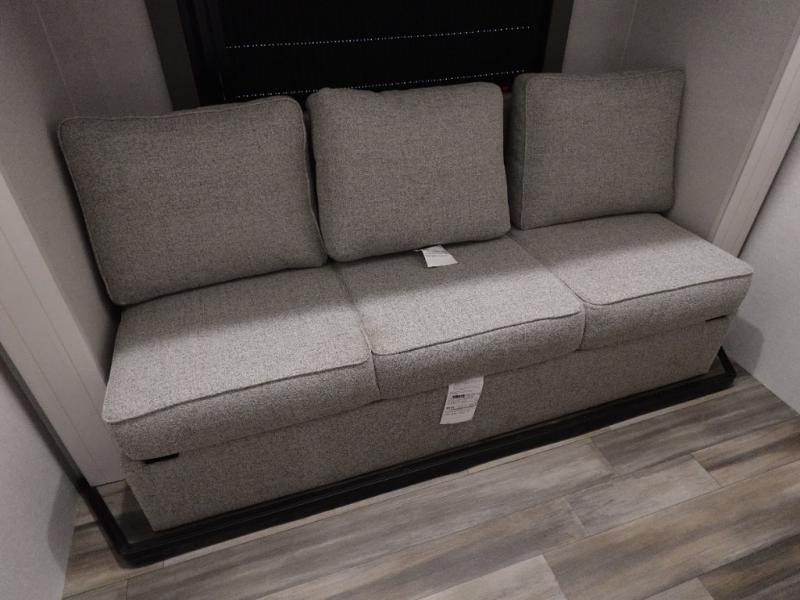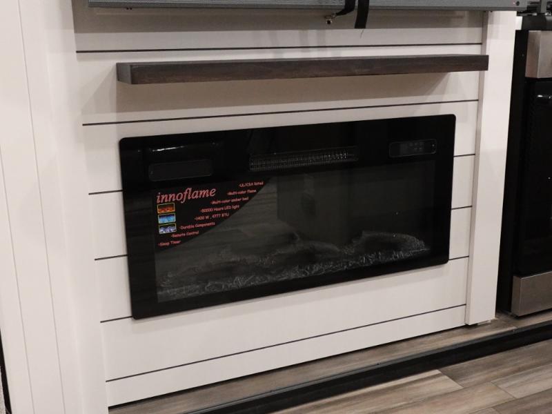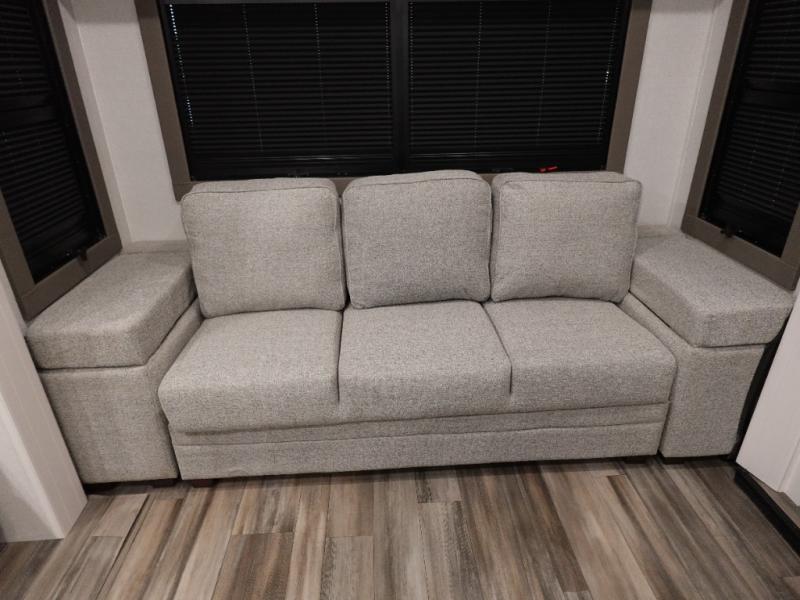 You won't even feel like you are camping in this fifth wheel! The rear living area features theater seats, as well as a tri-fold sofa with adjustable headrests. It's the perfect place to watch a movie with the Smart entertainment HDTV that has Bluetooth, soundbar, and built-in stereo, plus there is a cozy fireplace! The kitchen includes a full suite of GE residential appliances including a 4-burner range, a 21 cu. ft. refrigerator, and an over-the range microwave. Also, standard are a dishwasher and central vacuum system so cleaning up is easy! At night retire to the bedroom with its king bed with power base slide. A second TV lets you watch your favorite shows as you fall asleep. Storage abounds including a full wardrobe and dresser with pull-out top. A dual-entry full bath is easily accessible and includes even more storage with a linen closet. The second bedroom has slide that houses a flip-up bunk above a bi-fold sofa and a desk/dresser with overhead storage, and above it all is a loft for extra sleeping or storage space!