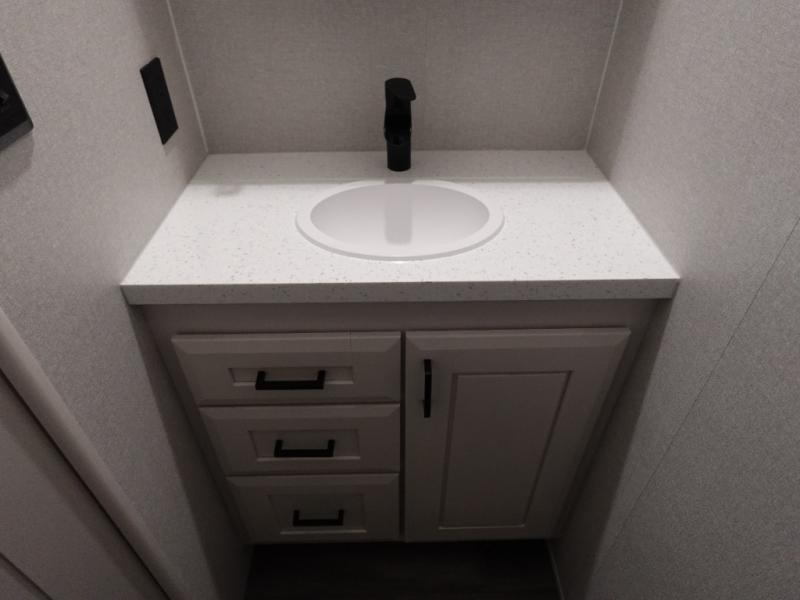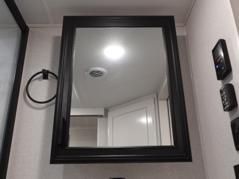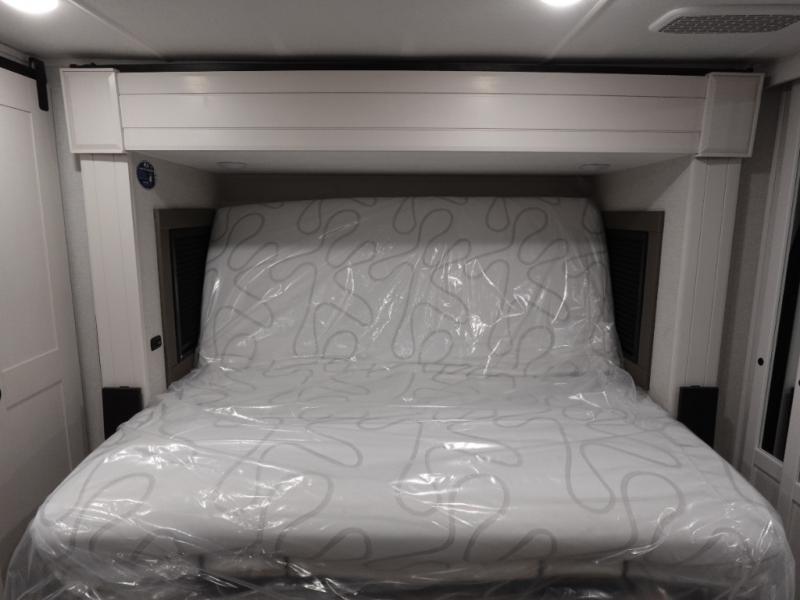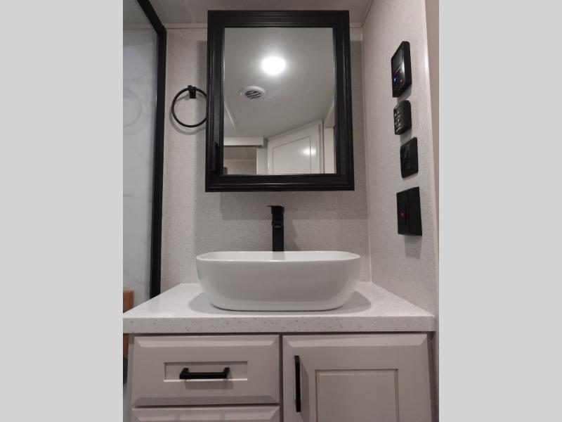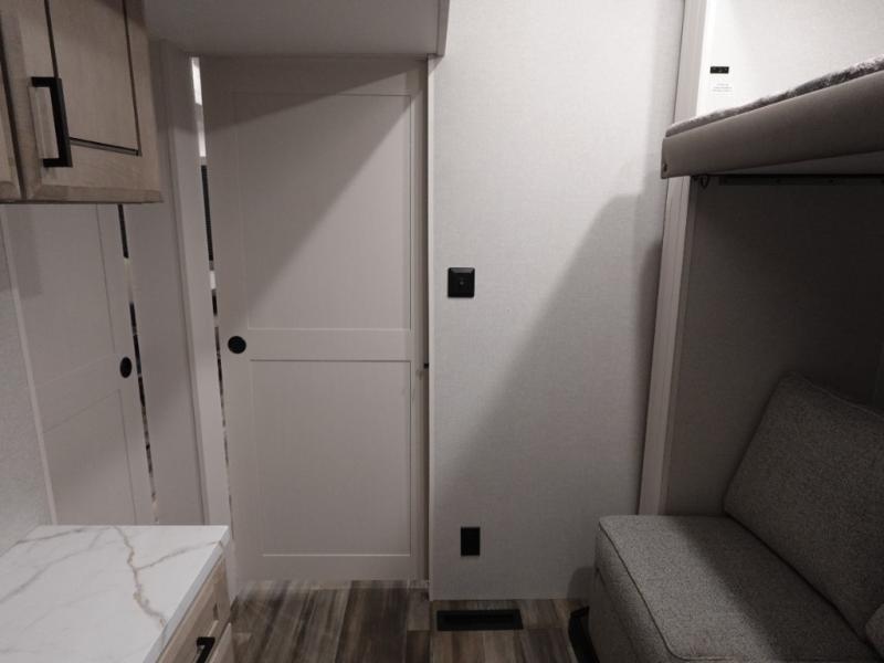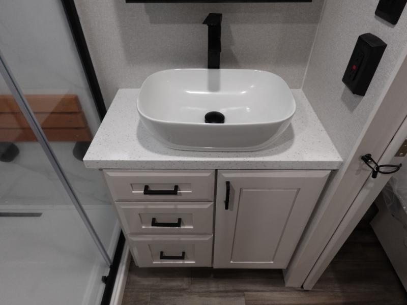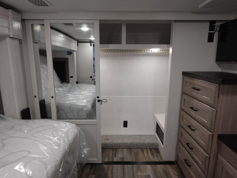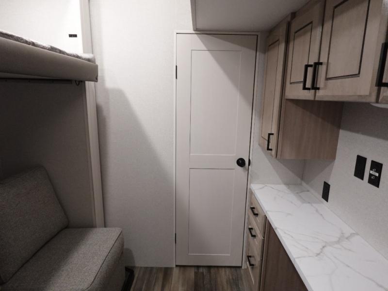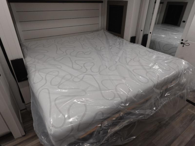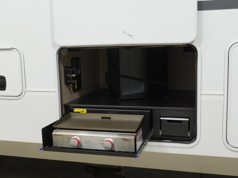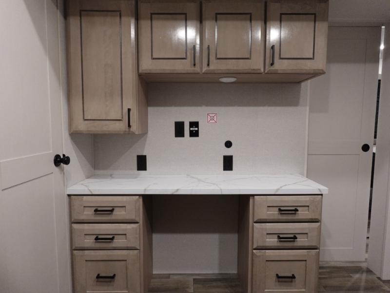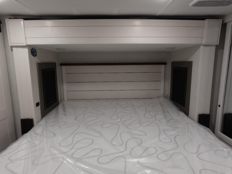 You won't even feel like you are camping in this fifth wheel! The rear living area features theater seats, as well as a tri-fold sofa with adjustable headrests. It's the perfect place to watch a movie with the Smart entertainment HDTV that has Bluetooth, soundbar, and built-in stereo, plus there is a cozy fireplace! The kitchen includes a full suite of GE residential appliances including a 4-burner range, a 21 cu. ft. refrigerator, and an over-the range microwave. Also, standard are a dishwasher and central vacuum system so cleaning up is easy! At night retire to the bedroom with its king bed with power base slide. A second TV lets you watch your favorite shows as you fall asleep. Storage abounds including a full wardrobe and dresser with pull-out top. A dual-entry full bath is easily accessible and includes even more storage with a linen closet. The second bedroom has slide that houses a flip-up bunk above a bi-fold sofa and a desk/dresser with overhead storage, and above it all is a loft for extra sleeping or storage space!
