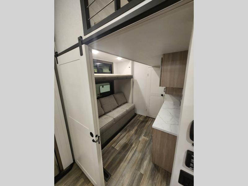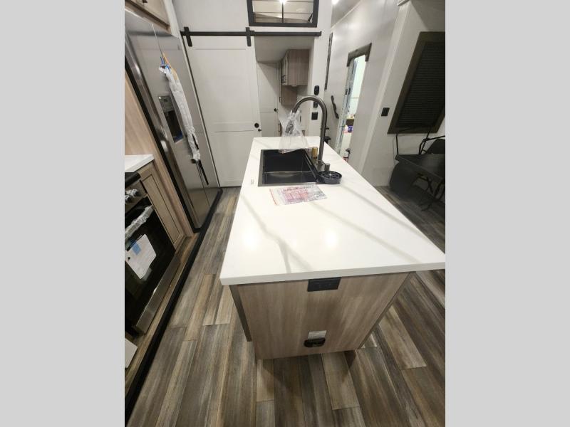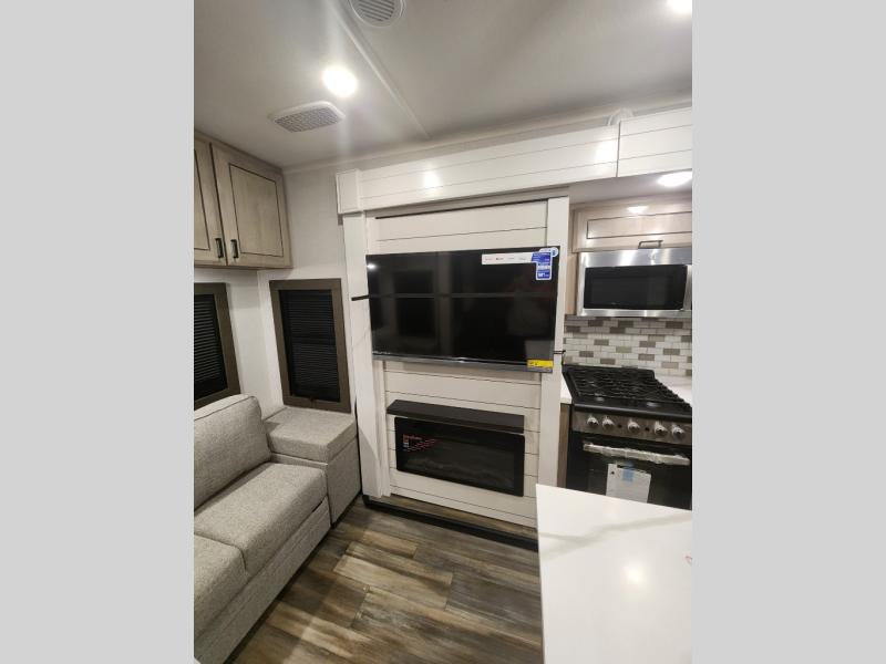 You won't even feel like you are camping in this fifth wheel! The rear living area features theater seats, as well as a tri-fold sofa with adjustable headrests. It's the perfect place to watch a movie with the Smart entertainment HDTV that has Bluetooth, soundbar, and built-in stereo, plus there is a cozy fireplace! The kitchen includes a full suite of GE residential appliances including a 4-burner range, a 21-cu. ft. refrigerator, and an over-the range microwave. Also, standard are a dishwasher and central vacuum system so cleaning up is easy! At night retire to the bedroom with its king bed with power tilt. A second TV lets you watch your favorite shows as you fall asleep. Storage abounds including a full wardrobe and dresser with pull-out top. A dual-entry full bath is easily accessible and includes even more storage with a linen closet. The second bedroom has slide that houses a flip-up bunk above a bi-fold sofa and a desk/dresser with overhead storage, and above it all is a loft for extra sleeping or storage space!