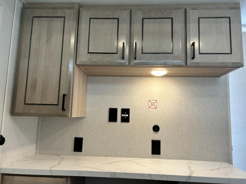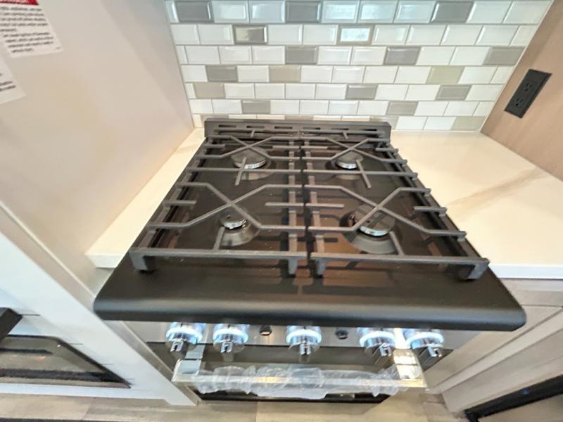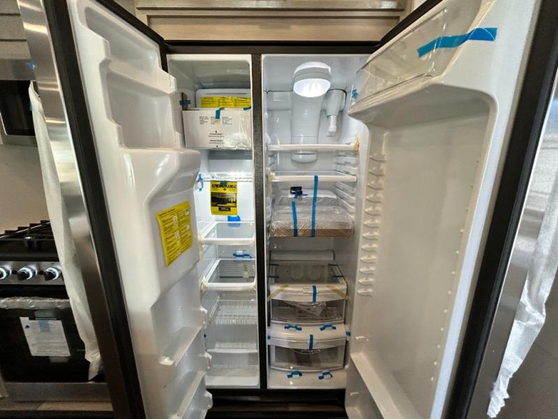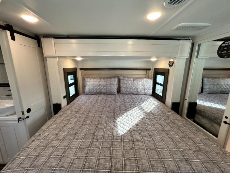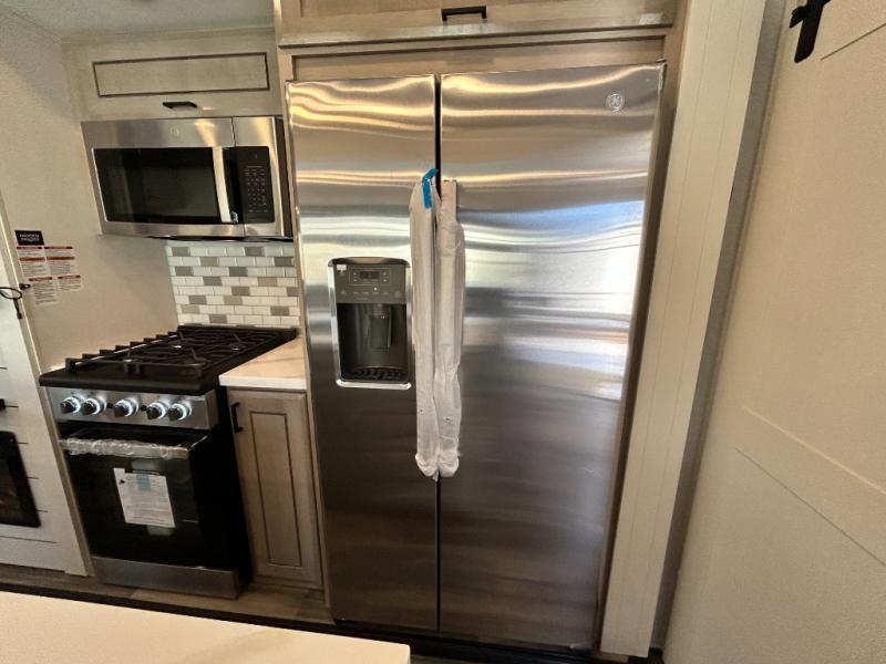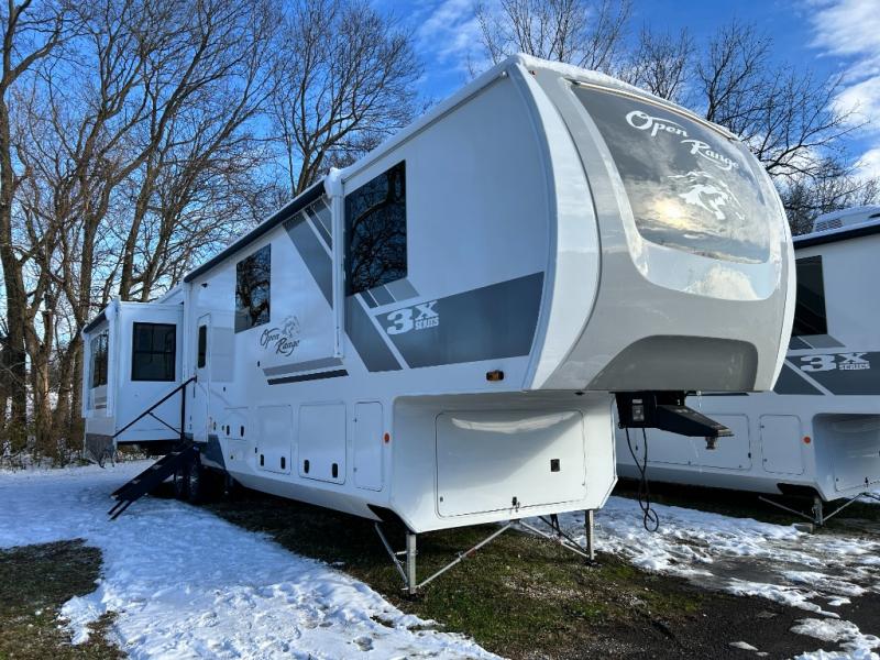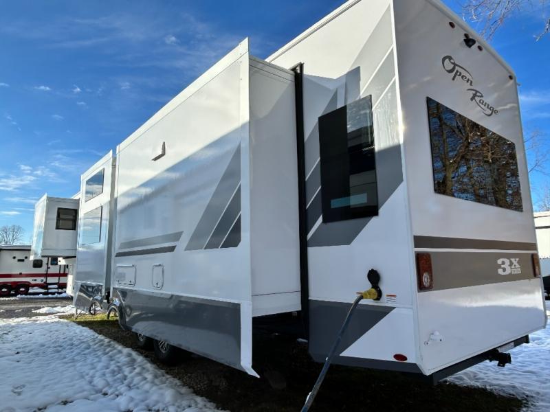 With any Open Range 3X fifth wheel by Open Range RV, you will enjoy residential luxuries and an exceptional build. The TuffShell construction includes vacuum bonded laminated fiberglass and welded aluminum frames for added strength, and the PVC roofing membrane is ultra durable. You can plan to camp year around or go full-time since there is a mandatory Four Season Package that includes a heated and enclosed underbelly, a 40K BTU high-performance furnace, double insulated baggage doors, and more. The residential features continue on with the mandatory Executive Package with the TravelLINK Smart RV system, Keyed-Alike entry and baggage doors, painted fiberglass front cap with LED lighting, and three 15,000 BTU A/C units with quiet residential return air. Inside, you'll enjoy GE kitchen appliances, sleek square windows with integrated blinds, ceramic subway tile backsplash, a glass shower door, and the list of amenities goes on!