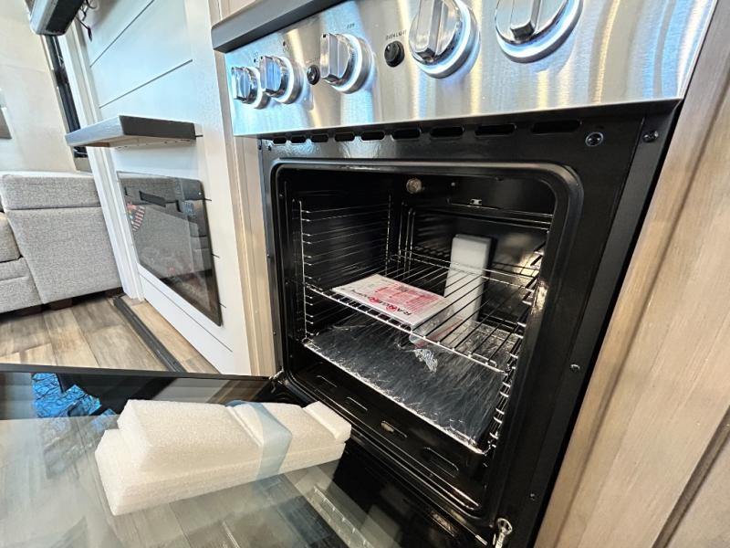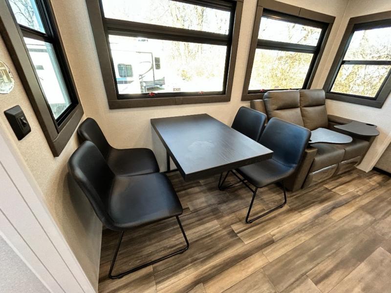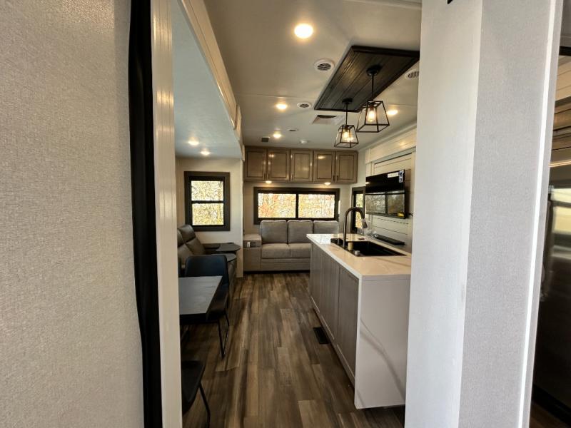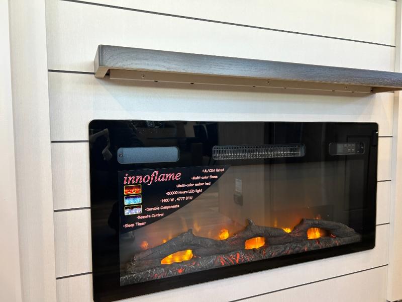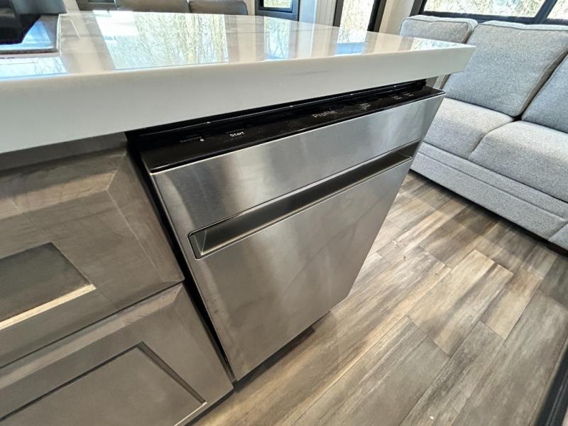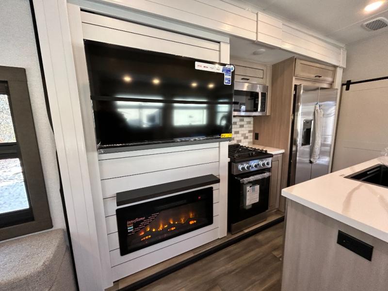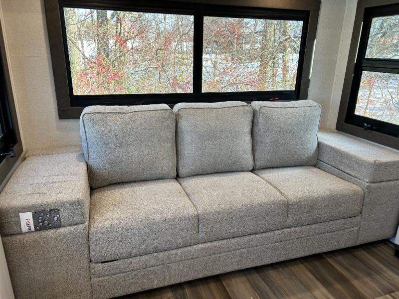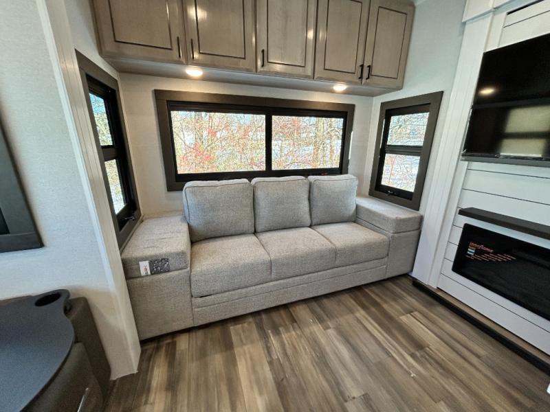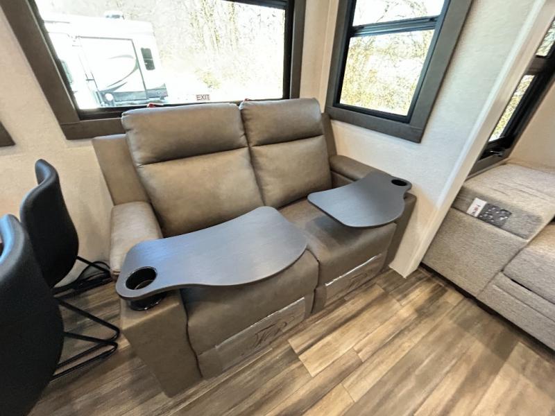 You won't even feel like you are camping in this fifth wheel! The rear living area features theater seats, as well as a tri-fold sofa with adjustable headrests. It's the perfect place to watch a movie with the Smart entertainment HDTV that has Bluetooth, soundbar, and built-in stereo, plus there is a cozy fireplace! The kitchen includes a full suite of GE residential appliances including a 4-burner range, a 21-cu. ft. refrigerator, and an over-the range microwave. Also, standard are a dishwasher and central vacuum system so cleaning up is easy! At night retire to the bedroom with its king bed with power tilt. A second TV lets you watch your favorite shows as you fall asleep. Storage abounds including a full wardrobe and dresser with pull-out top. A dual-entry full bath is easily accessible and includes even more storage with a linen closet. The second bedroom has slide that houses a flip-up bunk above a bi-fold sofa and a desk/dresser with overhead storage, and above it all is a loft for extra sleeping or storage space!