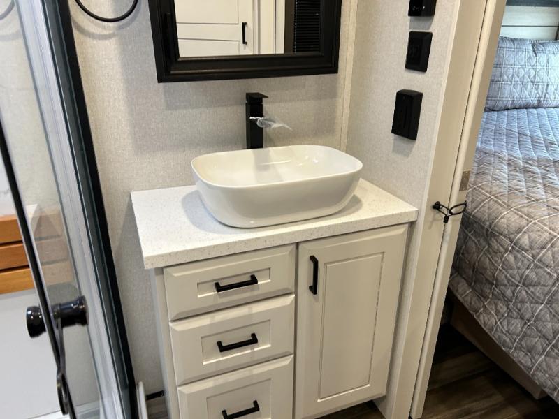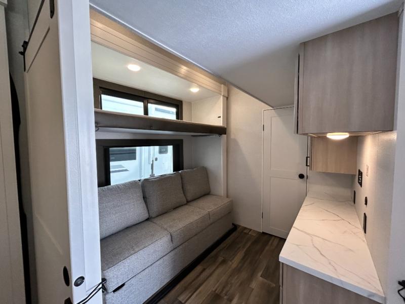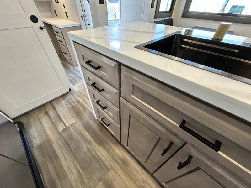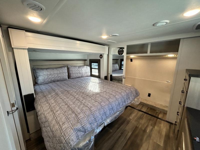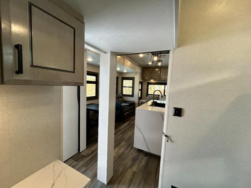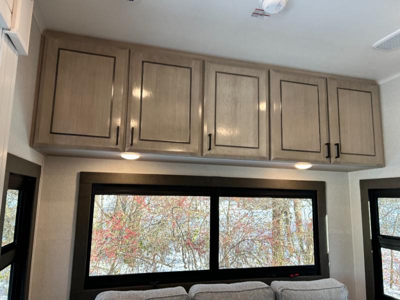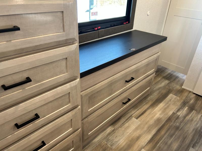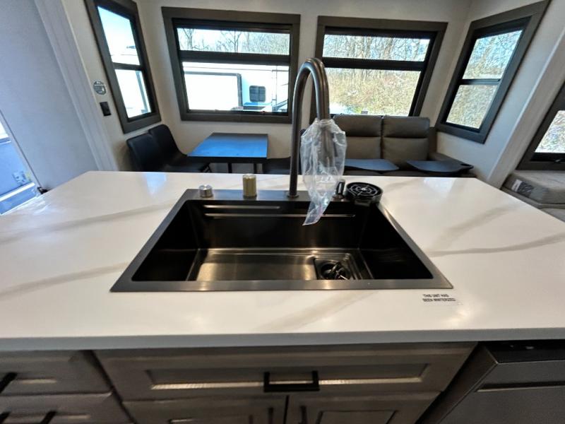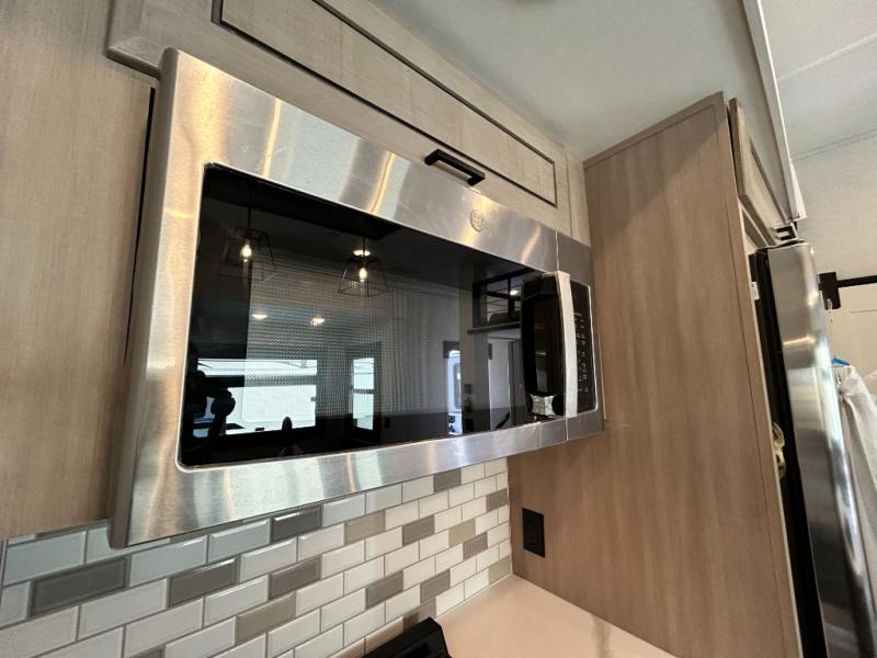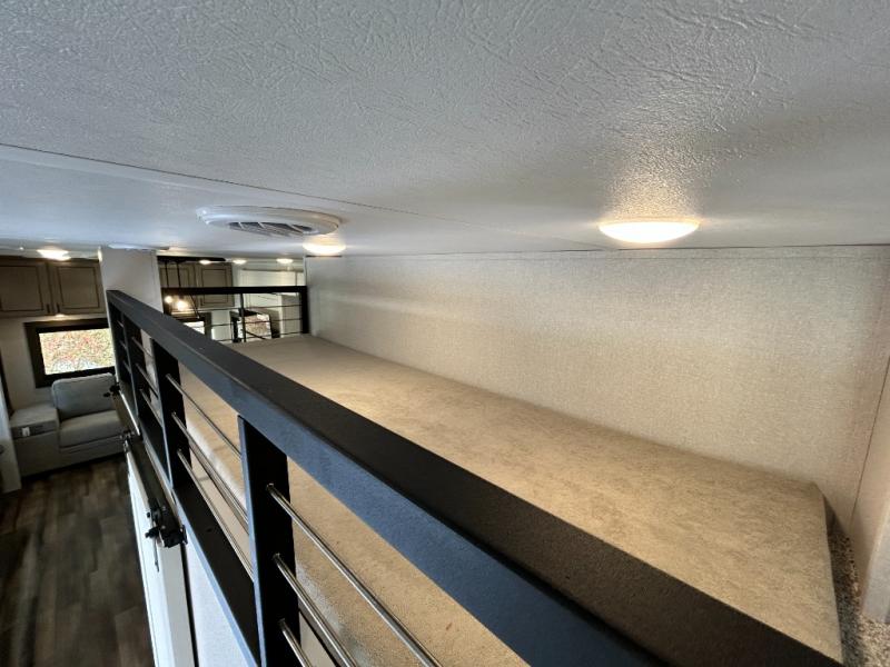 You won't even feel like you are camping in this fifth wheel! The rear living area features theater seats, as well as a tri-fold sofa with adjustable headrests. It's the perfect place to watch a movie with the Smart entertainment HDTV that has Bluetooth, soundbar, and built-in stereo, plus there is a cozy fireplace! The kitchen includes a full suite of GE residential appliances including a 4-burner range, a 21-cu. ft. refrigerator, and an over-the range microwave. Also, standard are a dishwasher and central vacuum system so cleaning up is easy! At night retire to the bedroom with its king bed with power tilt. A second TV lets you watch your favorite shows as you fall asleep. Storage abounds including a full wardrobe and dresser with pull-out top. A dual-entry full bath is easily accessible and includes even more storage with a linen closet. The second bedroom has slide that houses a flip-up bunk above a bi-fold sofa and a desk/dresser with overhead storage, and above it all is a loft for extra sleeping or storage space!