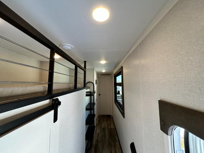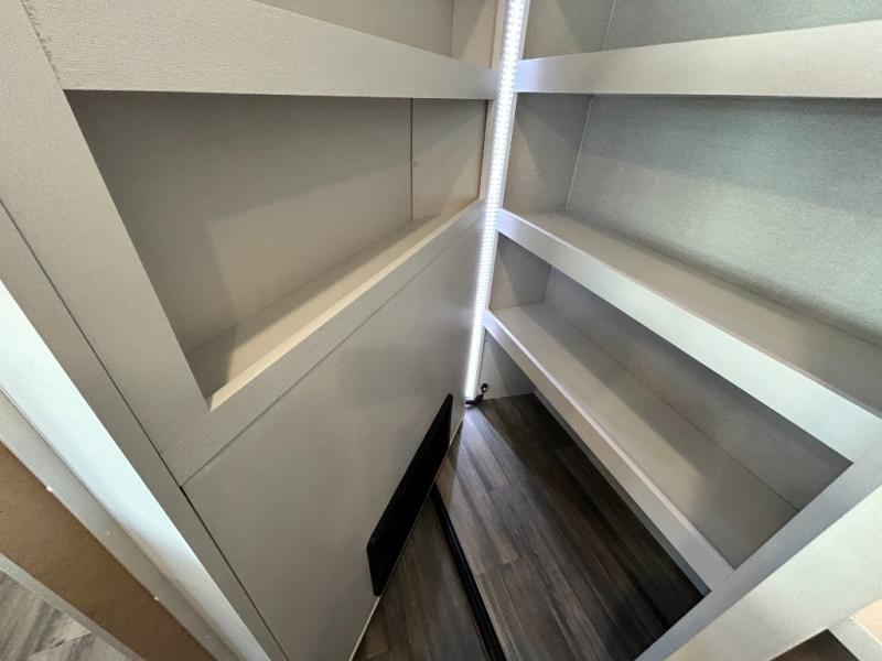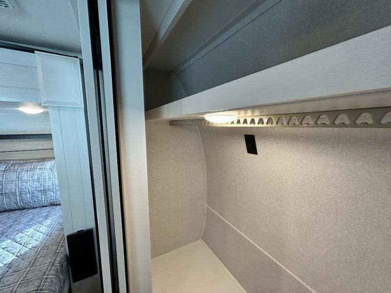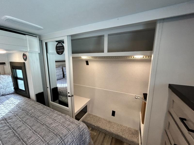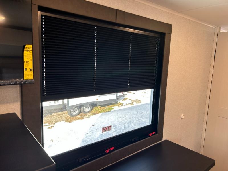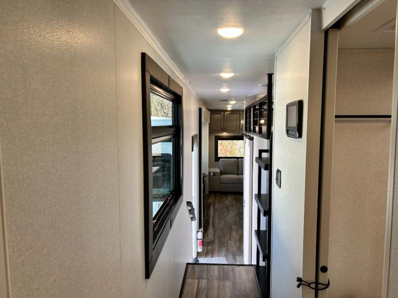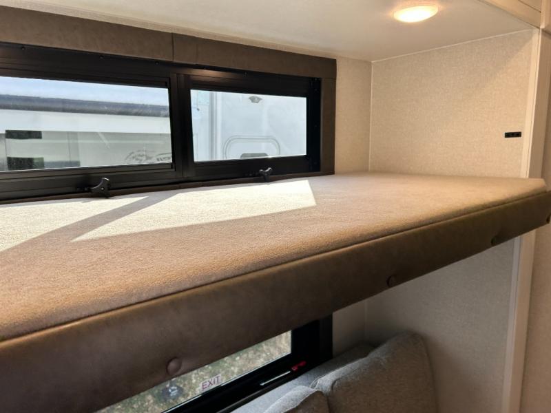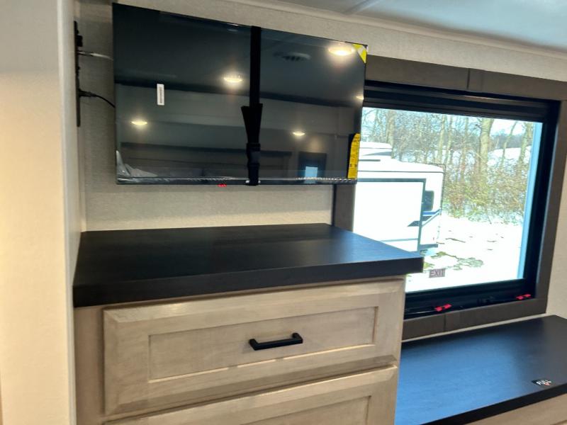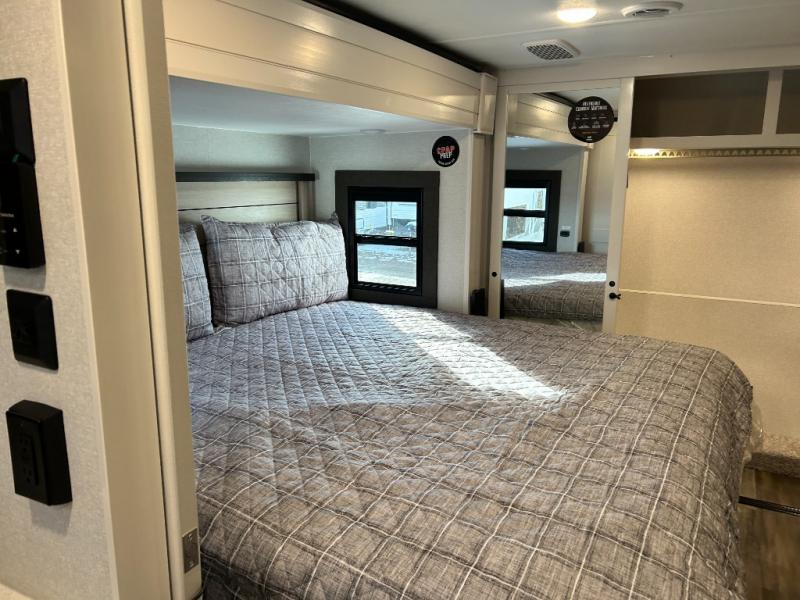 You won't even feel like you are camping in this fifth wheel! The rear living area features theater seats, as well as a tri-fold sofa with adjustable headrests. It's the perfect place to watch a movie with the Smart entertainment HDTV that has Bluetooth, soundbar, and built-in stereo, plus there is a cozy fireplace! The kitchen includes a full suite of GE residential appliances including a 4-burner range, a 21-cu. ft. refrigerator, and an over-the range microwave. Also, standard are a dishwasher and central vacuum system so cleaning up is easy! At night retire to the bedroom with its king bed with power tilt. A second TV lets you watch your favorite shows as you fall asleep. Storage abounds including a full wardrobe and dresser with pull-out top. A dual-entry full bath is easily accessible and includes even more storage with a linen closet. The second bedroom has slide that houses a flip-up bunk above a bi-fold sofa and a desk/dresser with overhead storage, and above it all is a loft for extra sleeping or storage space!