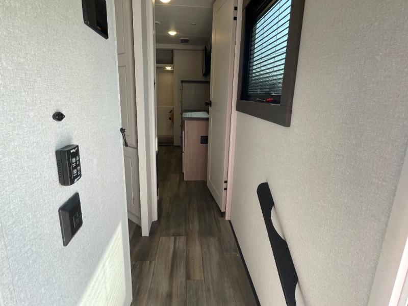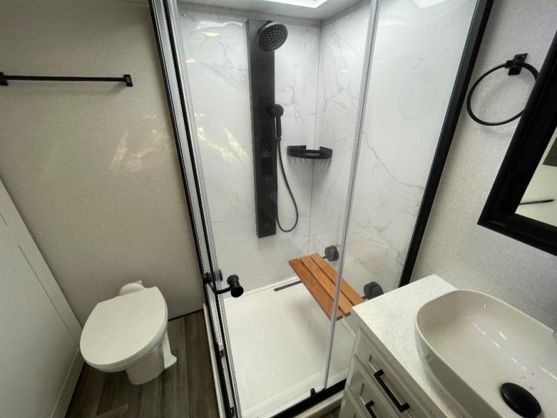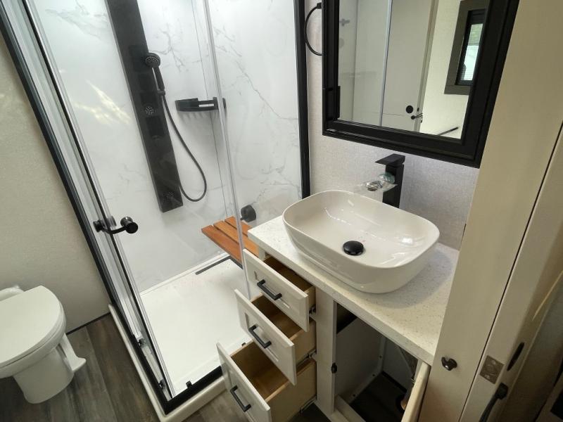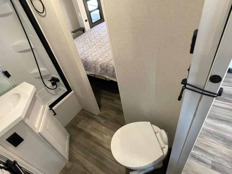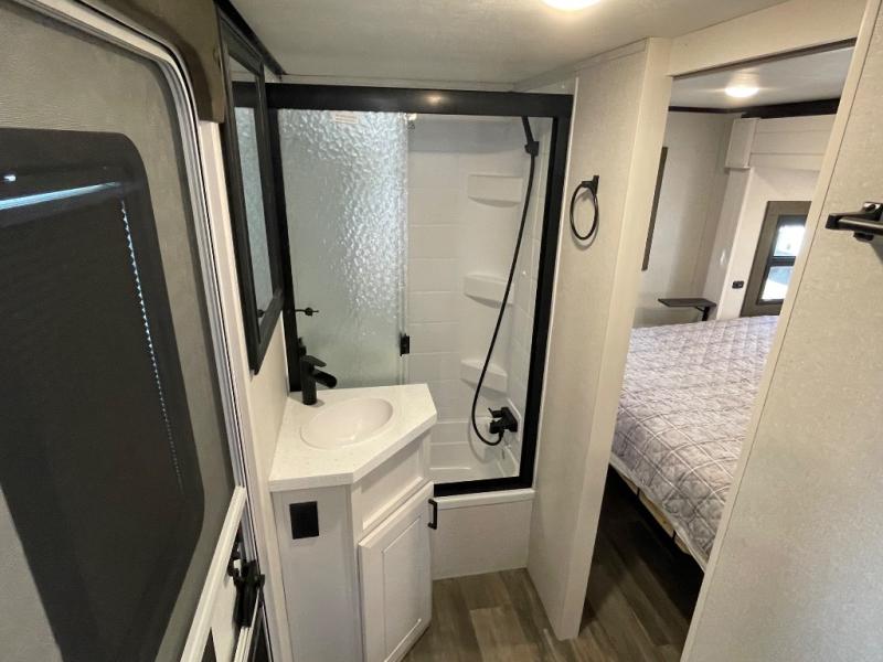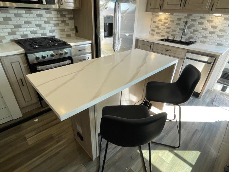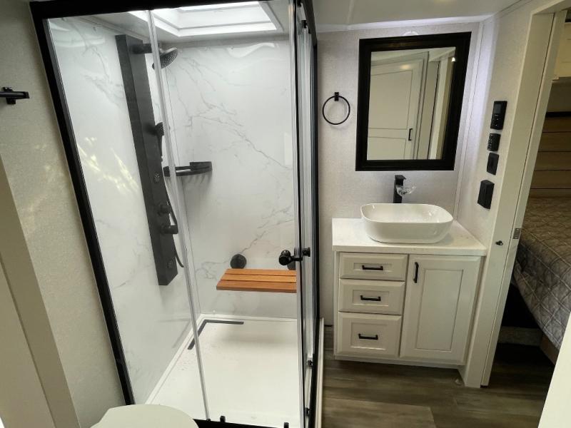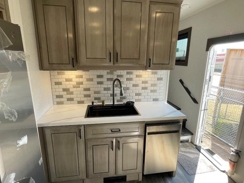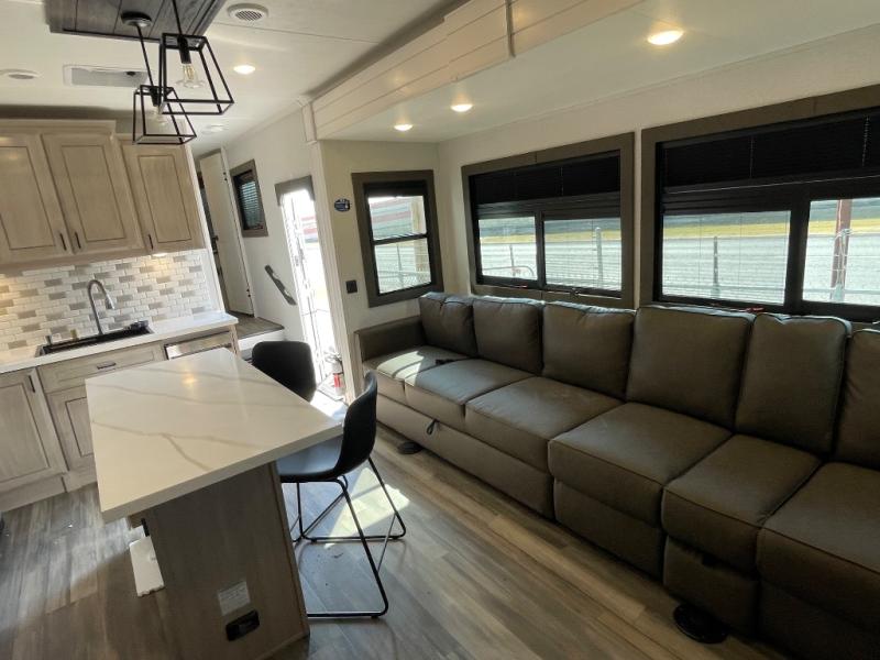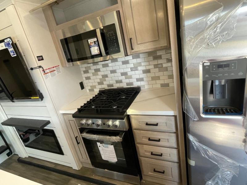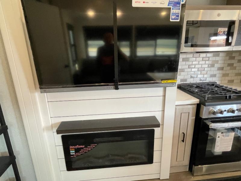 With any Open Range 3X fifth wheel by Highland Ridge, you will enjoy residential luxuries and an exceptional build. The TuffShell construction includes vacuum bonded laminated fiberglass and welded aluminum frames for added strength, and the PVC roofing membrane is ultra durable. You can plan to camp year around or go full-time since there is a mandatory Four Season Package that includes a heated and enclosed underbelly, a 40K BTU high-performance furnace, double insulated baggage doors, and more. The residential features continue on with the mandatory Executive Package with the TravelLINK Smart RV system, Keyed-Alike entry and baggage doors, painted fiberglass front cap with LED lighting, and three 15,000 BTU A/C units with quiet residential return air. Inside, you'll enjoy GE Profile kitchen appliances, sleek square windows with integrated blinds, ceramic subway tile backsplash, a glass shower door, and the list of amenities goes on!