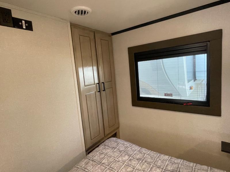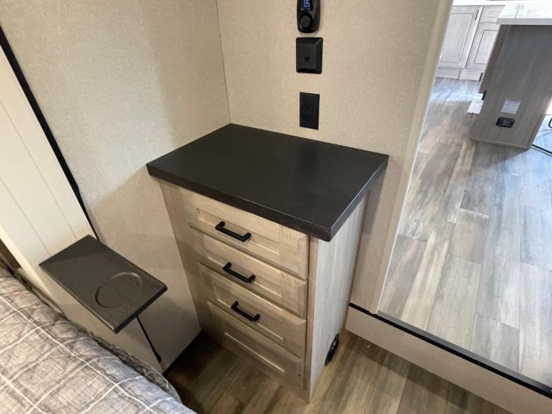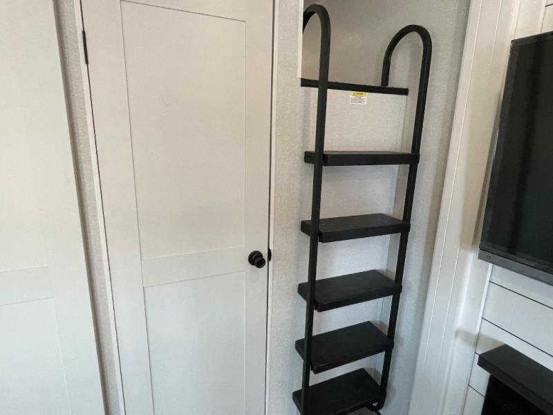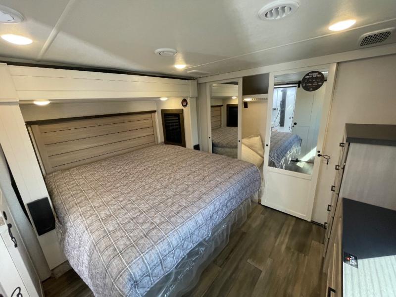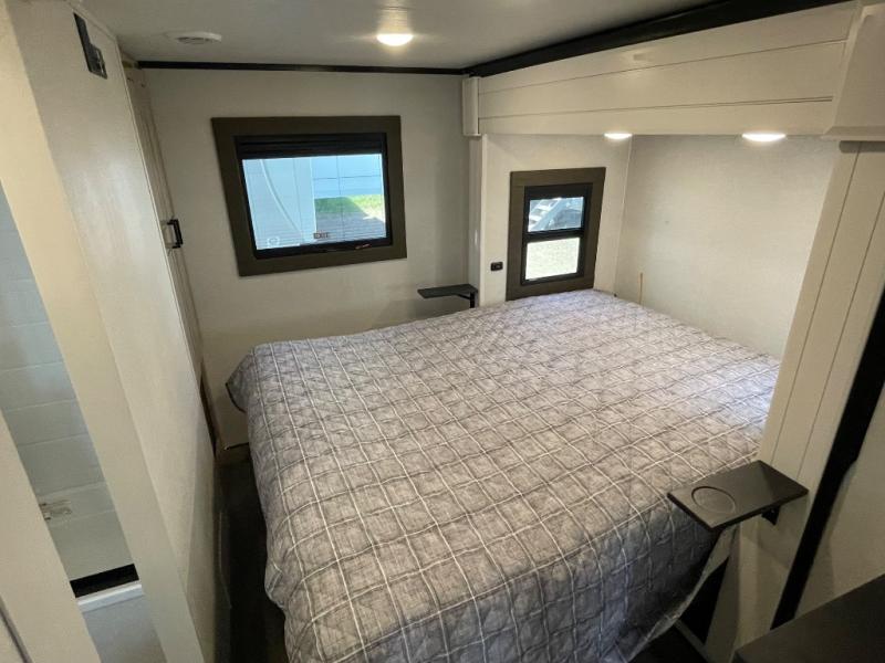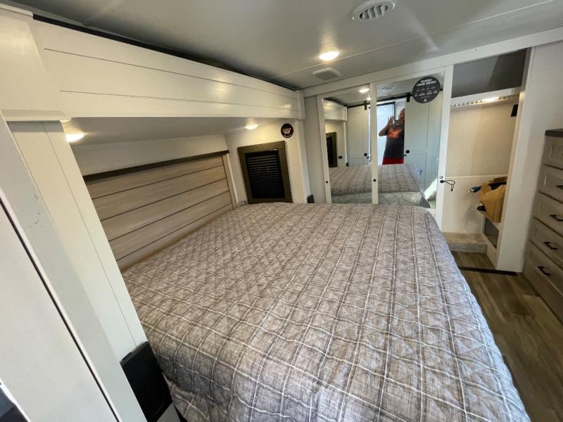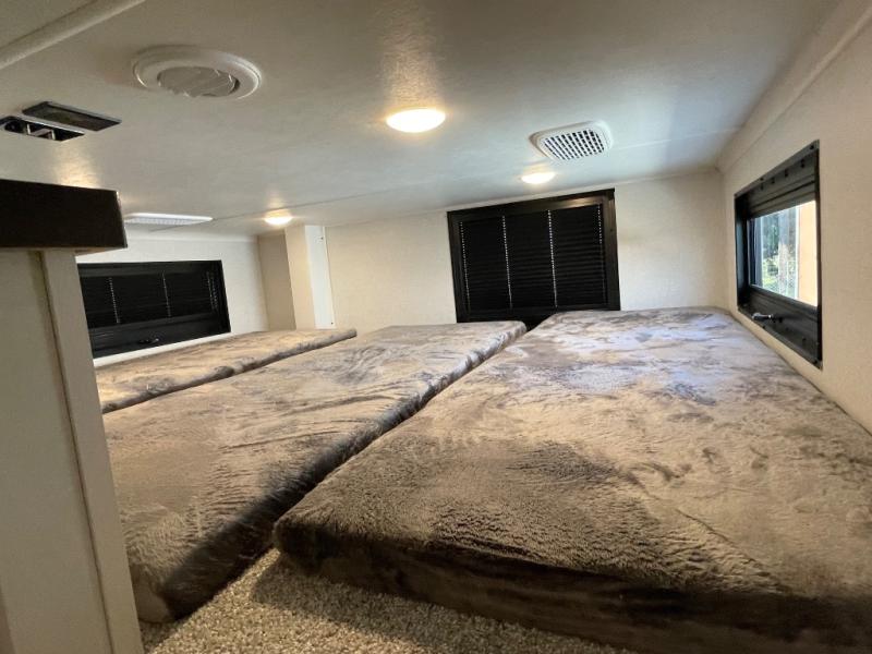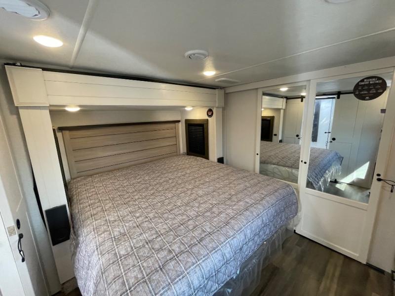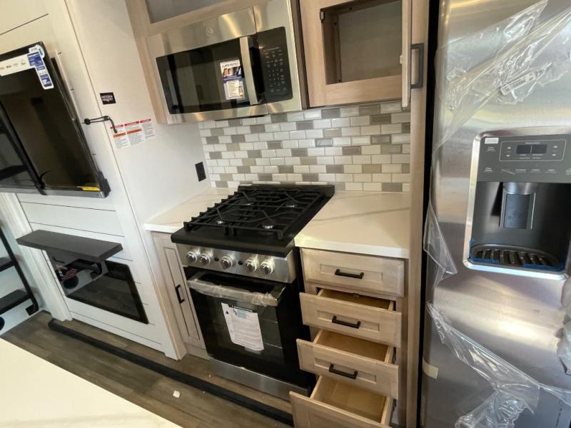 If you enjoy luxury camping or you're looking for a residential fifth wheel to go full-time in, this Open Range 3X is the one! The middle kitchen and living room is made open by the dual opposing slides, and your crew can get comfortable on the mega lounge with two tables. The chef of your group will love cooking on GE free-standing four burner range, or they can use the GE residential microwave to heat up leftovers. The standard dishwasher and central vacuum make cleanup a breeze. A waterfall island with four chairs will provide a place to dine and the hidden pantry behind the swing-out entertainment center can hold snacks galore. There is also a fireplace and smart HDTV to make movie nights cozy. The front master bedroom includes a slide out king bed with a power base, two dressers, a large front closet, and a 32" TV to watch shows in bed. You even have your own entrance into the full bath, plus washer and dryer prep if you choose to add those appliances. The rear master bedroom is just as accommodating with a queen bed slide out, a wardrobe and a dresser, plus a second full bath with its own exterior entry door. And the loft above the rear bedroom provides even more sleeping space.