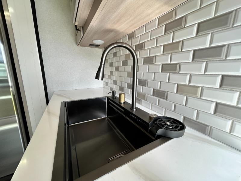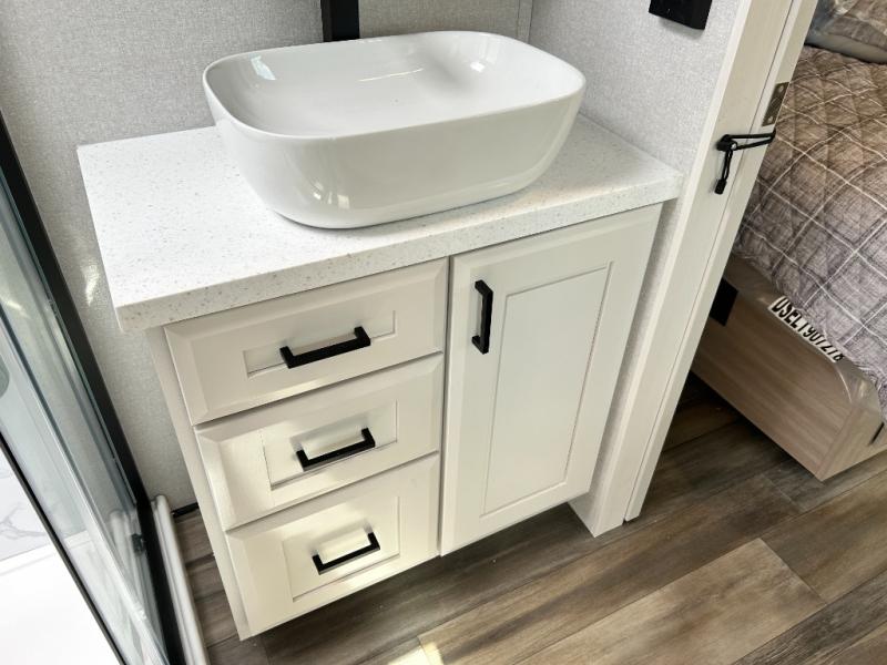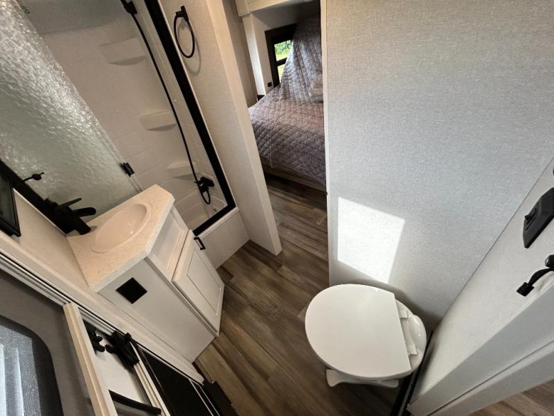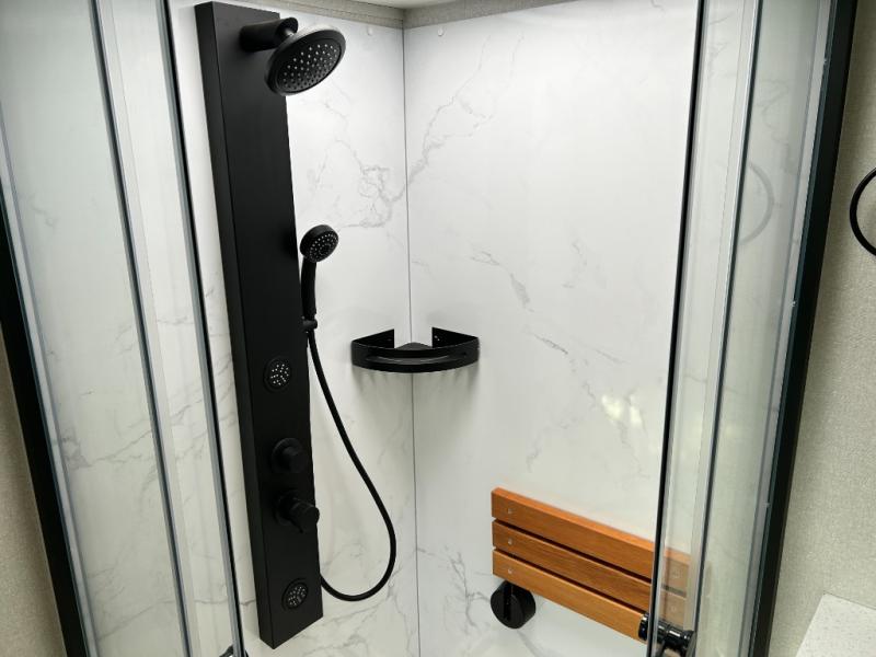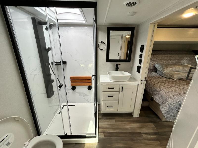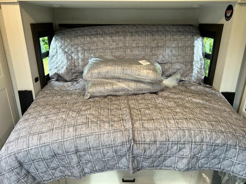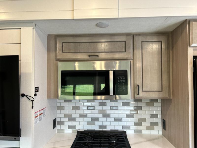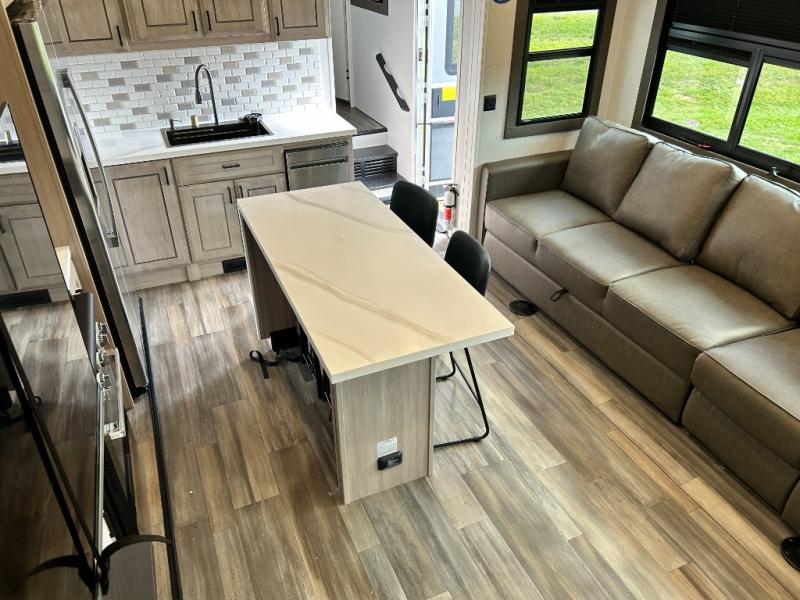 With any Open Range 3X fifth wheel by Open Range RV, you will enjoy residential luxuries and an exceptional build. The TuffShell construction includes vacuum bonded laminated fiberglass and welded aluminum frames for added strength, and the PVC roofing membrane is ultra durable. You can plan to camp year around or go full-time since there is a mandatory Four Season Package that includes a heated and enclosed underbelly, a 40K BTU high-performance furnace, double insulated baggage doors, and more. The residential features continue on with the mandatory Executive Package with the TravelLINK Smart RV system, Keyed-Alike entry and baggage doors, painted fiberglass front cap with LED lighting, and three 15,000 BTU A/C units with quiet residential return air. Inside, you'll enjoy GE kitchen appliances, sleek square windows with integrated blinds, ceramic subway tile backsplash, a glass shower door, and the list of amenities goes on!