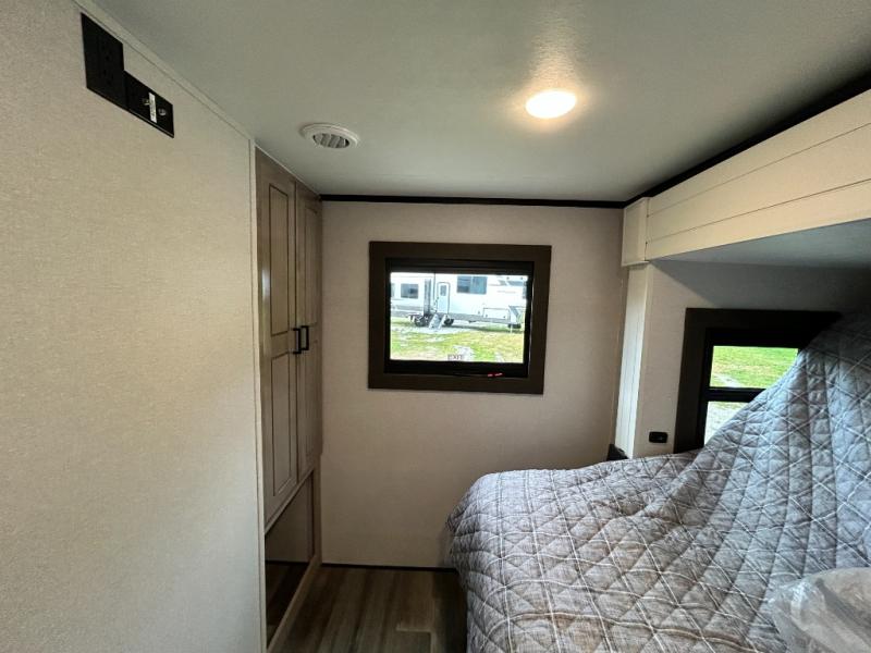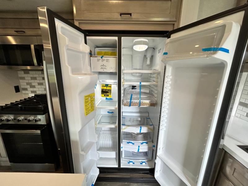 If you enjoy luxury camping or you're looking for a residential fifth wheel to go full-time in, this Open Range 3X is the one! The middle kitchen and living room is made open by the dual opposing slides, and your crew can get comfortable on the mega lounge with two tables. The chef of your group will love cooking on GE free-standing four burner range, or they can use the GE residential microwave to heat up leftovers. The standard dishwasher and central vacuum make cleanup a breeze. A waterfall island with four chairs will provide a place to dine and the hidden pantry behind the swing-out entertainment center can hold snacks galore. There is also a fireplace and smart HDTV to make movie nights cozy. The front master bedroom includes a slide out king bed with a power tilt, two dressers, a large front closet, and a 32" TV to watch shows in bed. You even have your own entrance into the full bath, plus washer and dryer prep if you choose to add those appliances. The rear master bedroom is just as accommodating with a queen bed slide out, a wardrobe and a dresser, plus a second full bath with its own exterior entry door. And the loft above the rear bedroom provides even more sleeping space.