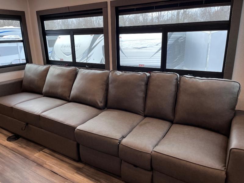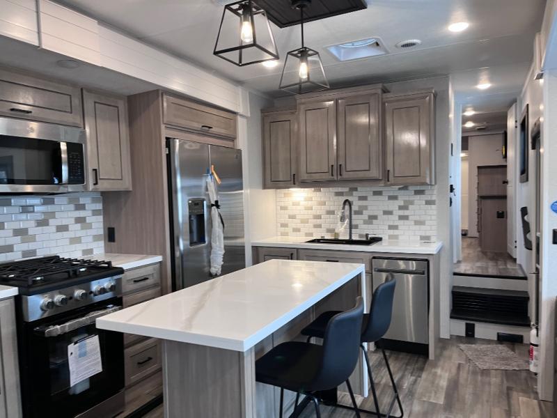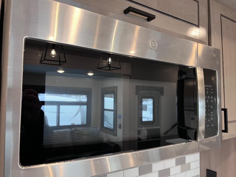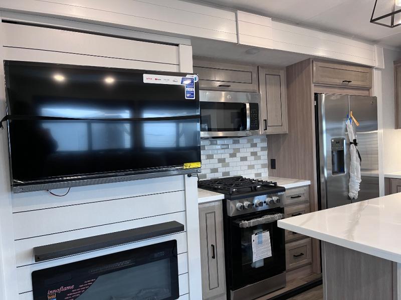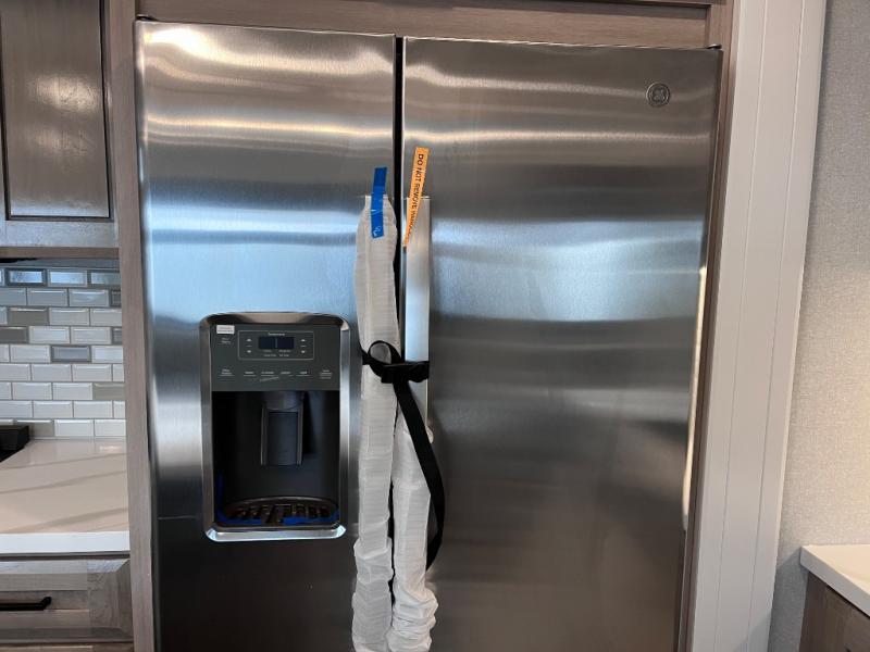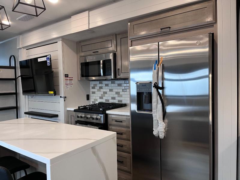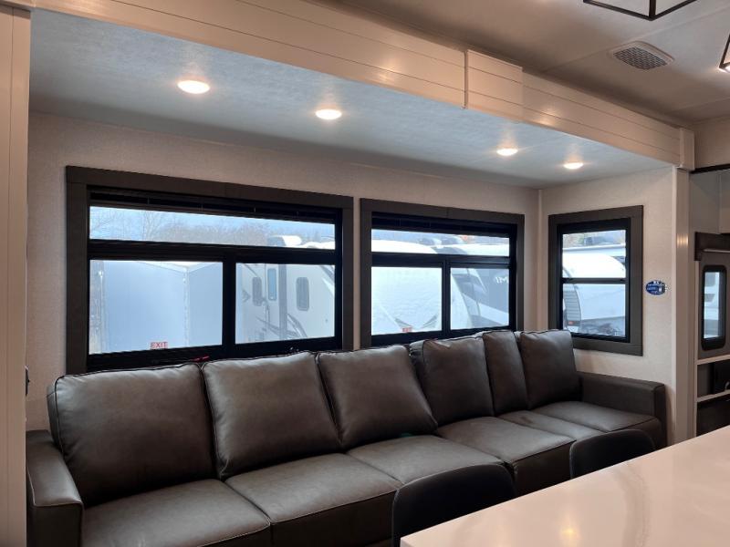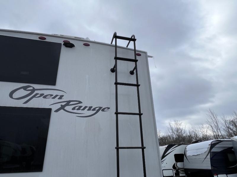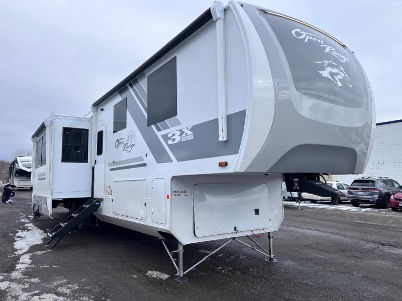 With any Open Range 3X fifth wheel by Open Range RV, you will enjoy residential luxuries and an exceptional build. The TuffShell construction includes vacuum bonded laminated fiberglass and welded aluminum frames for added strength, and the PVC roofing membrane is ultra durable. You can plan to camp year around or go full-time since there is a mandatory Four Season Package that includes a heated and enclosed underbelly, a 40K BTU high-performance furnace, double insulated baggage doors, and more. The residential features continue on with the mandatory Executive Package with the TravelLINK Smart RV system, Keyed-Alike entry and baggage doors, painted fiberglass front cap with LED lighting, and three 15,000 BTU A/C units with quiet residential return air. Inside, you'll enjoy GE kitchen appliances, sleek square windows with integrated blinds, ceramic subway tile backsplash, a glass shower door, and the list of amenities goes on!