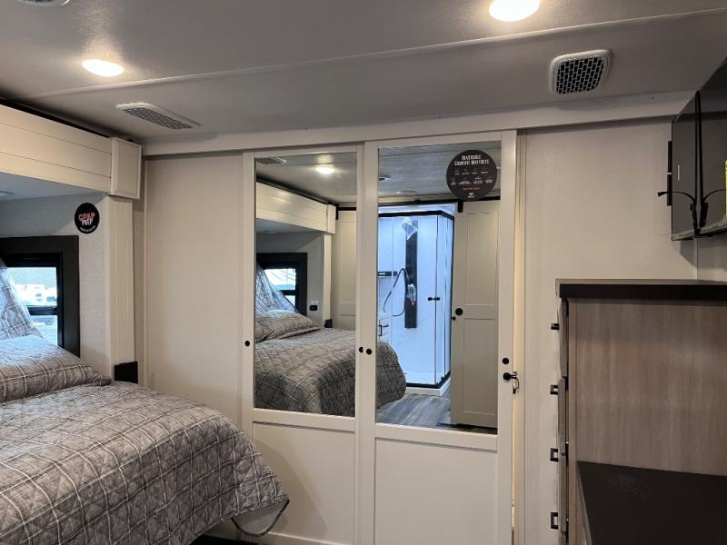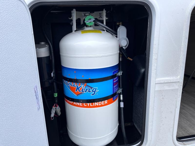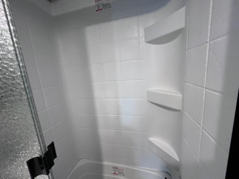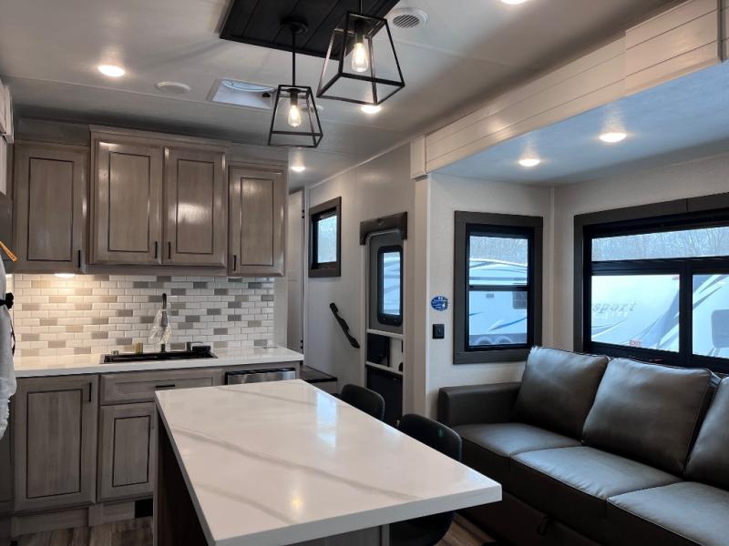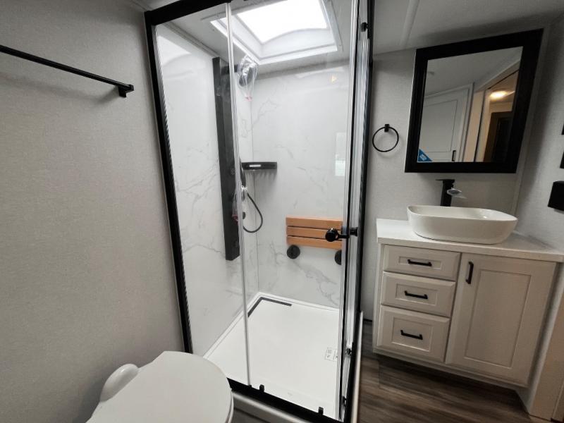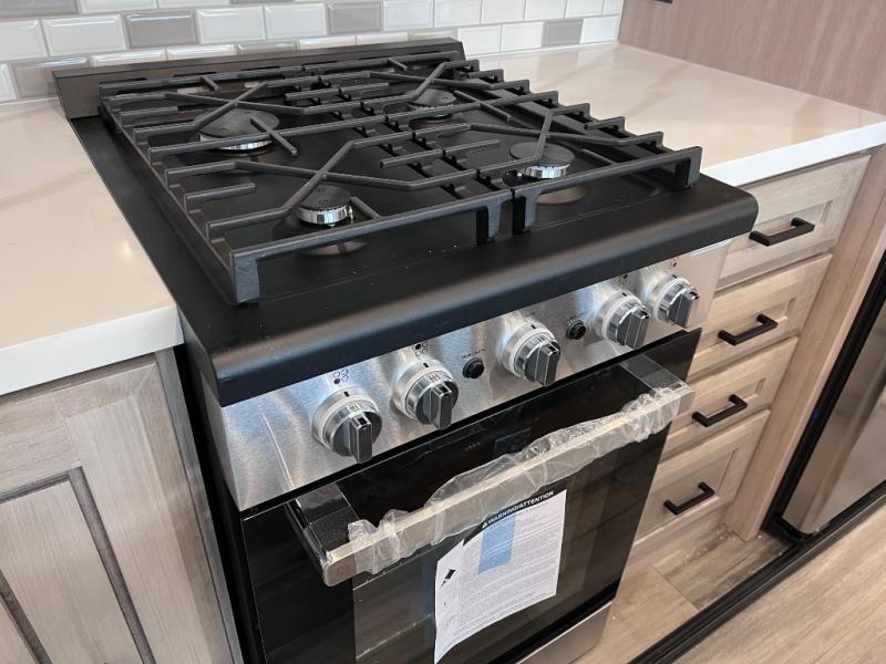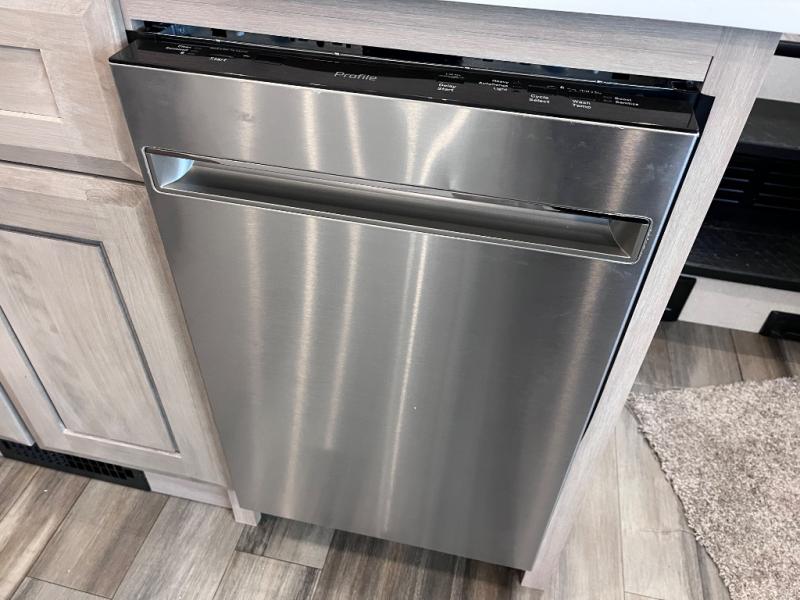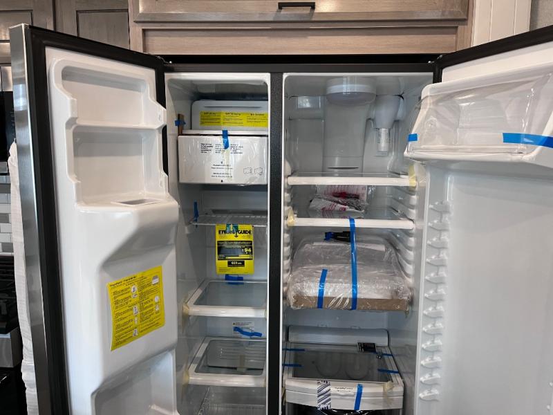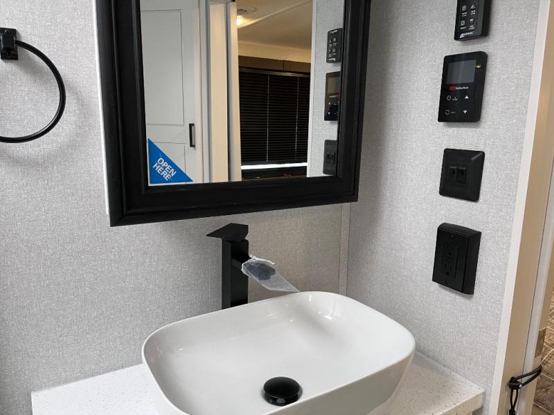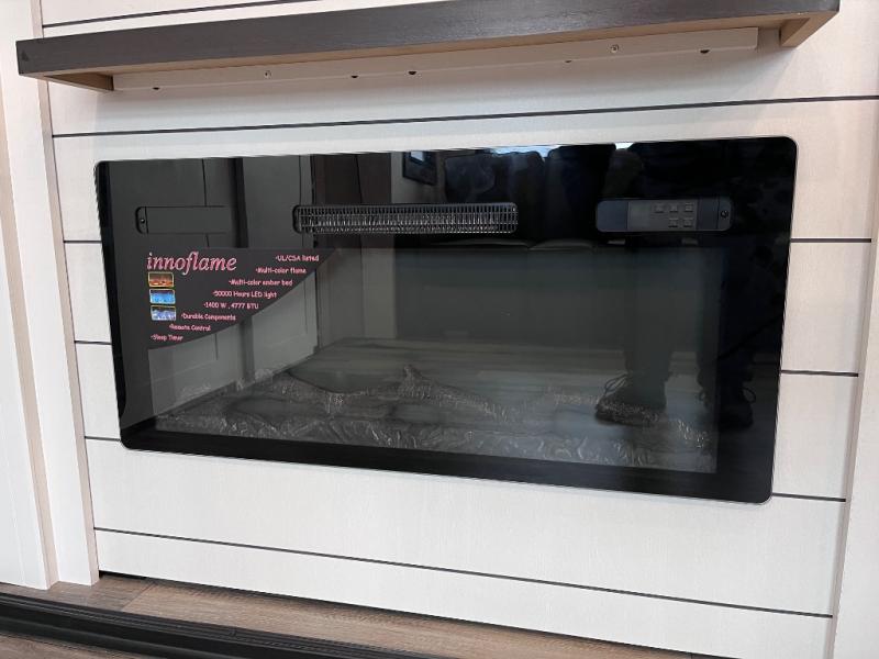 With any Open Range 3X fifth wheel by Open Range RV, you will enjoy residential luxuries and an exceptional build. The TuffShell construction includes vacuum bonded laminated fiberglass and welded aluminum frames for added strength, and the PVC roofing membrane is ultra durable. You can plan to camp year around or go full-time since there is a mandatory Four Season Package that includes a heated and enclosed underbelly, a 40K BTU high-performance furnace, double insulated baggage doors, and more. The residential features continue on with the mandatory Executive Package with the TravelLINK Smart RV system, Keyed-Alike entry and baggage doors, painted fiberglass front cap with LED lighting, and three 15,000 BTU A/C units with quiet residential return air. Inside, you'll enjoy GE kitchen appliances, sleek square windows with integrated blinds, ceramic subway tile backsplash, a glass shower door, and the list of amenities goes on!