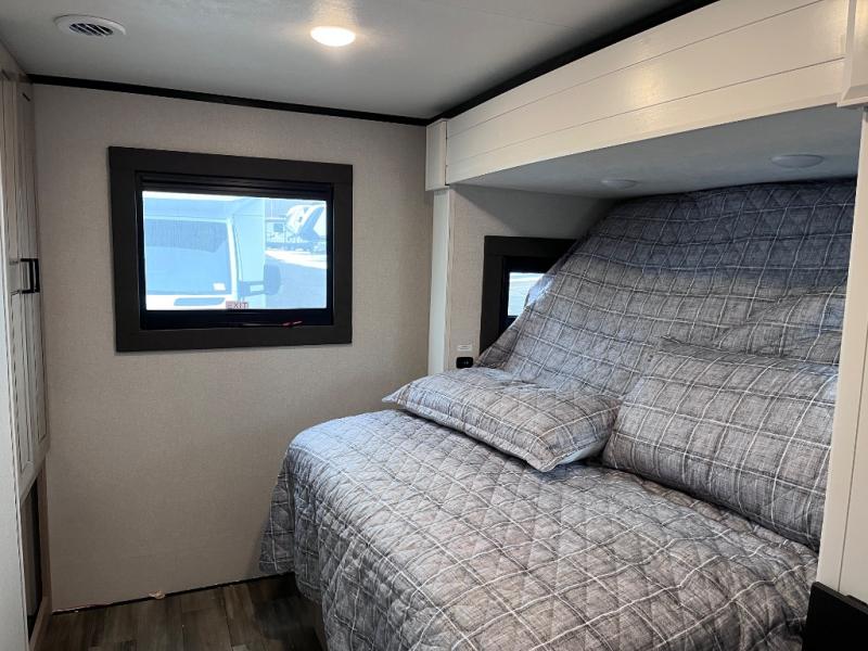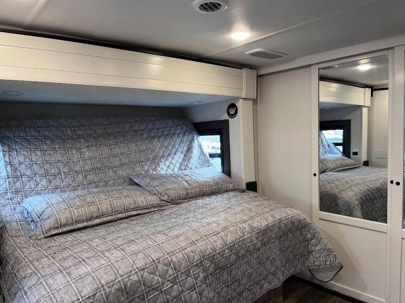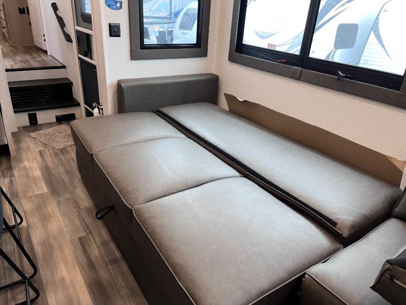 If you enjoy luxury camping or you're looking for a residential fifth wheel to go full-time in, this Open Range 3X is the one! The middle kitchen and living room is made open by the dual opposing slides, and your crew can get comfortable on the mega lounge with two tables. The chef of your group will love cooking on GE free-standing four burner range, or they can use the GE residential microwave to heat up leftovers. The standard dishwasher and central vacuum make cleanup a breeze. A waterfall island with four chairs will provide a place to dine and the hidden pantry behind the swing-out entertainment center can hold snacks galore. There is also a fireplace and smart HDTV to make movie nights cozy. The front master bedroom includes a slide out king bed with a power tilt, two dressers, a large front closet, and a 32" TV to watch shows in bed. You even have your own entrance into the full bath, plus washer and dryer prep if you choose to add those appliances. The rear master bedroom is just as accommodating with a queen bed slide out, a wardrobe and a dresser, plus a second full bath with its own exterior entry door. And the loft above the rear bedroom provides even more sleeping space.