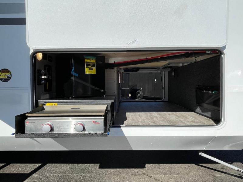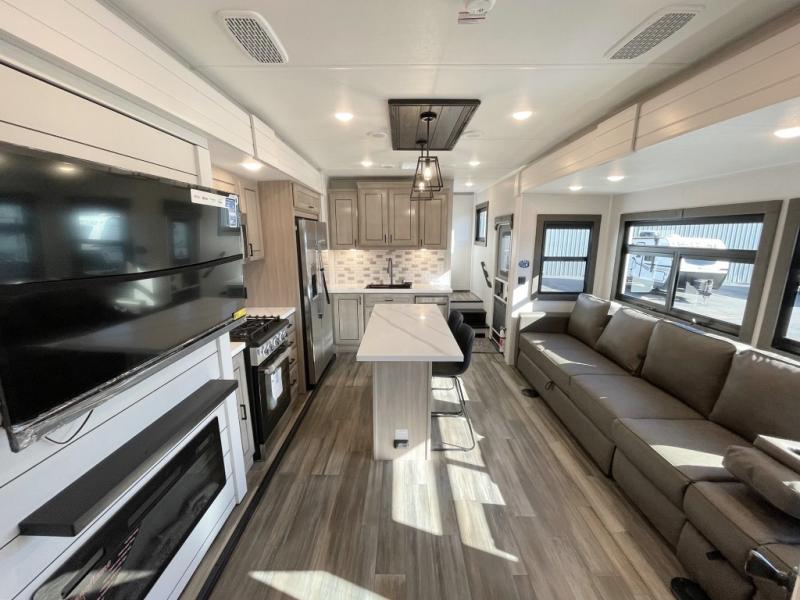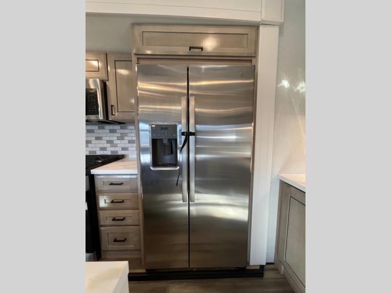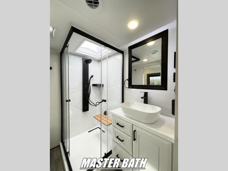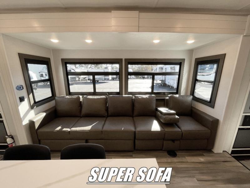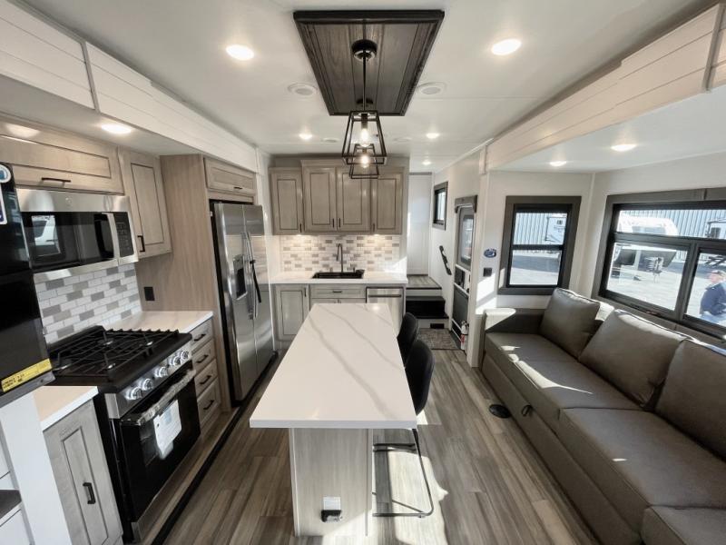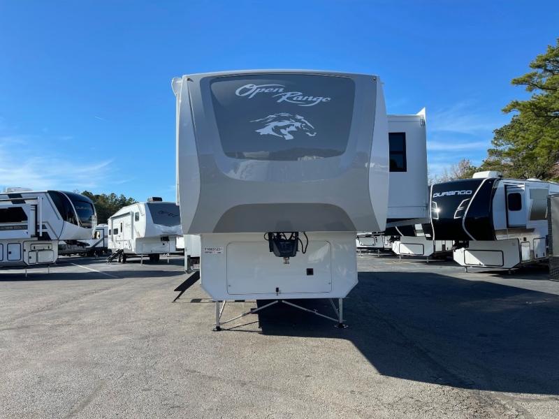 With any Open Range 3X fifth wheel by Open Range RV, you will enjoy residential luxuries and an exceptional build. The TuffShell construction includes vacuum bonded laminated fiberglass and welded aluminum frames for added strength, and the PVC roofing membrane is ultra durable. You can plan to camp year around or go full-time since there is a mandatory Four Season Package that includes a heated and enclosed underbelly, a 40K BTU high-performance furnace, double insulated baggage doors, and more. The residential features continue on with the mandatory Executive Package with the TravelLINK Smart RV system, Keyed-Alike entry and baggage doors, painted fiberglass front cap with LED lighting, and three 15,000 BTU A/C units with quiet residential return air. Inside, you'll enjoy GE kitchen appliances, sleek square windows with integrated blinds, ceramic subway tile backsplash, a glass shower door, and the list of amenities goes on!