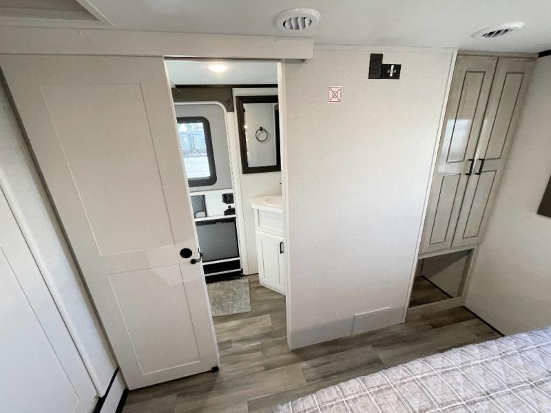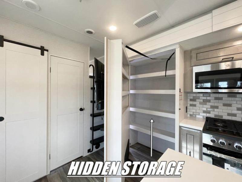 If you enjoy luxury camping or you're looking for a residential fifth wheel to go full-time in, this Open Range 3X is the one! The middle kitchen and living room is made open by the dual opposing slides, and your crew can get comfortable on the mega lounge with two tables. The chef of your group will love cooking on GE free-standing four burner range, or they can use the GE residential microwave to heat up leftovers. The standard dishwasher and central vacuum make cleanup a breeze. A waterfall island with four chairs will provide a place to dine and the hidden pantry behind the swing-out entertainment center can hold snacks galore. There is also a fireplace and smart HDTV to make movie nights cozy. The front master bedroom includes a slide out king bed with a power tilt, two dressers, a large front closet, and a 32" TV to watch shows in bed. You even have your own entrance into the full bath, plus washer and dryer prep if you choose to add those appliances. The rear master bedroom is just as accommodating with a queen bed slide out, a wardrobe and a dresser, plus a second full bath with its own exterior entry door. And the loft above the rear bedroom provides even more sleeping space.