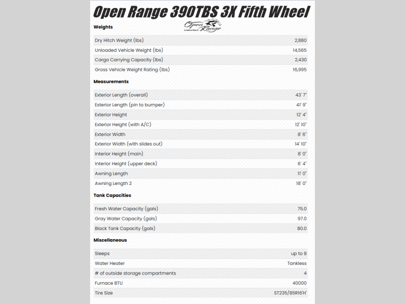 Open Range RV Open Range 3X fifth wheel 390TBS highlights: