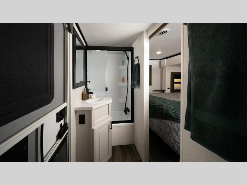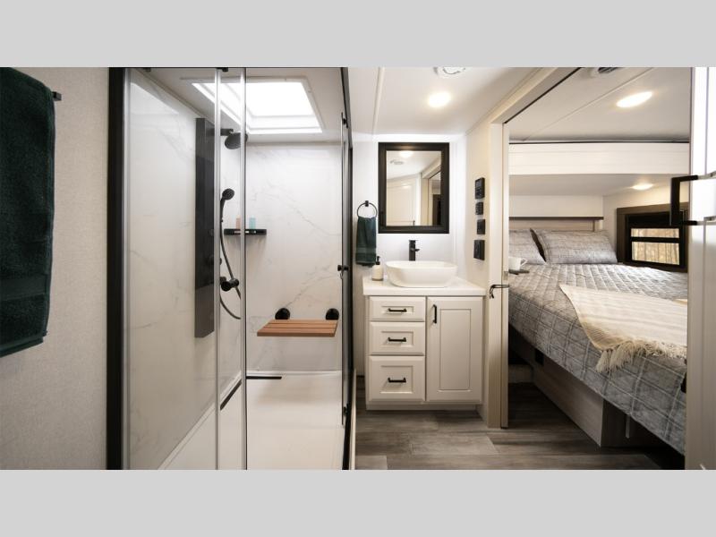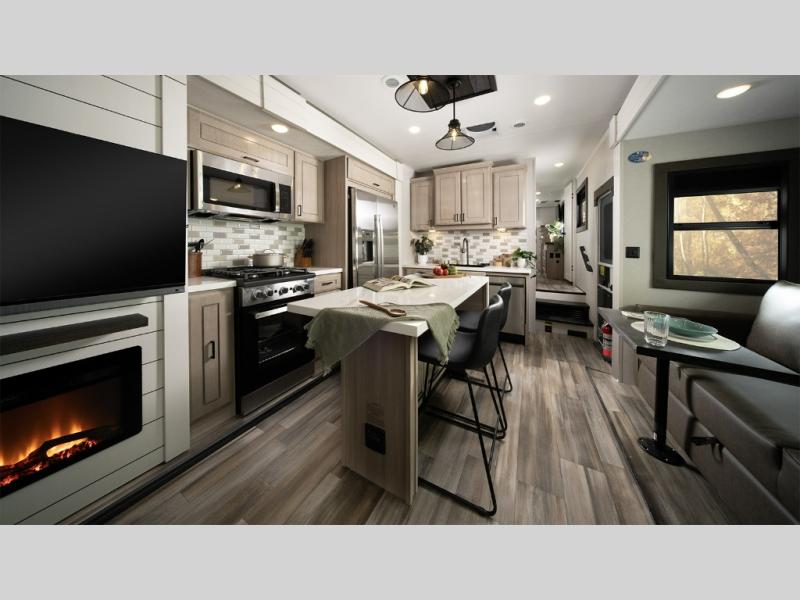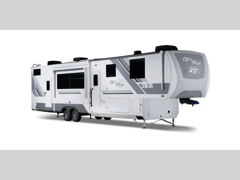 With any Open Range 3X fifth wheel by Open Range RV, you will enjoy residential luxuries and an exceptional build. The TuffShell construction includes vacuum bonded laminated fiberglass and welded aluminum frames for added strength, and the PVC roofing membrane is ultra durable. You can plan to camp year around or go full-time since there is a mandatory Four Season Package that includes a heated and enclosed underbelly, a 40K BTU high-performance furnace, double insulated baggage doors, and more. The residential features continue on with the mandatory Executive Package with the TravelLINK Smart RV system, Keyed-Alike entry and baggage doors, painted fiberglass front cap with LED lighting, and three 15,000 BTU A/C units with quiet residential return air. Inside, you'll enjoy GE kitchen appliances, sleek square windows with integrated blinds, ceramic subway tile backsplash, a glass shower door, and the list of amenities goes on!