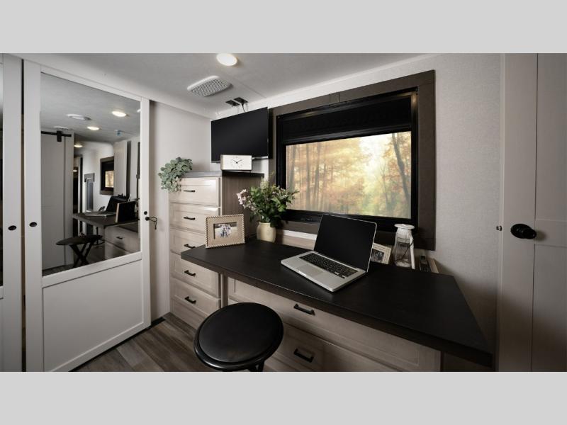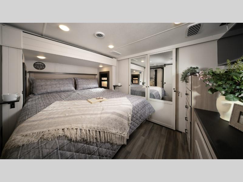 If you enjoy luxury camping or you're looking for a residential fifth wheel to go full-time in, this Open Range 3X is the one! The middle kitchen and living room is made open by the dual opposing slides, and your crew can get comfortable on the mega lounge with two tables. The chef of your group will love cooking on GE free-standing four burner range, or they can use the GE residential microwave to heat up leftovers. The standard dishwasher and central vacuum make cleanup a breeze. A waterfall island with four chairs will provide a place to dine and the hidden pantry behind the swing-out entertainment center can hold snacks galore. There is also a fireplace and smart HDTV to make movie nights cozy. The front master bedroom includes a slide out king bed with a power tilt, two dressers, a large front closet, and a 32" TV to watch shows in bed. You even have your own entrance into the full bath, plus washer and dryer prep if you choose to add those appliances. The rear master bedroom is just as accommodating with a queen bed slide out, a wardrobe and a dresser, plus a second full bath with its own exterior entry door. And the loft above the rear bedroom provides even more sleeping space.