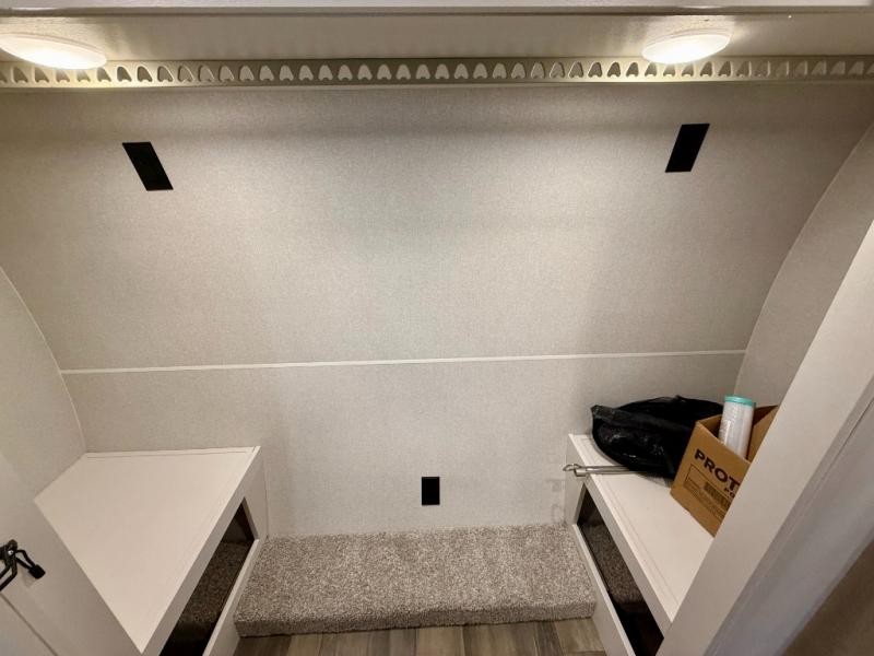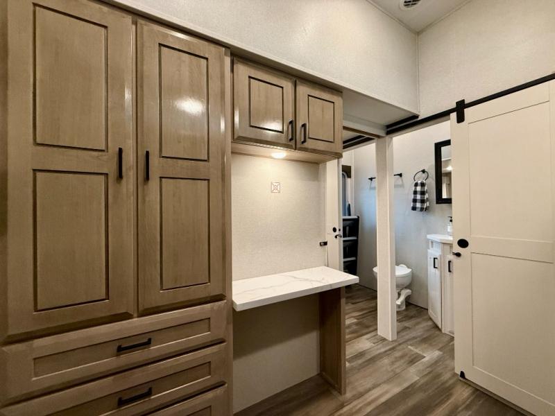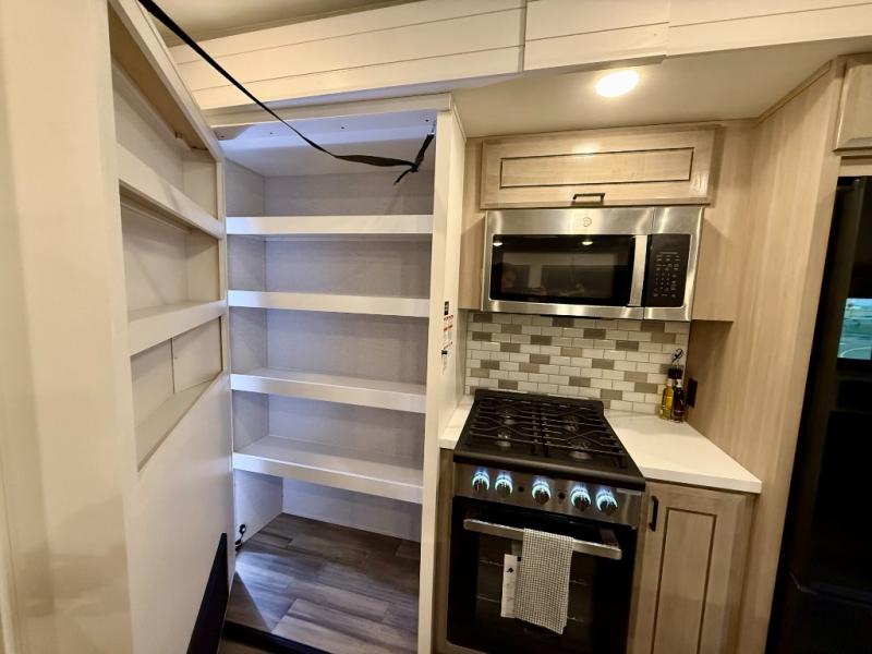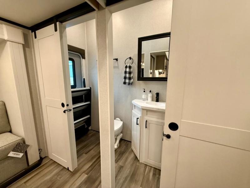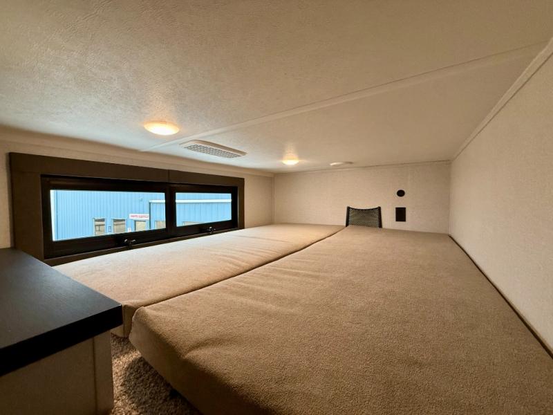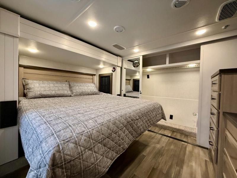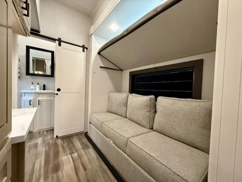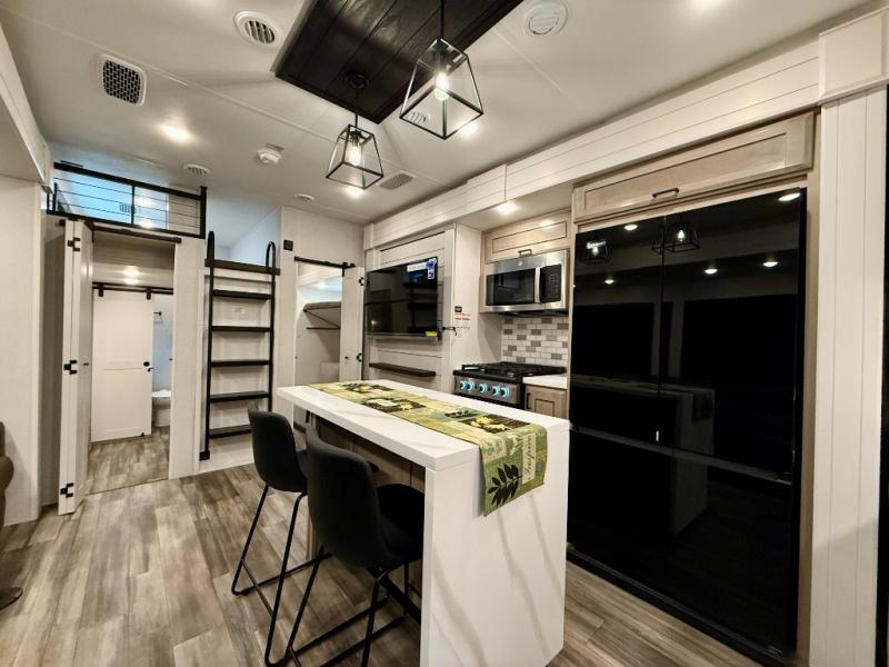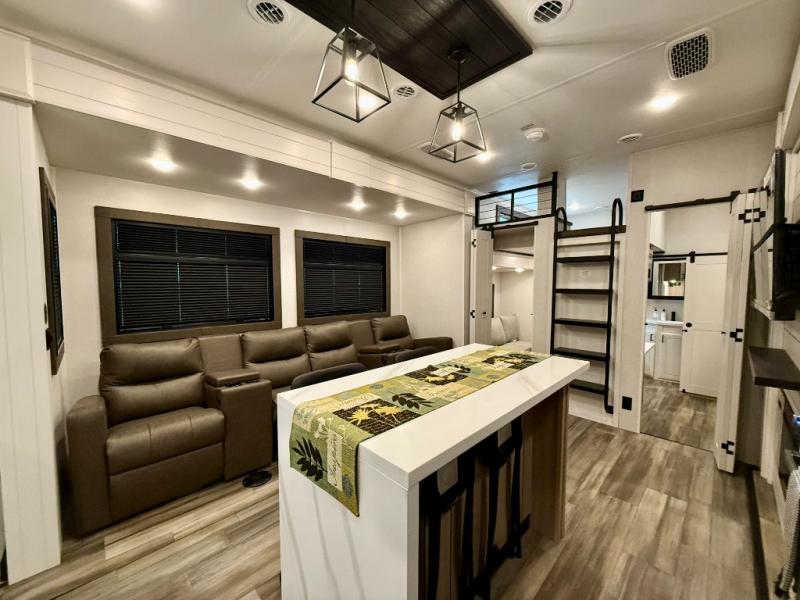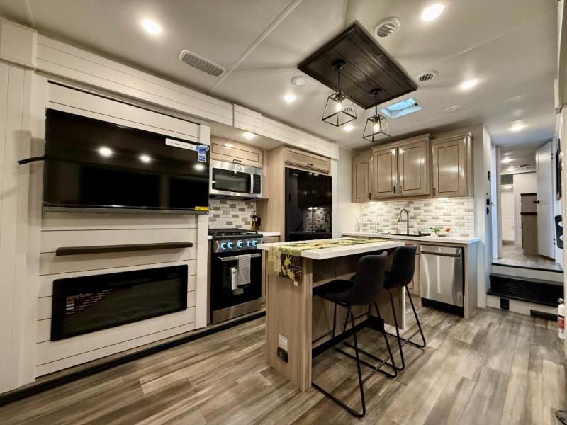 If you enjoy luxury camping or you're looking for a residential fifth wheel to go full-time in, this Open Range 3X is the one! The middle kitchen and living room is made open by the dual opposing slides, and your crew can get comfortable on the mega lounge with two tables. The chef of your group will love cooking on GE free-standing four burner range, or they can use the GE residential microwave to heat up leftovers. The standard dishwasher and central vacuum make cleanup a breeze. A waterfall island with four chairs will provide a place to dine and the hidden pantry behind the swing-out entertainment center can hold snacks galore. There is also a fireplace and smart HDTV to make movie nights cozy. The front master bedroom includes a slide out 72" x 78" king bed, two dressers, a large front closet, and a 32" TV to watch shows in bed. You even have your own entrance into the full bath, plus washer and dryer prep if you choose to add those appliances. The rear bunkhouse suite includes two separate sides that can be shut off from one another, perfect if you have older kids or more than one guest. Each side includes a bi-fold sofa, a desk with overhead storage, and a wardrobe with drawers. And one side even includes a flip-up bunk above the sofa for more sleeping space! The shared full rear bath includes a tub/shower to make bath time easier than ever, plus you'll find one of the dual entry doors here for added convenience!