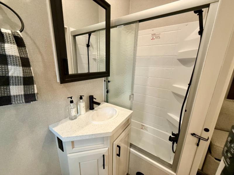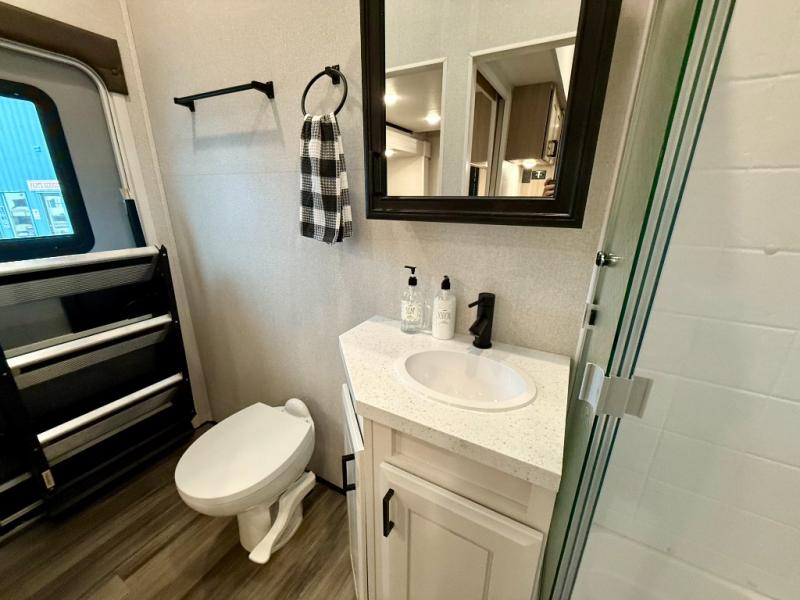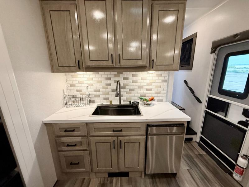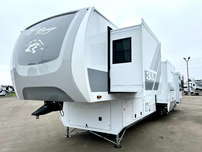 With any Open Range 3X fifth wheel by Open Range RV, you will enjoy residential luxuries and an exceptional build. The TuffShell construction includes vacuum bonded laminated fiberglass and welded aluminum frames for added strength, and the PVC roofing membrane is ultra durable. You can plan to camp year around or go full-time since there is a mandatory Four Season Package that includes a heated and enclosed underbelly, a 40K BTU high-performance furnace, double insulated baggage doors, and more. The residential features continue on with the mandatory Executive Package with the TravelLINK Smart RV system, Keyed-Alike entry and baggage doors, painted fiberglass front cap with LED lighting, and three 15,000 BTU A/C units with quiet residential return air. Inside, you'll enjoy GE kitchen appliances, sleek square windows with integrated blinds, ceramic subway tile backsplash, a glass shower door, and the list of amenities goes on!