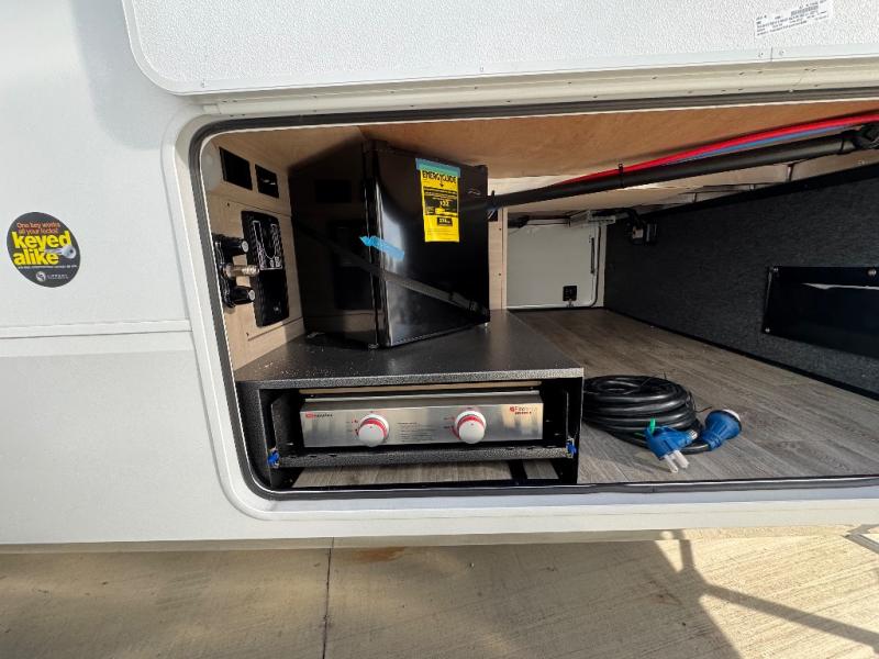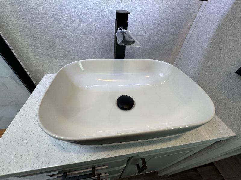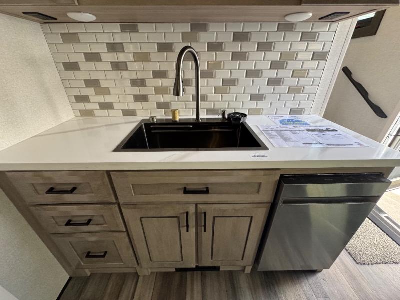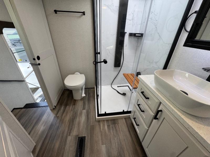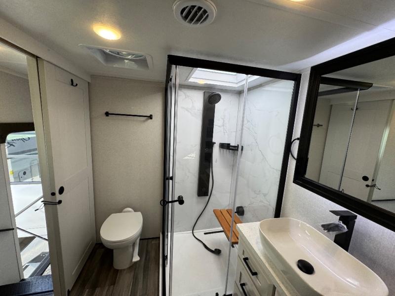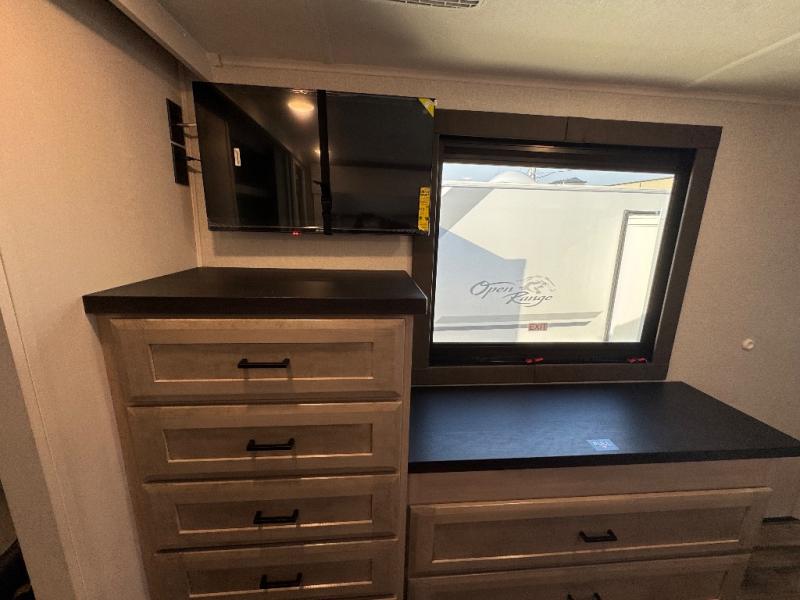With any Open Range 3X fifth wheel by Open Range RV, you will enjoy residential luxuries and an exceptional build. The TuffShell construction includes vacuum bonded laminated fiberglass and welded aluminum frames for added strength, and the PVC roofing membrane is ultra durable. You can plan to camp year around or go full-time since there is a mandatory Four Season Package that includes a heated and enclosed underbelly, a 40K BTU high-performance furnace, double insulated baggage doors, and more. The residential features continue on with the mandatory Executive Package with the TravelLINK Smart RV system, Keyed-Alike entry and baggage doors, painted fiberglass front cap with LED lighting, and three 15,000 BTU A/C units with quiet residential return air. Inside, you'll enjoy GE kitchen appliances, sleek square windows with integrated blinds, ceramic subway tile backsplash, a glass shower door, and the list of amenities goes on!