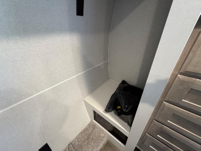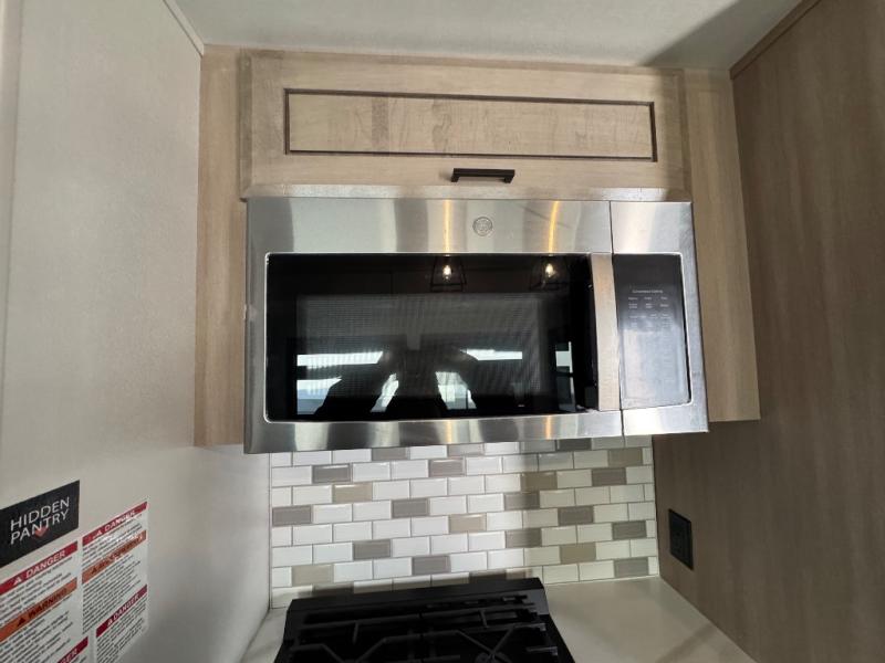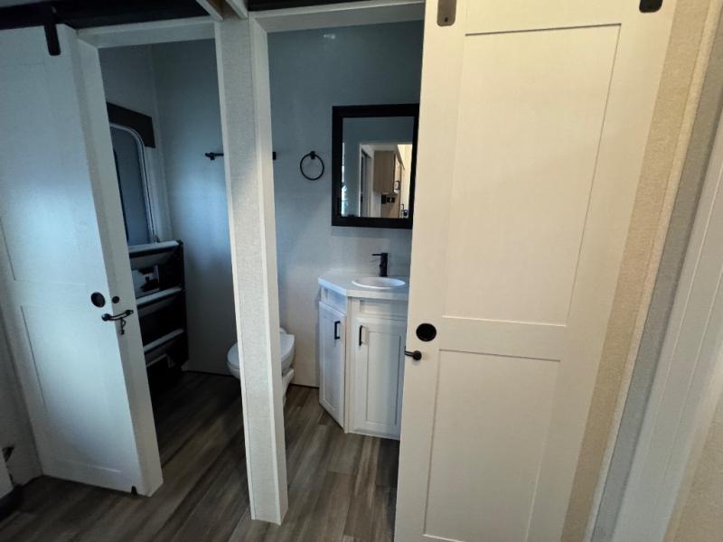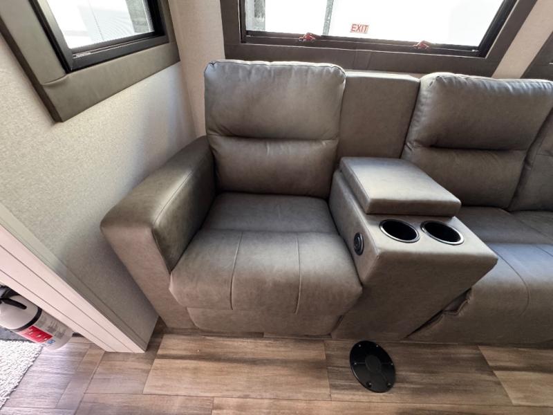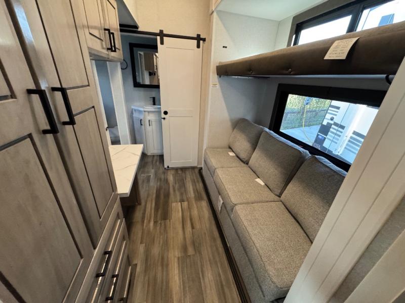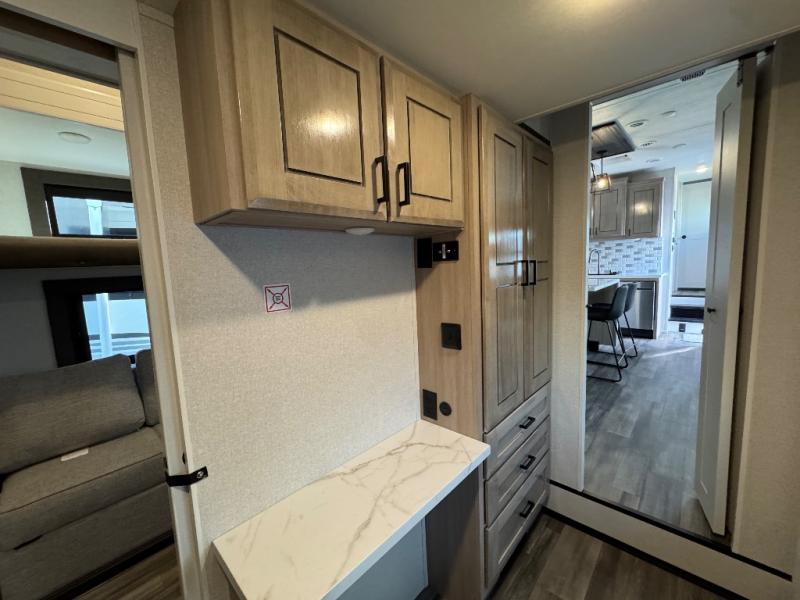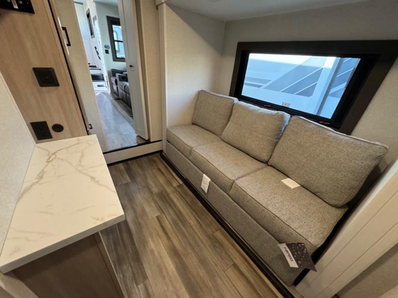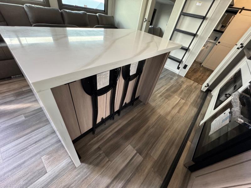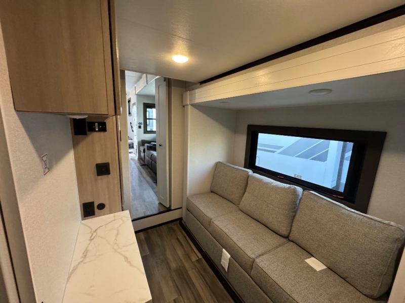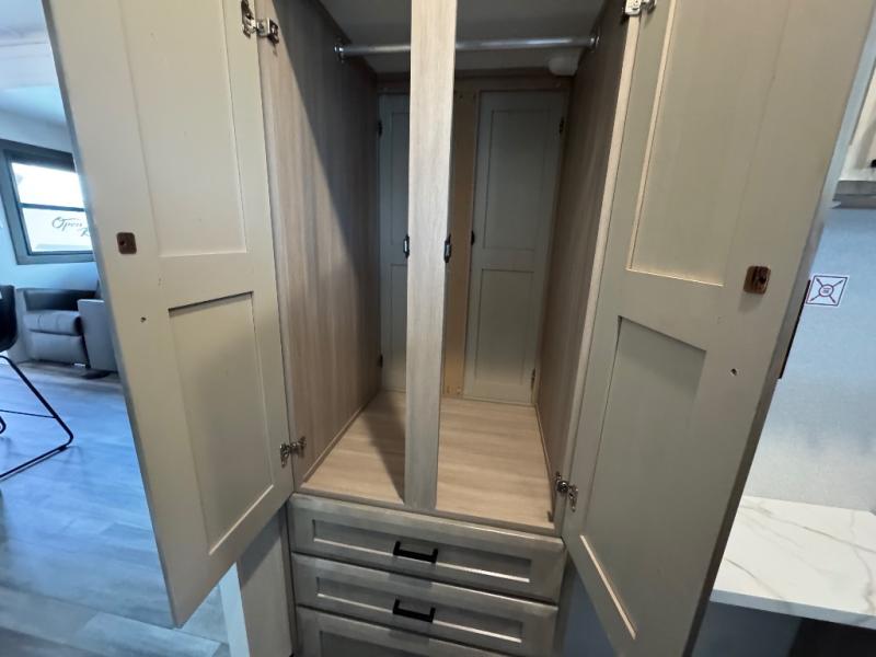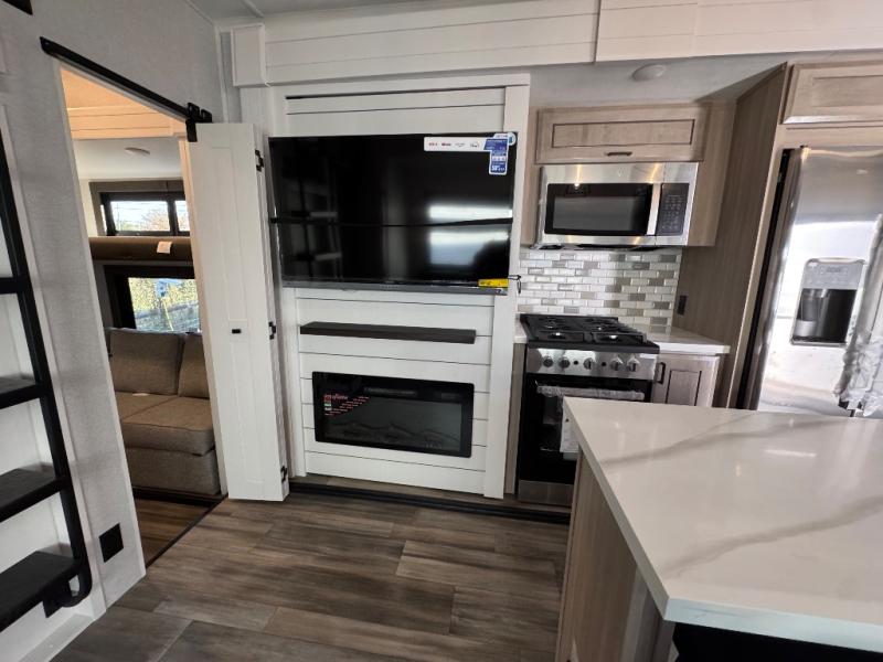 If you enjoy luxury camping or you're looking for a residential fifth wheel to go full-time in, this Open Range 3X is the one! The middle kitchen and living room is made open by the dual opposing slides, and your crew can get comfortable on the mega lounge with two tables. The chef of your group will love cooking on GE free-standing four burner range, or they can use the GE residential microwave to heat up leftovers. The standard dishwasher and central vacuum make cleanup a breeze. A waterfall island with four chairs will provide a place to dine and the hidden pantry behind the swing-out entertainment center can hold snacks galore. There is also a fireplace and smart HDTV to make movie nights cozy. The front master bedroom includes a slide out 72" x 78" king bed, two dressers, a large front closet, and a 32" TV to watch shows in bed. You even have your own entrance into the full bath, plus washer and dryer prep if you choose to add those appliances. The rear bunkhouse suite includes two separate sides that can be shut off from one another, perfect if you have older kids or more than one guest. Each side includes a bi-fold sofa, a desk with overhead storage, and a wardrobe with drawers. And one side even includes a flip-up bunk above the sofa for more sleeping space! The shared full rear bath includes a tub/shower to make bath time easier than ever, plus you'll find one of the dual entry doors here for added convenience!