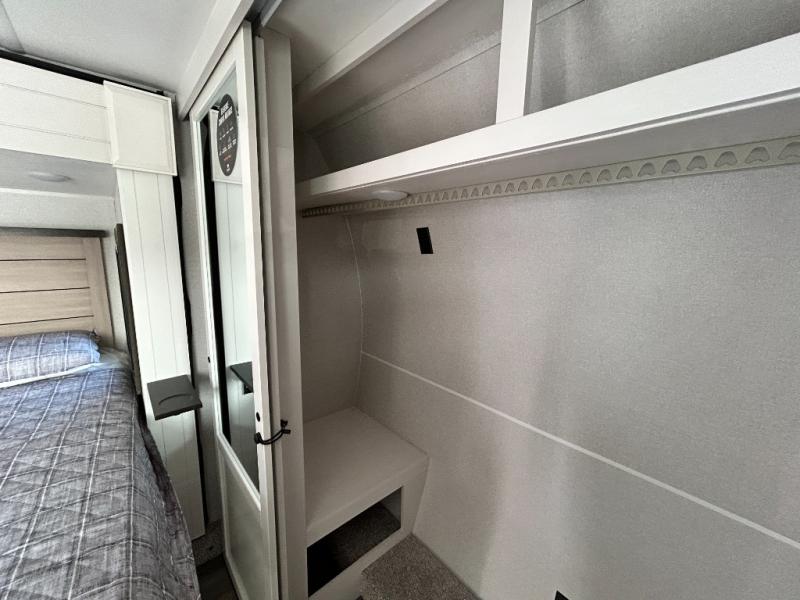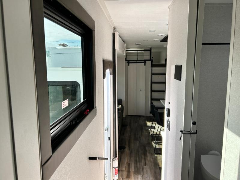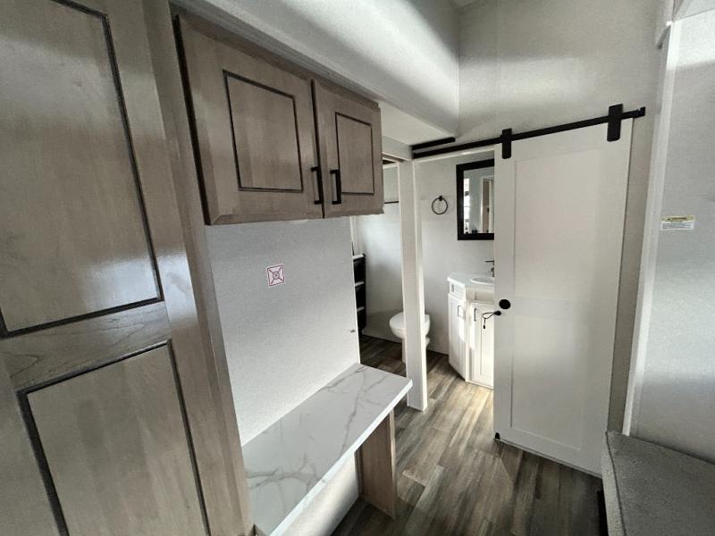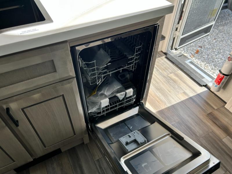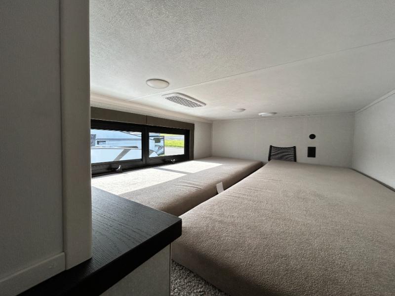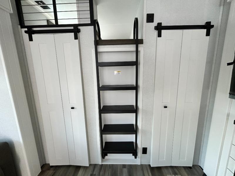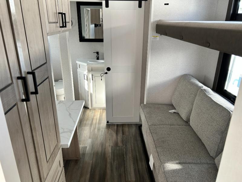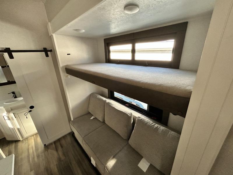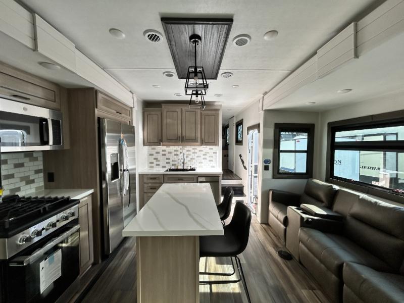 If you enjoy luxury camping or you're looking for a residential fifth wheel to go full-time in, this Open Range 3X is the one! The middle kitchen and living room is made open by the dual opposing slides, and your crew can get comfortable on the mega lounge with two tables. The chef of your group will love cooking on GE free-standing four burner range, or they can use the GE residential microwave to heat up leftovers. The standard dishwasher and central vacuum make cleanup a breeze. A waterfall island with four chairs will provide a place to dine and the hidden pantry behind the swing-out entertainment center can hold snacks galore. There is also a fireplace and smart HDTV to make movie nights cozy. The front master bedroom includes a slide out 72" x 78" king bed, two dressers, a large front closet, and a 32" TV to watch shows in bed. You even have your own entrance into the full bath, plus washer and dryer prep if you choose to add those appliances. The rear bunkhouse suite includes two separate sides that can be shut off from one another, perfect if you have older kids or more than one guest. Each side includes a bi-fold sofa, a desk with overhead storage, and a wardrobe with drawers. And one side even includes a flip-up bunk above the sofa for more sleeping space! The shared full rear bath includes a tub/shower to make bath time easier than ever, plus you'll find one of the dual entry doors here for added convenience!