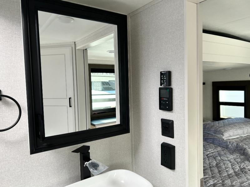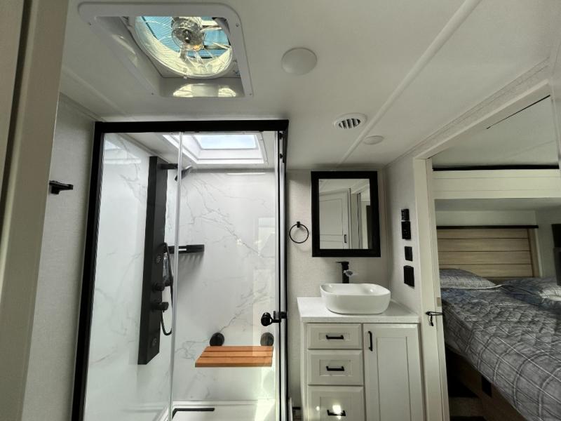 With any Open Range 3X fifth wheel by Open Range RV, you will enjoy residential luxuries and an exceptional build. The TuffShell construction includes vacuum bonded laminated fiberglass and welded aluminum frames for added strength, and the PVC roofing membrane is ultra durable. You can plan to camp year around or go full-time since there is a mandatory Four Season Package that includes a heated and enclosed underbelly, a 40K BTU high-performance furnace, double insulated baggage doors, and more. The residential features continue on with the mandatory Executive Package with the TravelLINK Smart RV system, Keyed-Alike entry and baggage doors, painted fiberglass front cap with LED lighting, and three 15,000 BTU A/C units with quiet residential return air. Inside, you'll enjoy GE kitchen appliances, sleek square windows with integrated blinds, ceramic subway tile backsplash, a glass shower door, and the list of amenities goes on!