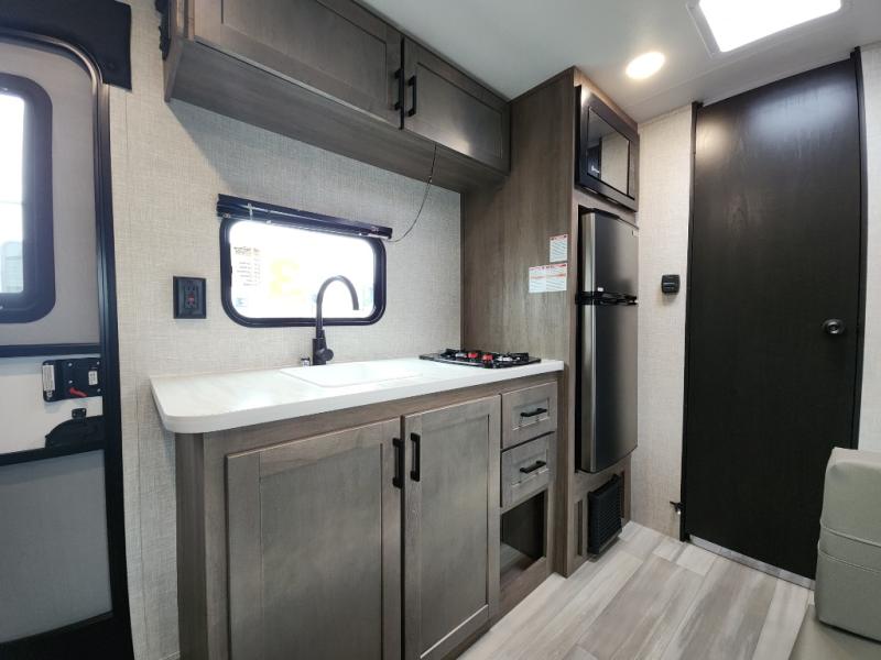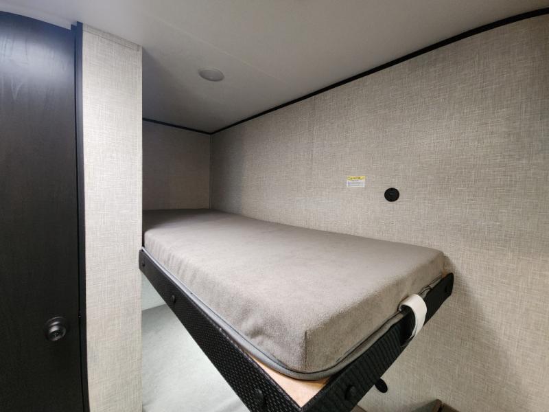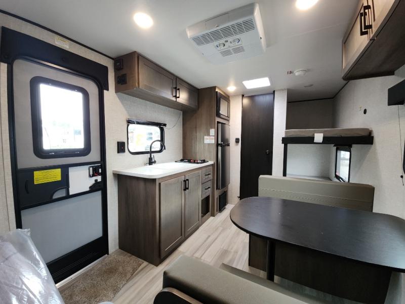 This Open Range Conventional COLT travel trailer is perfect for all your camping needs. There is a front queen bed and bunks beds for sleeping space, plus a booth dinette that will double as both dining and sleeping space for a guest or two little ones. A full kitchen includes a two burner cooktop and microwave to make meals each day, and the private bath with a tub/shower will make it easier than ever to wash up after a day outdoors.