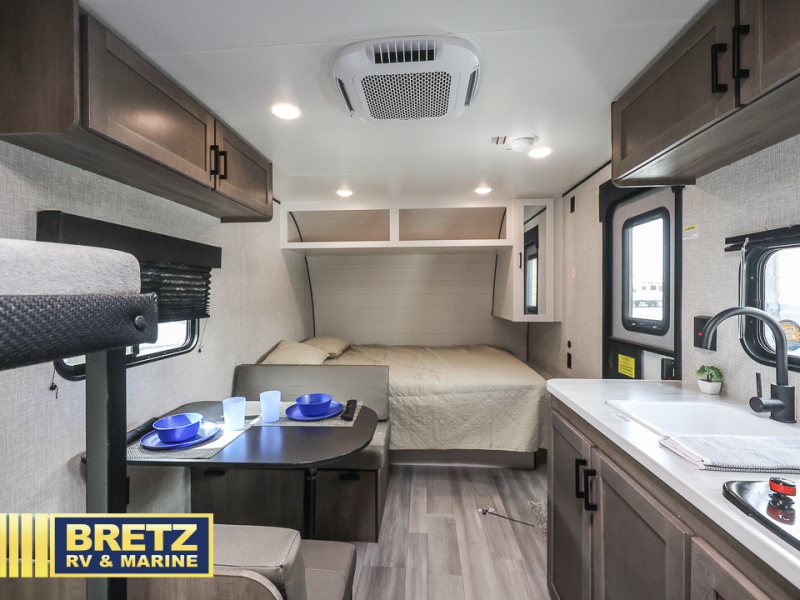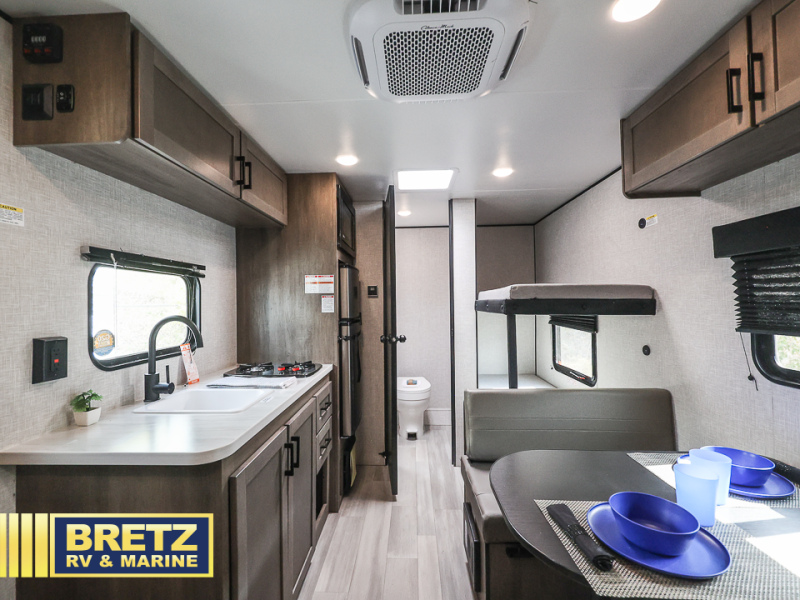 This Open Range Conventional COLT travel trailer is perfect for all your camping needs. There is a front queen bed and bunks beds for sleeping space, plus a booth dinette that will double as both dining and sleeping space for a guest or two little ones. A full kitchen includes a two burner cooktop and microwave to make meals each day, and the private bath with a tub/shower will make it easier than ever to wash up after a day outdoors.