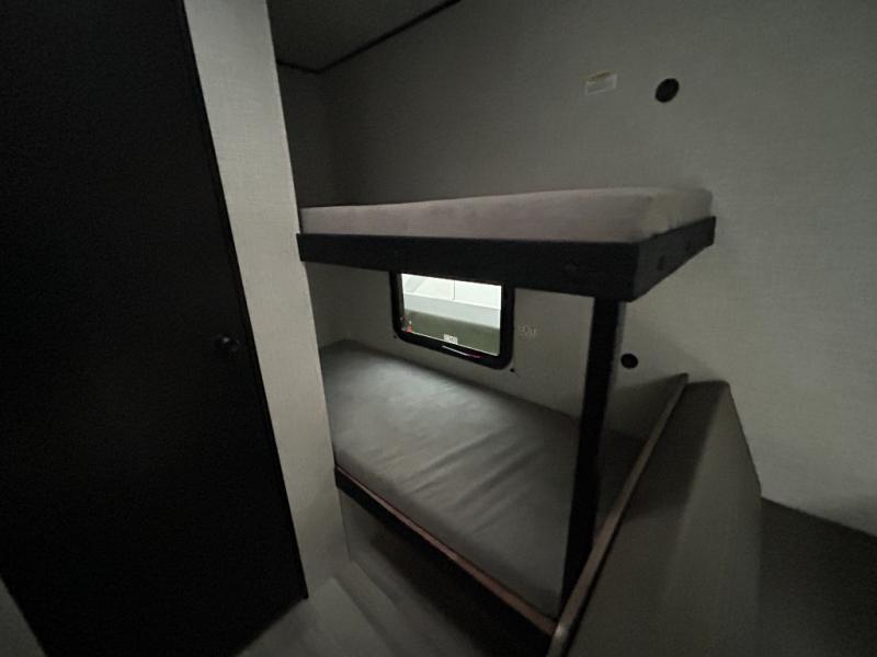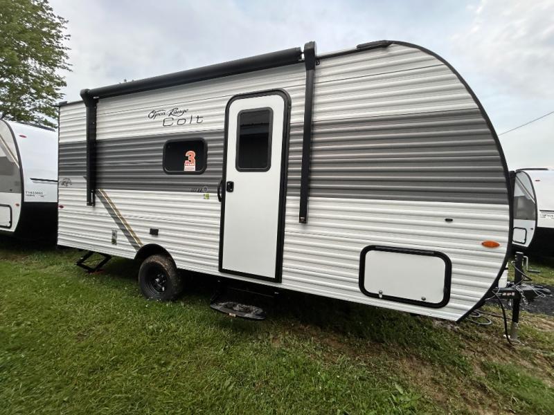 This Open Range Conventional COLT travel trailer is perfect for all your camping needs. There is a front queen bed and bunks beds for sleeping space, plus a booth dinette that will double as both dining and sleeping space for a guest or two little ones. A full kitchen includes a two burner cooktop and microwave to make meals each day, and the private bath with a tub/shower will make it easier than ever to wash up after a day outdoors.