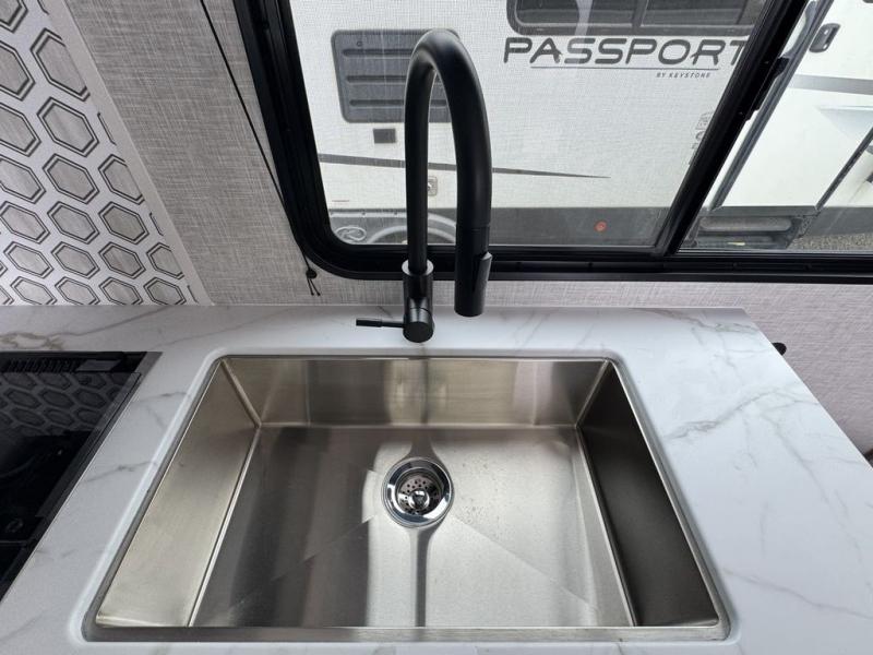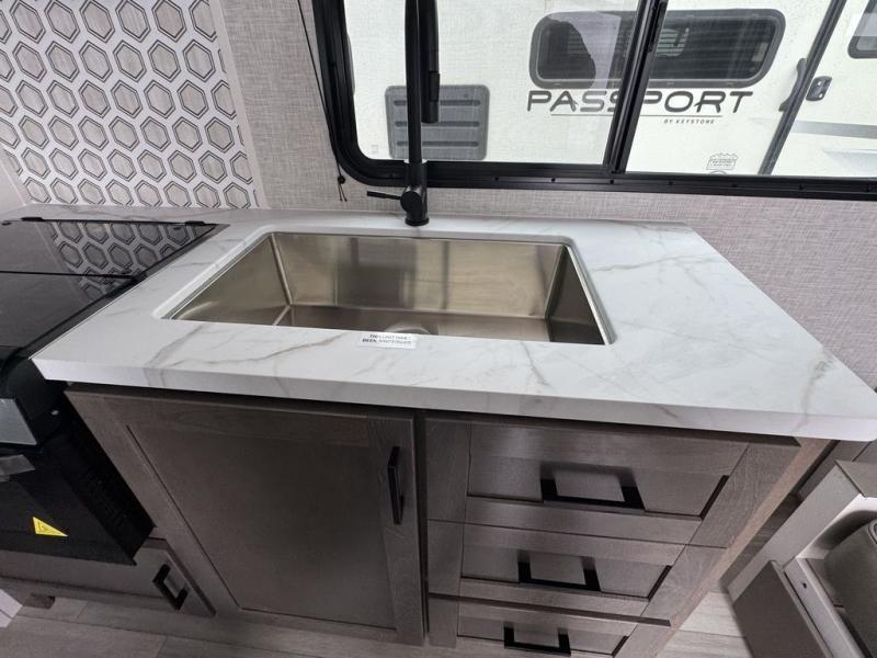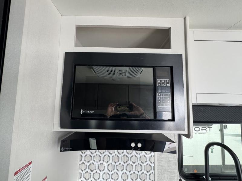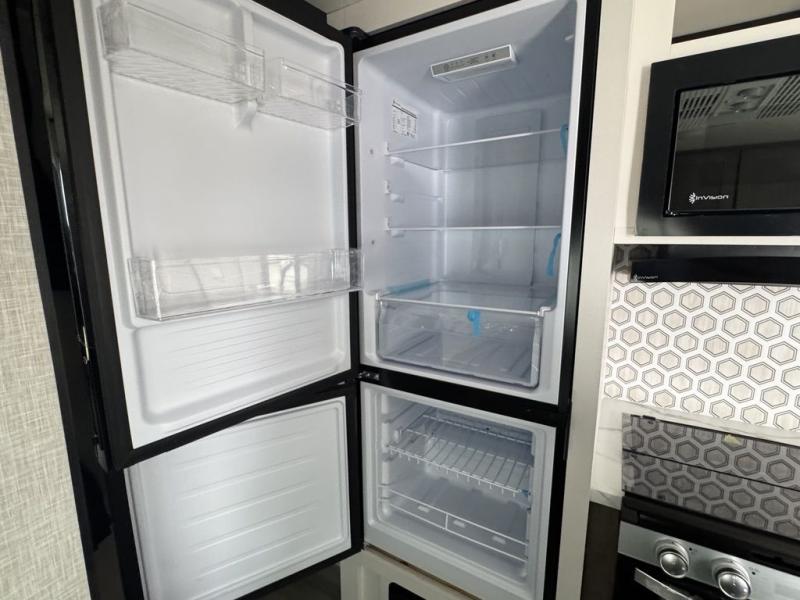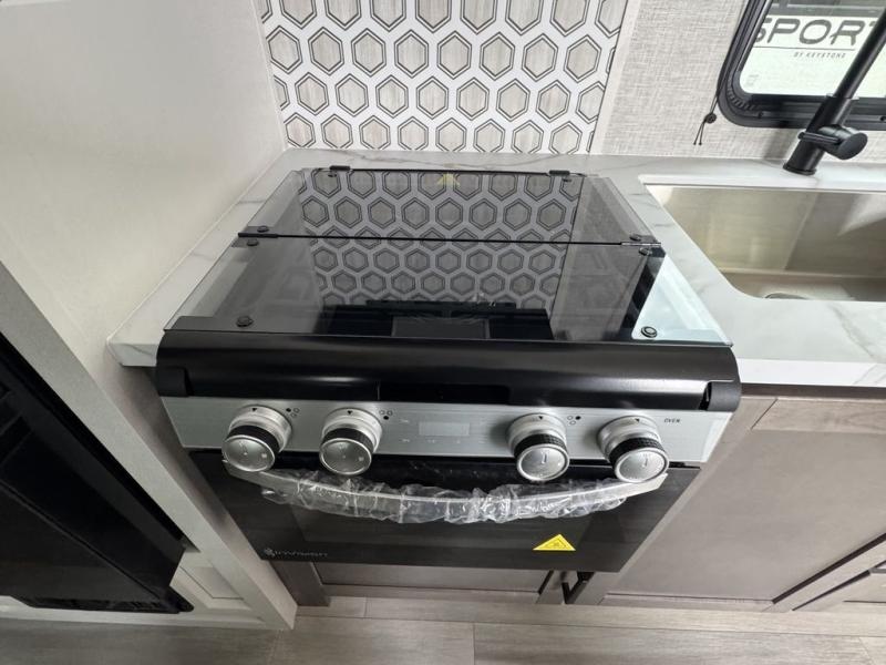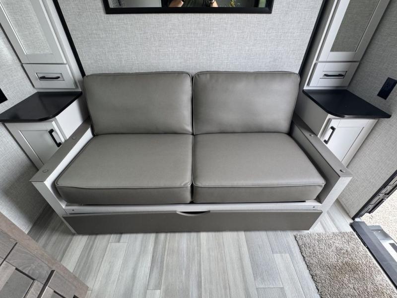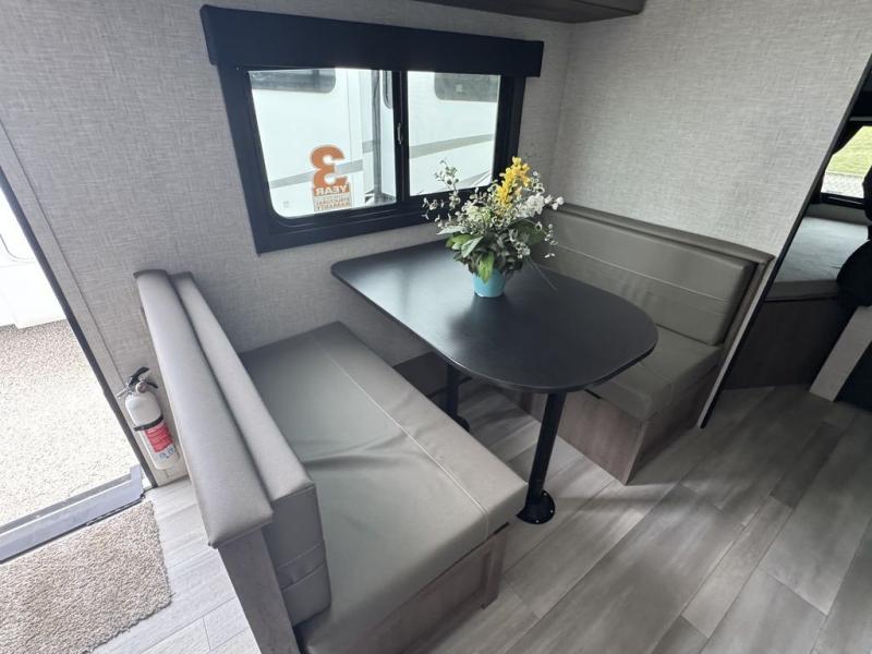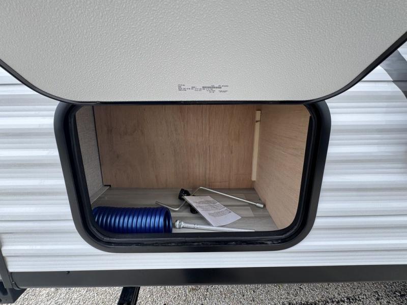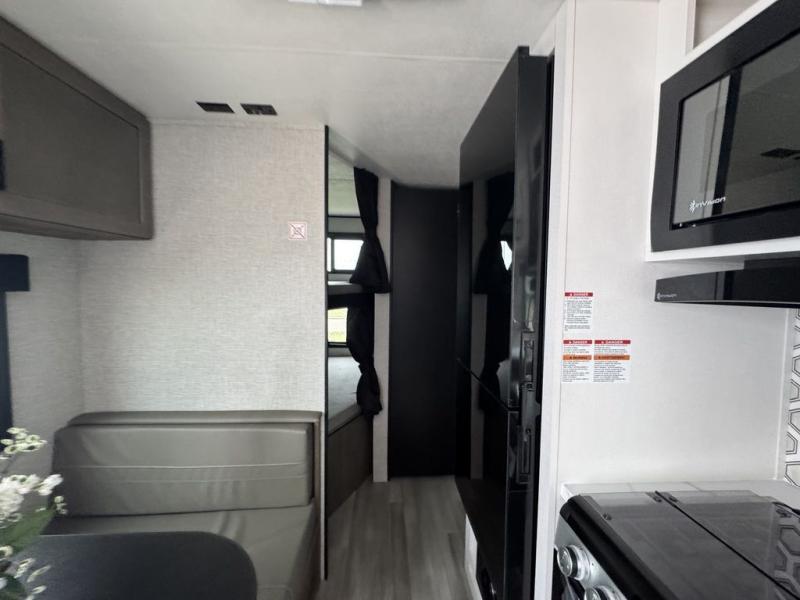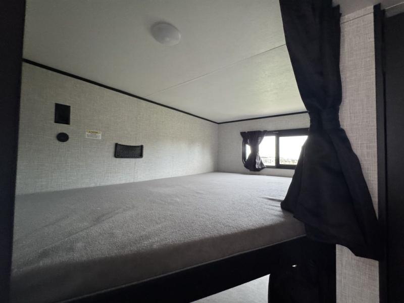 This versatile travel trailer is perfect for those wanting extra seating space during the day and extra sleeping space at night thanks to the Murphy bed. There are dual wardrobes on either side of the bed which will make it feel more like a bedroom at night, and double-size bunks can sleep four, so invite your friends along! Meals can be cooked on the three burner cooktop or in the microwave oven, and you'll appreciate an outdoor grill hookup with LP disconnect if you want to bring your own grill along.