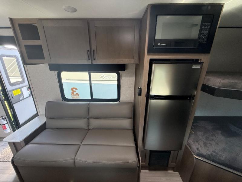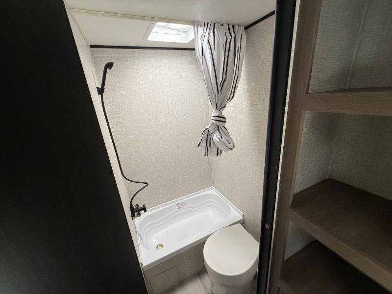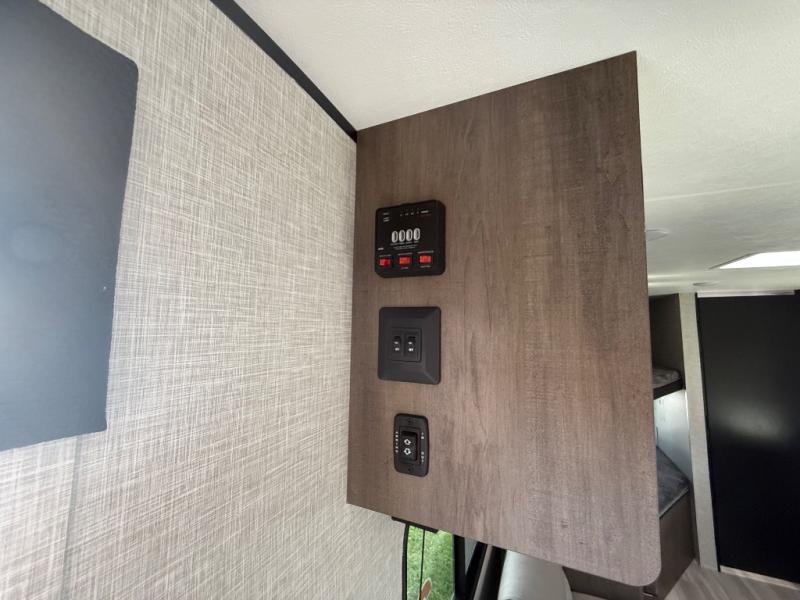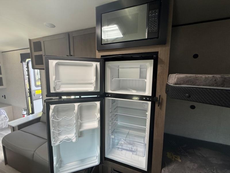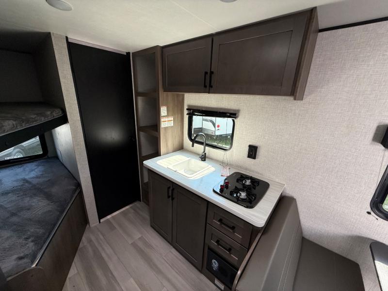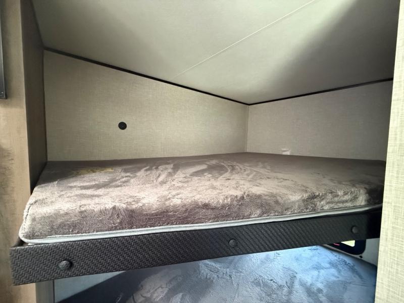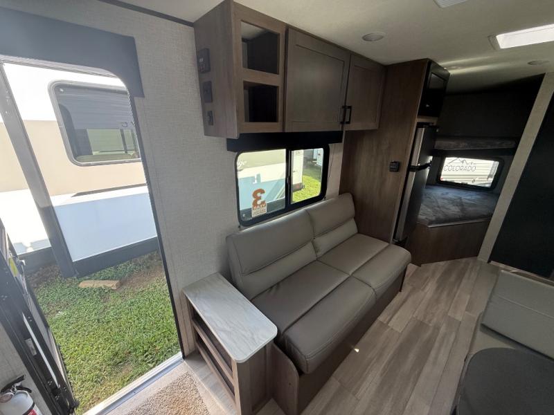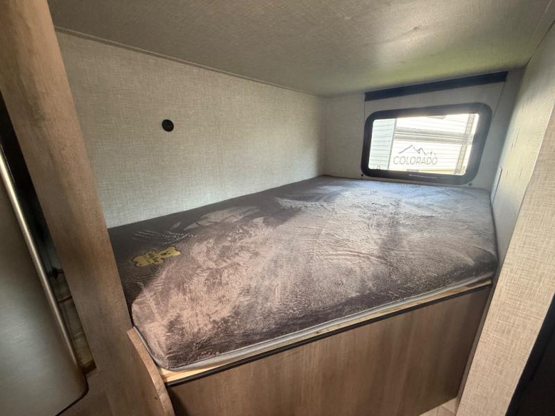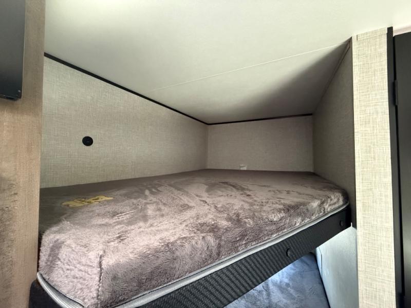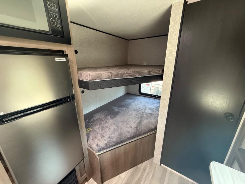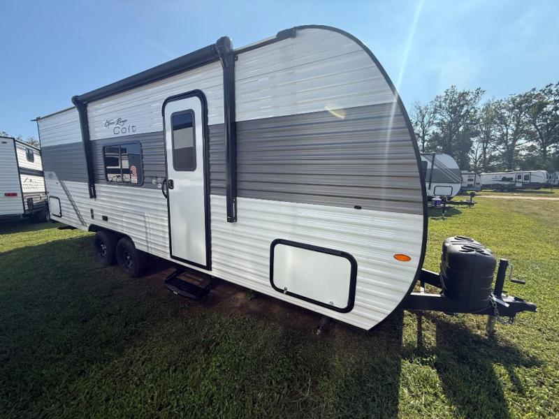 This Open Range Conventional COLT travel trailer is perfect for all your camping needs. The double-size bunk beds provide comfortable sleeping quarters for kids, while the tub/shower bathroom offers convenience and relaxation. A wardrobe provides ample storage for clothes and gear. Moving to the kitchen area, the two-burner stove top and microwave make meal prep an easy task, and overhead cabinets offer additional storage. Also, the booth dinette is perfect for family meals and games. Moreover, the jackknife sofa provides a comfortable spot for relaxation. The front bedroom features a spacious sleeping area with wardrobes on each side of the bed, offering plenty of storage for your belongings, and the 10' power awning provides shade and protection, creating a comfortable outdoor living space.