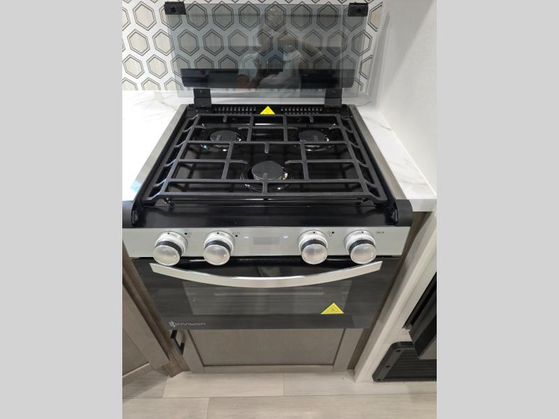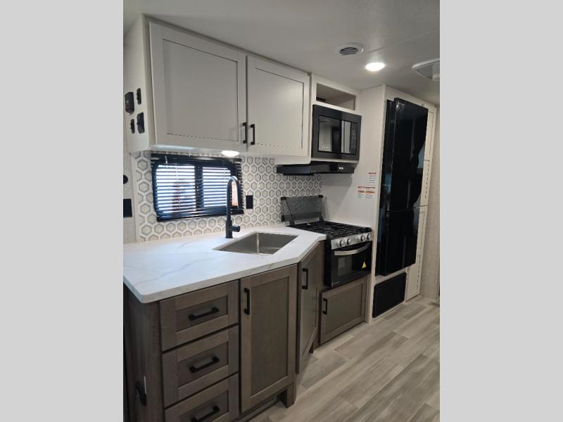 You're going to love every minute spent in this spacious travel trailer. The booth dinette and jack-knife sofa within the large slide out will be perfect for meal times, relaxing, and additional sleeping space. Add the optional Smart TV to the entertainment center and you're set up for movie night! This model includes an outside kitchen with a griddle and a refrigerator for cold drinks, plus indoor appliances if the rain has ruined your plans for the day. You will enjoy your own bedroom up front with space-saving sliding doors and two wardrobes for your clothes.