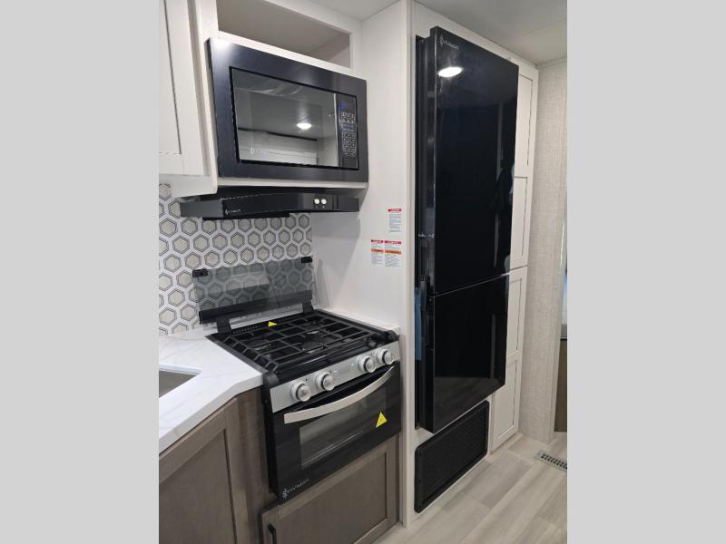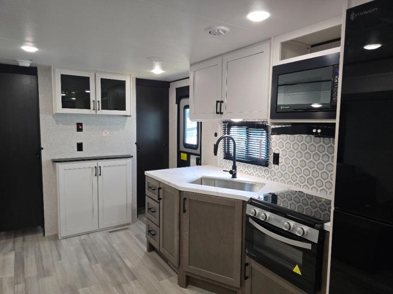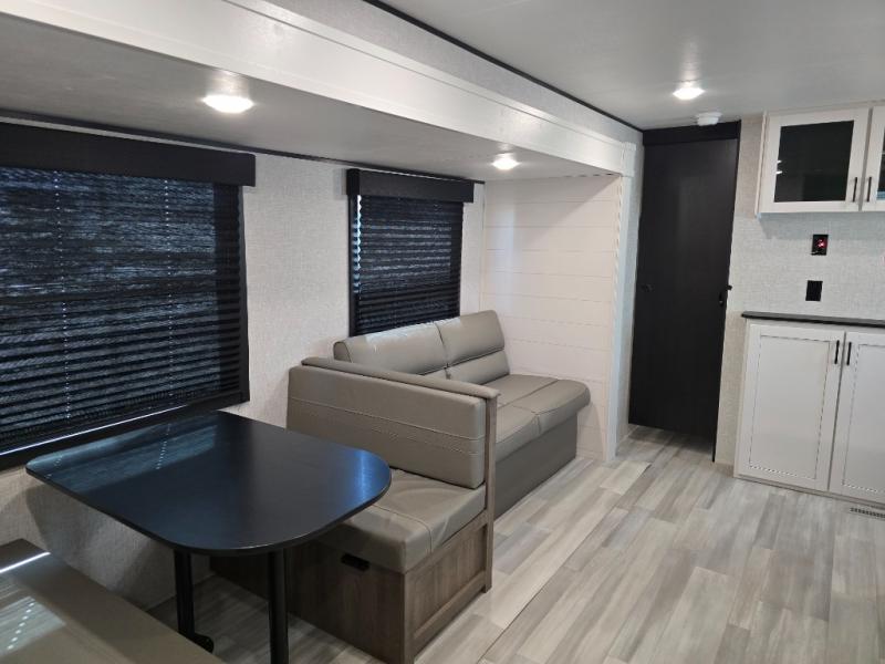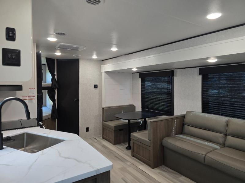 You're going to love every minute spent in this spacious travel trailer. The booth dinette and jack-knife sofa within the large slide out will be perfect for meal times, relaxing, and additional sleeping space. Add the optional Smart TV to the entertainment center and you're set up for movie night! This model includes an outside kitchen with a griddle and a refrigerator for cold drinks, plus indoor appliances if the rain has ruined your plans for the day. You will enjoy your own bedroom up front with space-saving sliding doors and two wardrobes for your clothes.