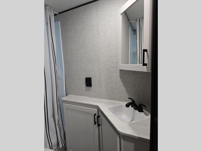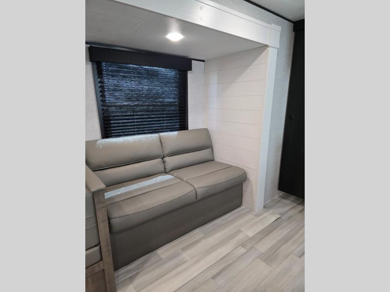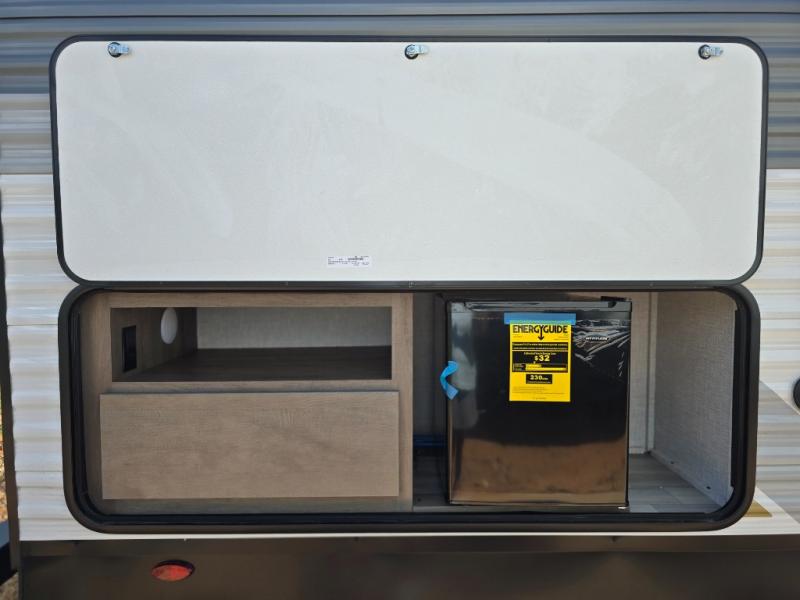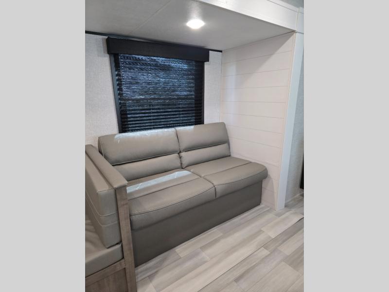 You're going to love every minute spent in this spacious travel trailer. The booth dinette and jack-knife sofa within the large slide out will be perfect for meal times, relaxing, and additional sleeping space. Add the optional Smart TV to the entertainment center and you're set up for movie night! This model includes an outside kitchen with a griddle and a refrigerator for cold drinks, plus indoor appliances if the rain has ruined your plans for the day. You will enjoy your own bedroom up front with space-saving sliding doors and two wardrobes for your clothes.
