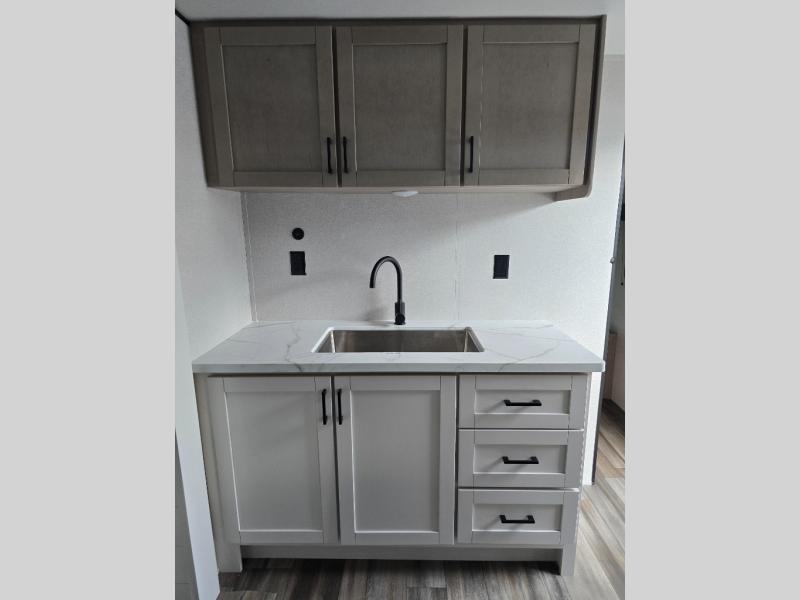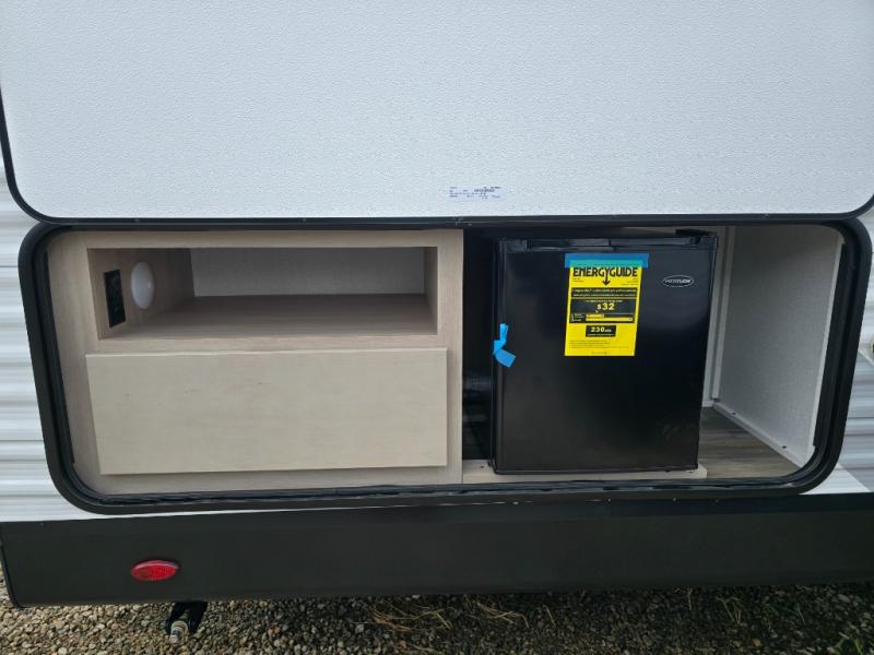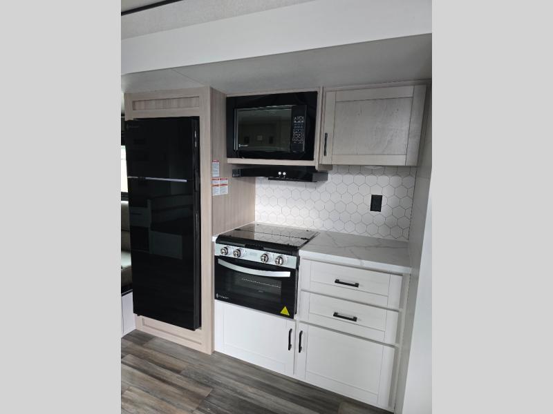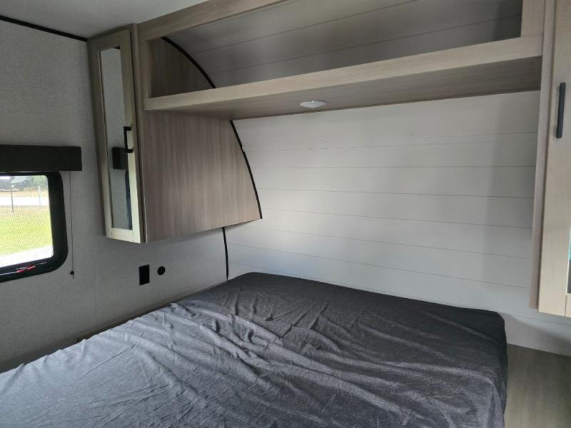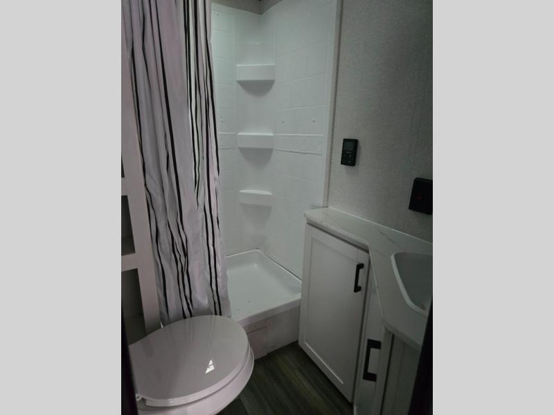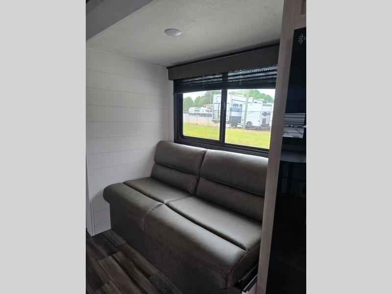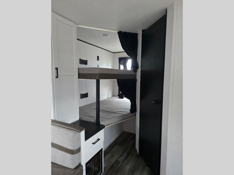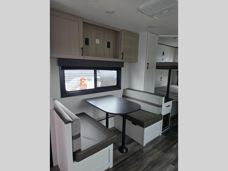 This dual-axle travel trailer can sleep eight people each night, so invite your family or friends along. You will enjoy the private bedroom up front with dual wardrobes to keep your clothes tidy. While the chef of your group is preparing lunch on the three burner cooktop, everyone else can visit on the jack-knife sofa or play a game at the booth dinette. You will also find an 18' power awning with LED lights outdoors which is where you may usually find everyone. The walk-in pantry and additional storage beside the pantry will let you keep snacks, paper goods, and more fully stocked. And the private bathroom is right next to the double-size bunks for added convenience.