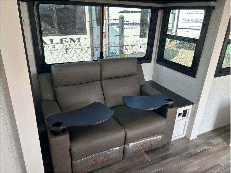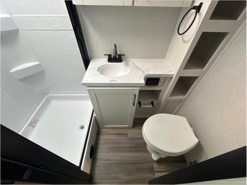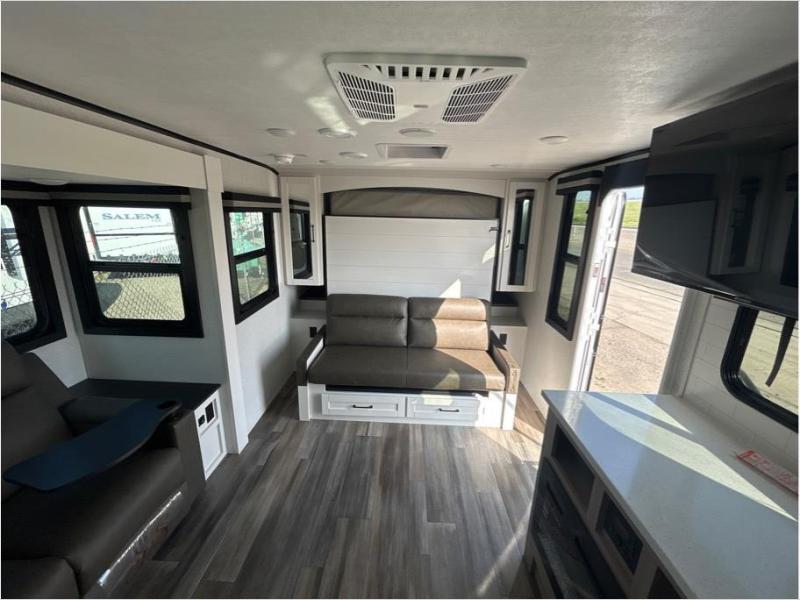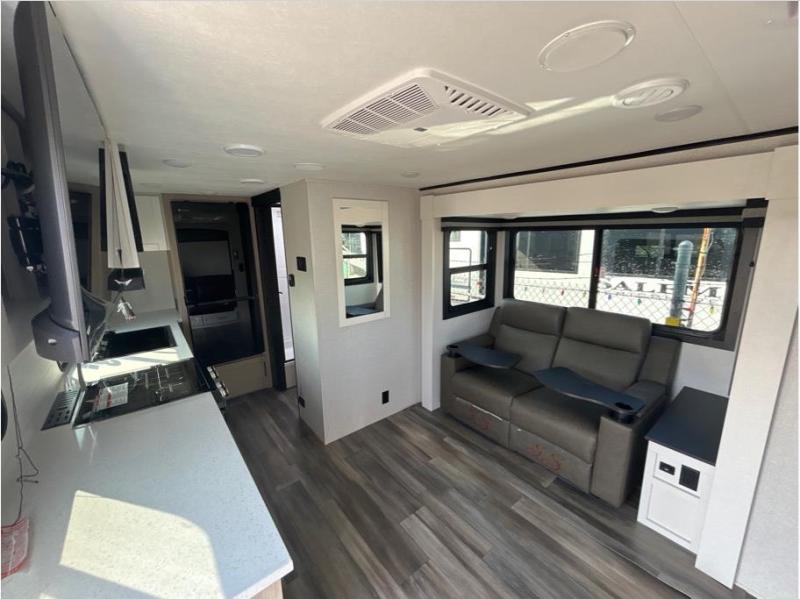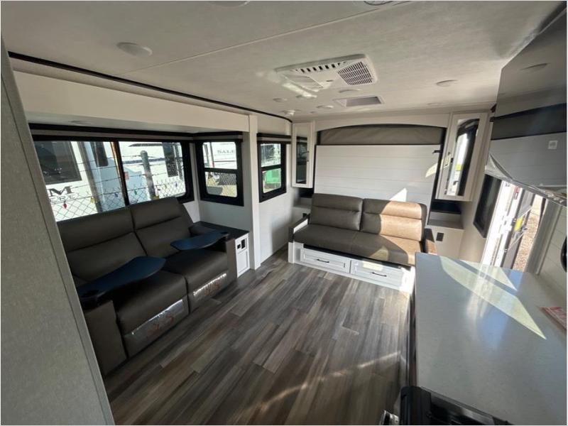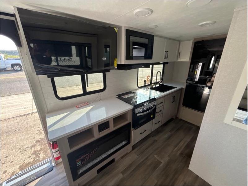 Time at the campground will be time well spent in this spacious couple's trailer! There is a front jack-knife sofa with a table under the sofa where you can dine together. In the evening, just fold down the Murphy bed and you've got an instant cozy bed! Once you've made breakfast on the three-burner cooktop or in the microwave, you can relax on the theater seat slide out with your coffee. The full bath includes a 30" x 36" shower, a vanity and toilet, plus a linen closet and medicine cabinet so everything has a place. Outside, you'll find storage for your hiking gear, a patio awning, and an LP quick connect in case you want to bring along your portable grill!