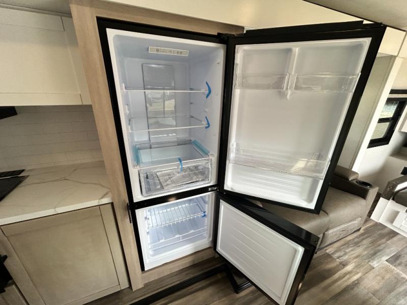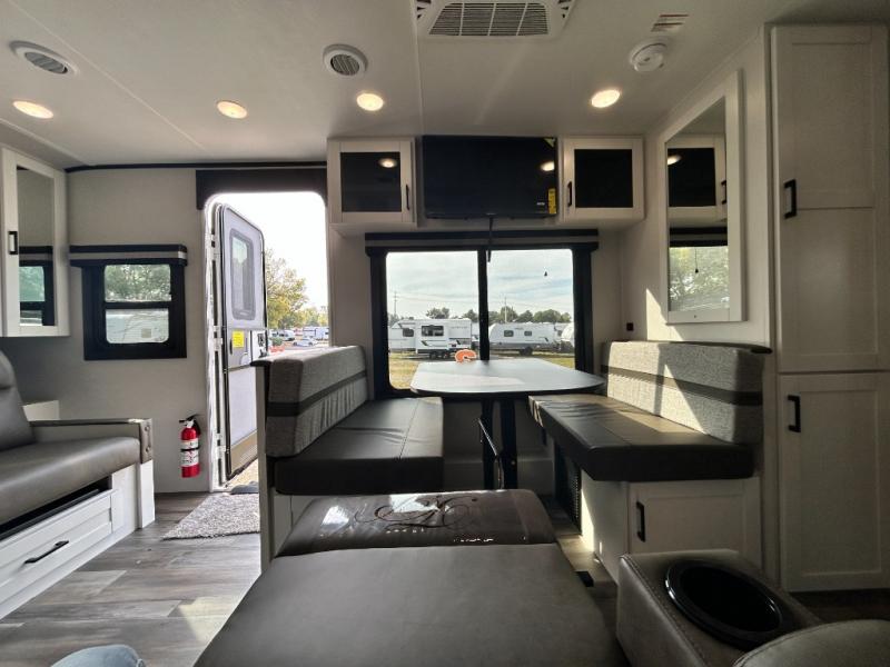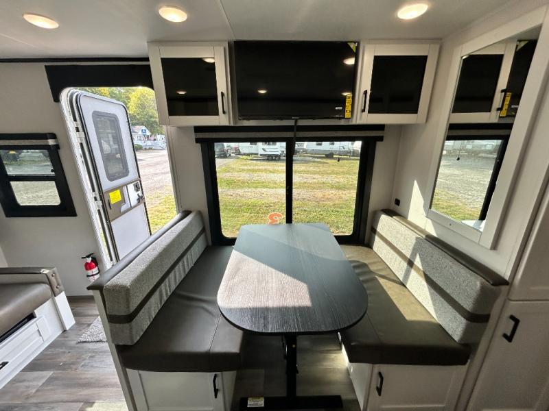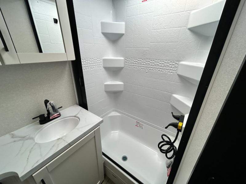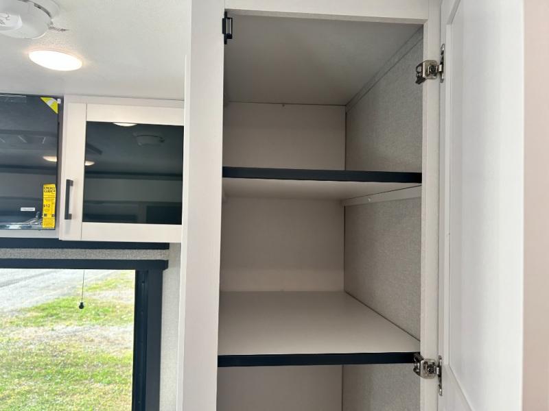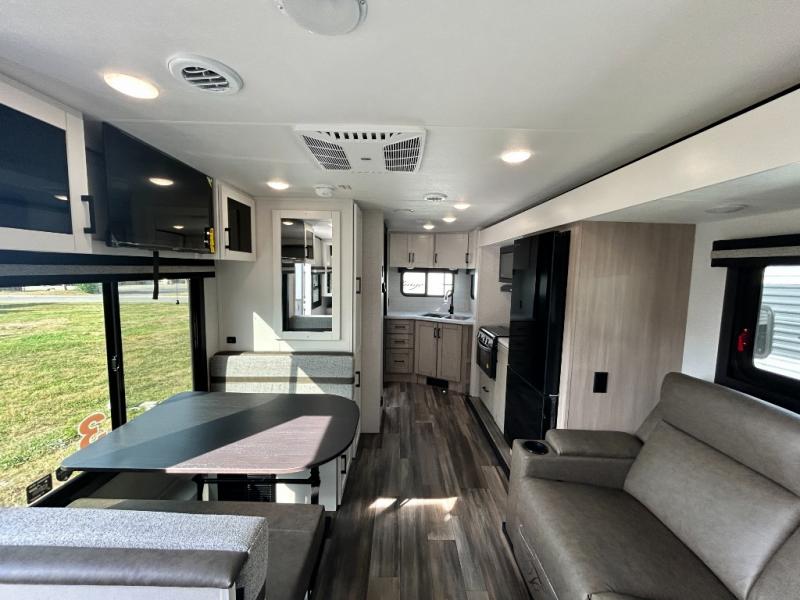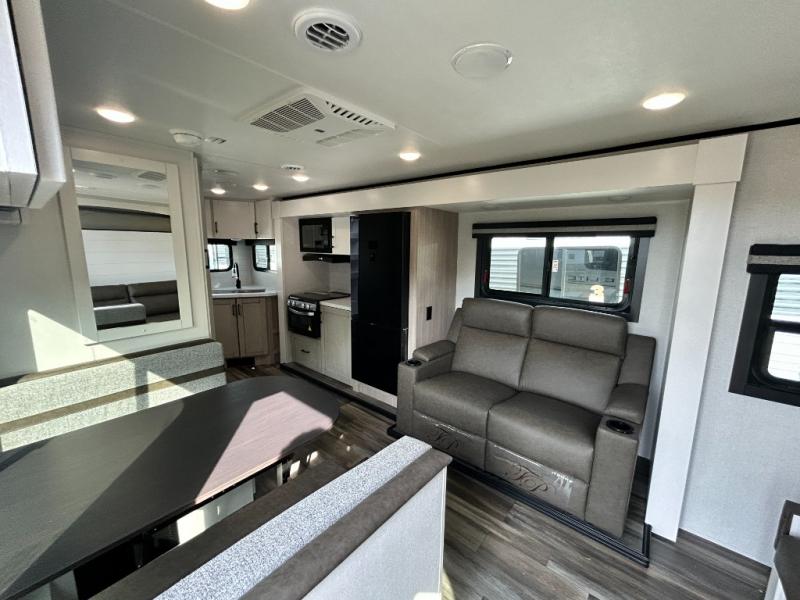 Time at the campground will be time well spent in this spacious travel trailer! There is a front jack-knife sofa with a table under the sofa where you can dine together. In the evening, just fold down the Murphy bed and you've got an instant cozy bed! Once you've made breakfast on the three-burner cooktop or in the microwave, you sit at the booth dinette or relax on the theater seat slide out with your coffee. The full bath includes a 24" x 40" tub/shower, a vanity and toilet, plus a linen closet and medicine cabinet so everything has a place. Outside, you'll find storage for your hiking gear, a 15' power awning with an LED light, and an LP quick connect in case you want to bring along your portable grill!