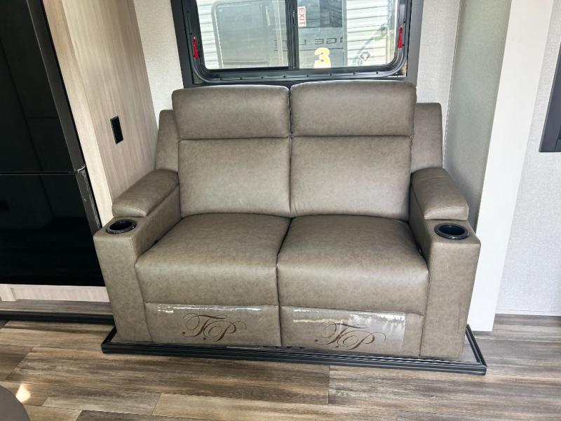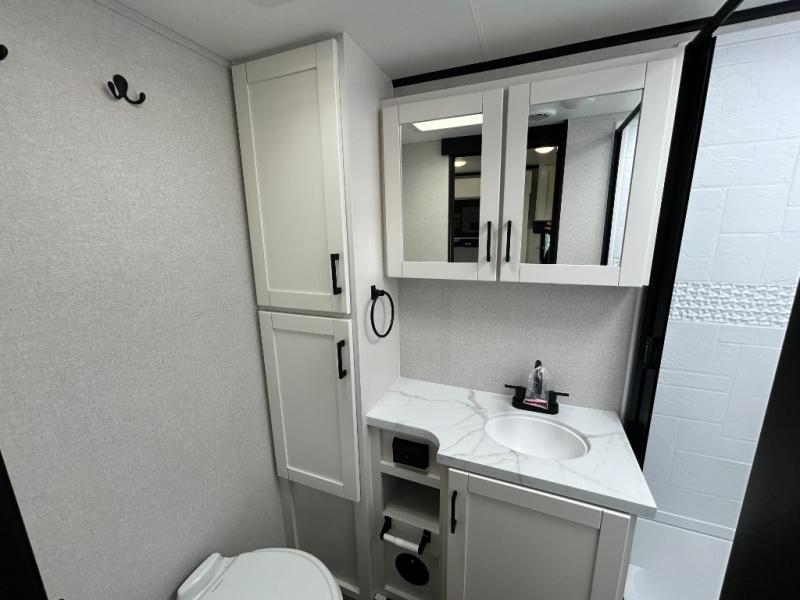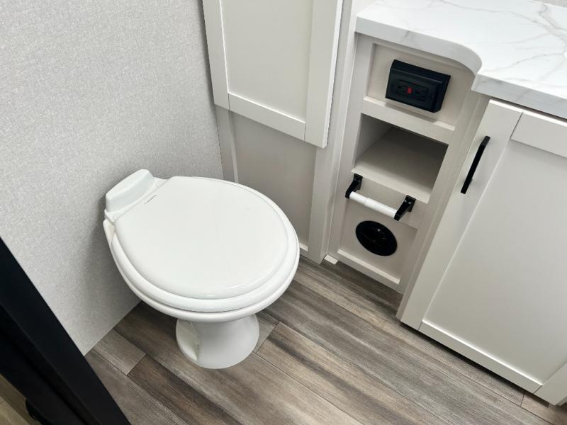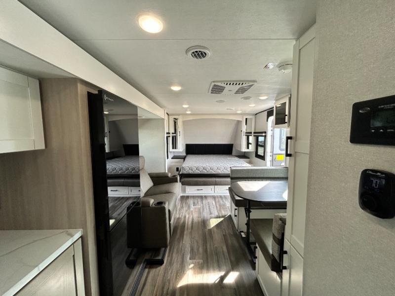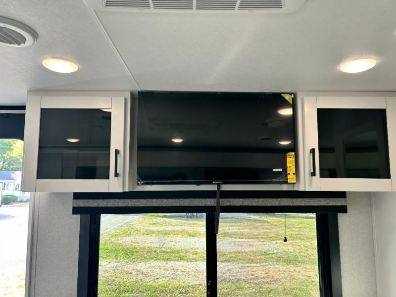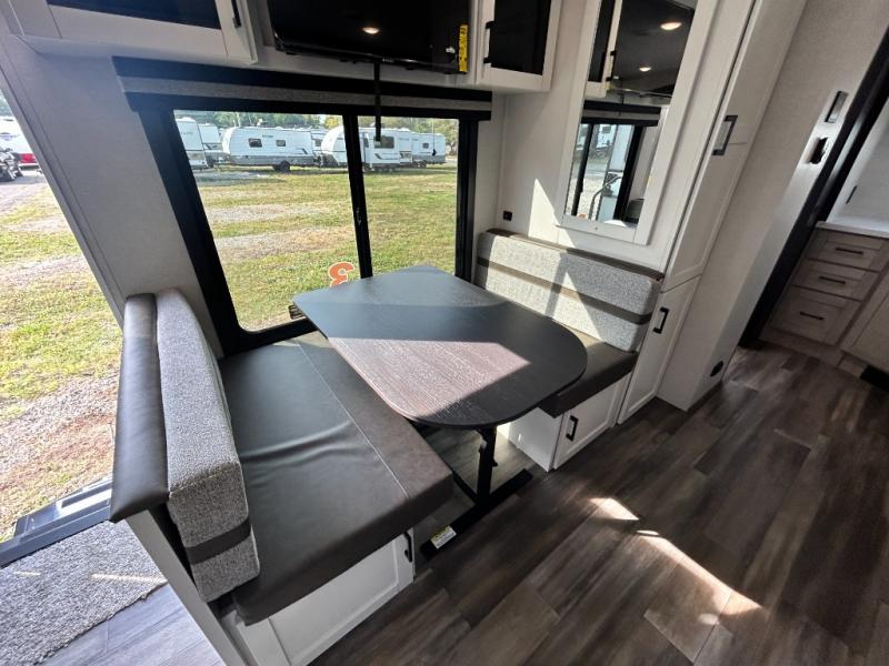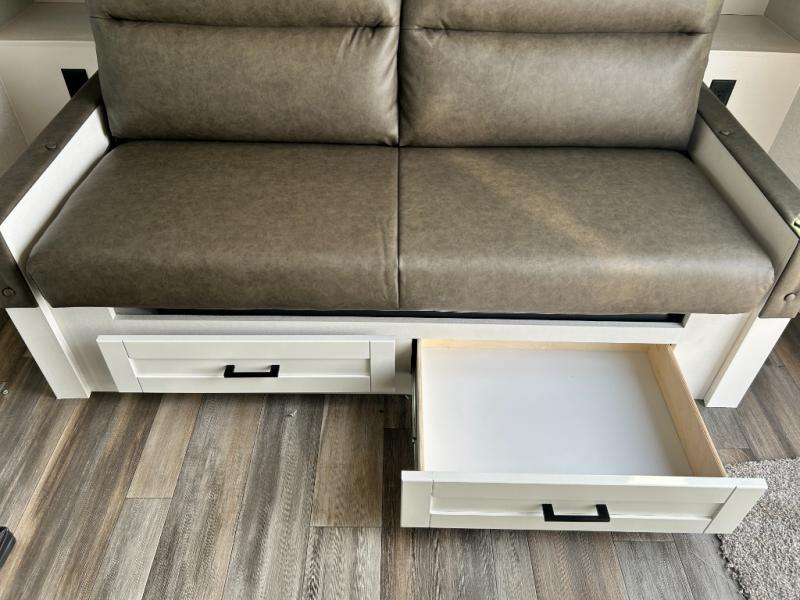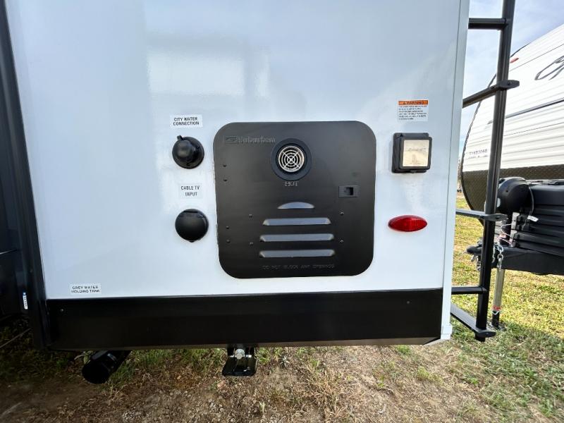 Time at the campground will be time well spent in this spacious travel trailer! There is a front jack-knife sofa with a table under the sofa where you can dine together. In the evening, just fold down the Murphy bed and you've got an instant cozy bed! Once you've made breakfast on the three-burner cooktop or in the microwave, you sit at the booth dinette or relax on the theater seat slide out with your coffee. The full bath includes a 24" x 40" tub/shower, a vanity and toilet, plus a linen closet and medicine cabinet so everything has a place. Outside, you'll find storage for your hiking gear, a 15' power awning with an LED light, and an LP quick connect in case you want to bring along your portable grill!