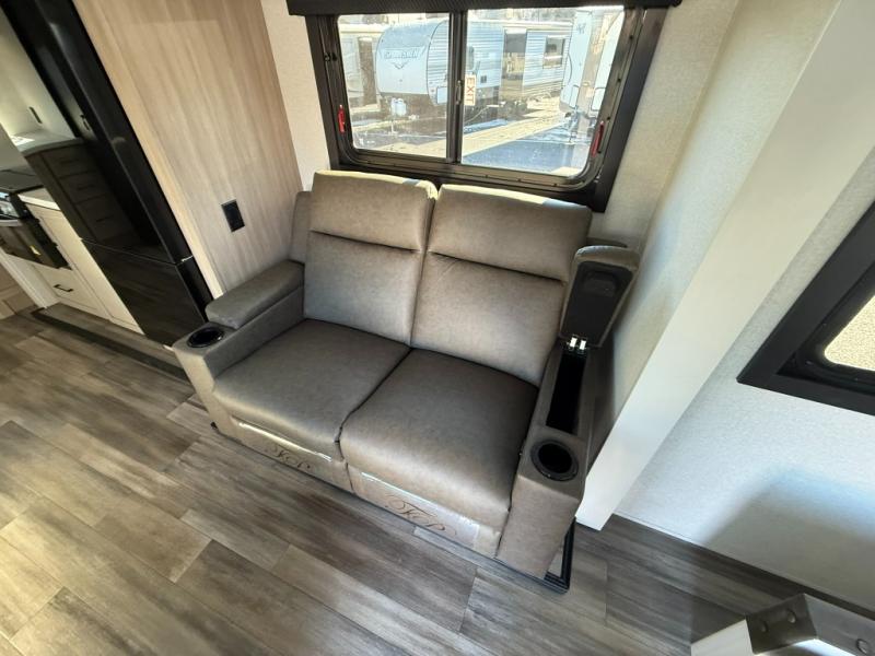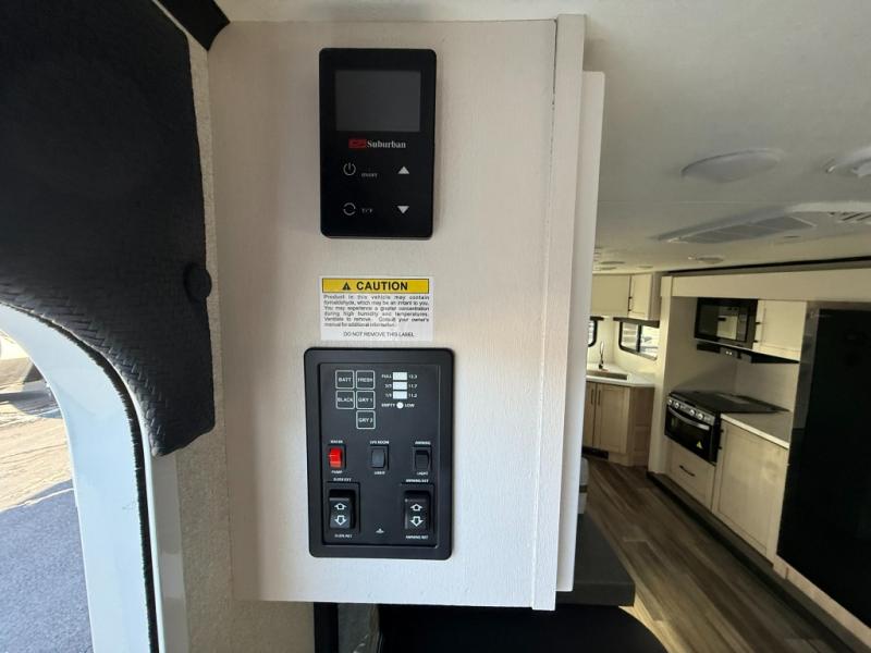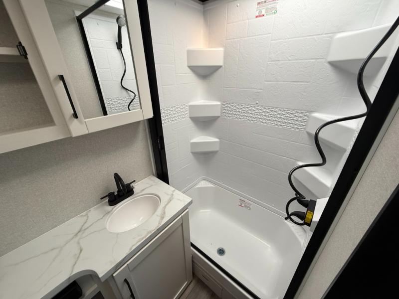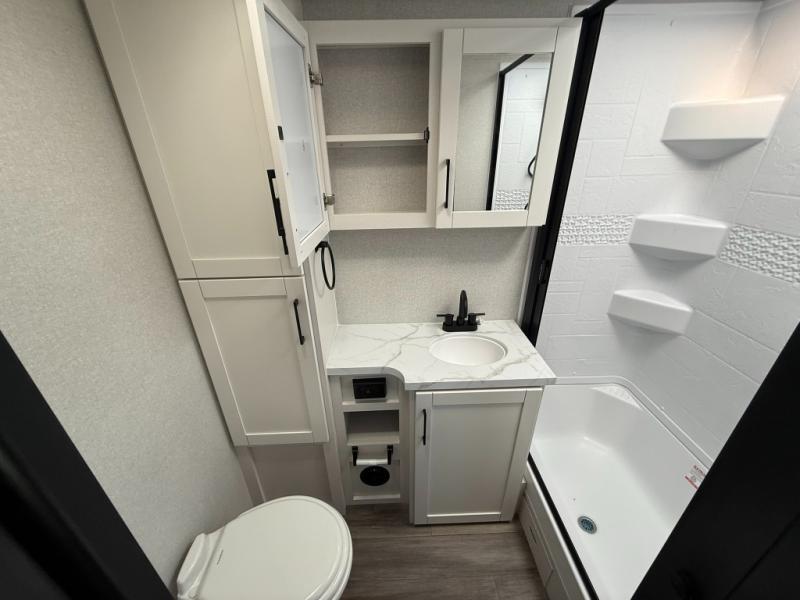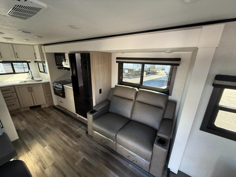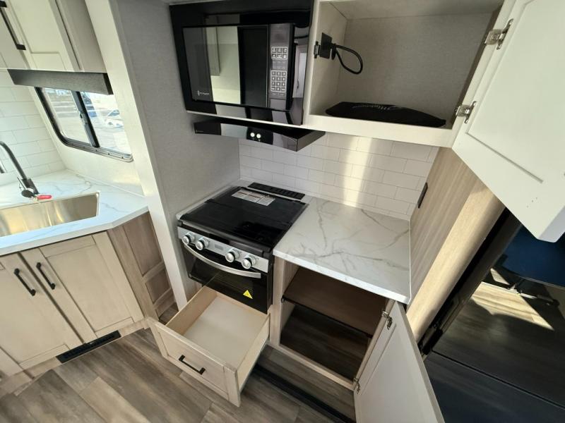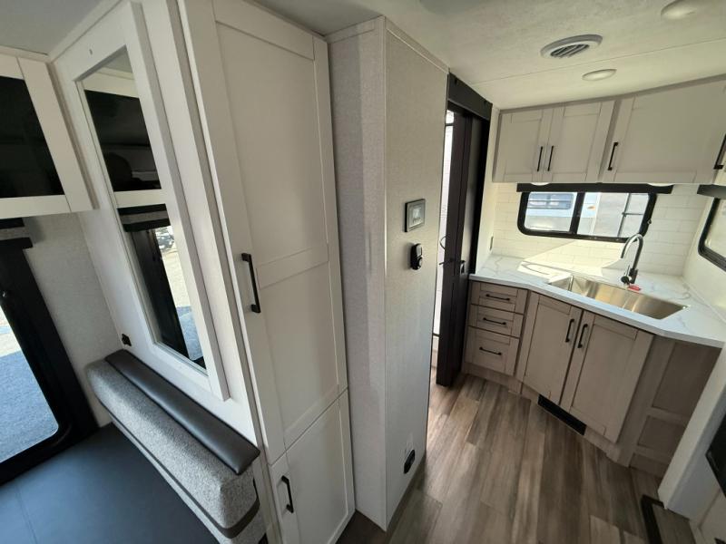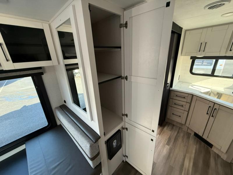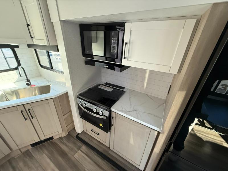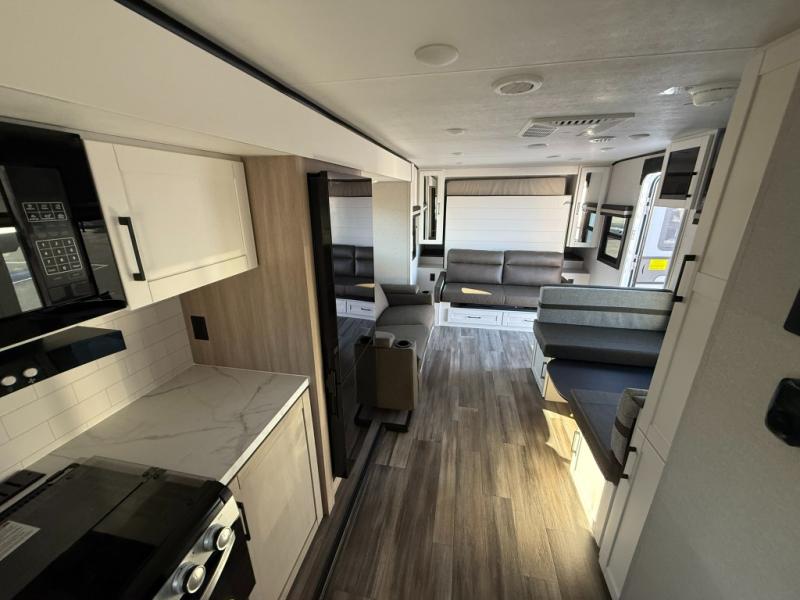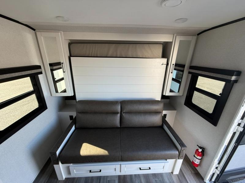 Time at the campground will be time well spent in this spacious travel trailer! There is a front jack-knife sofa with a table under the sofa where you can dine together. In the evening, just fold down the Murphy bed and you've got an instant cozy bed! Once you've made breakfast on the three-burner cooktop or in the microwave, you sit at the booth dinette or relax on the theater seat slide out with your coffee. The full bath includes a 24" x 40" tub/shower, a vanity and toilet, plus a linen closet and medicine cabinet so everything has a place. Outside, you'll find storage for your hiking gear, a 15' power awning with an LED light, and an LP quick connect in case you want to bring along your portable grill!