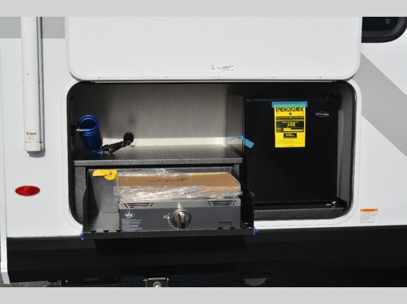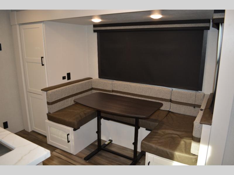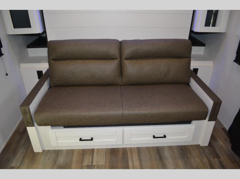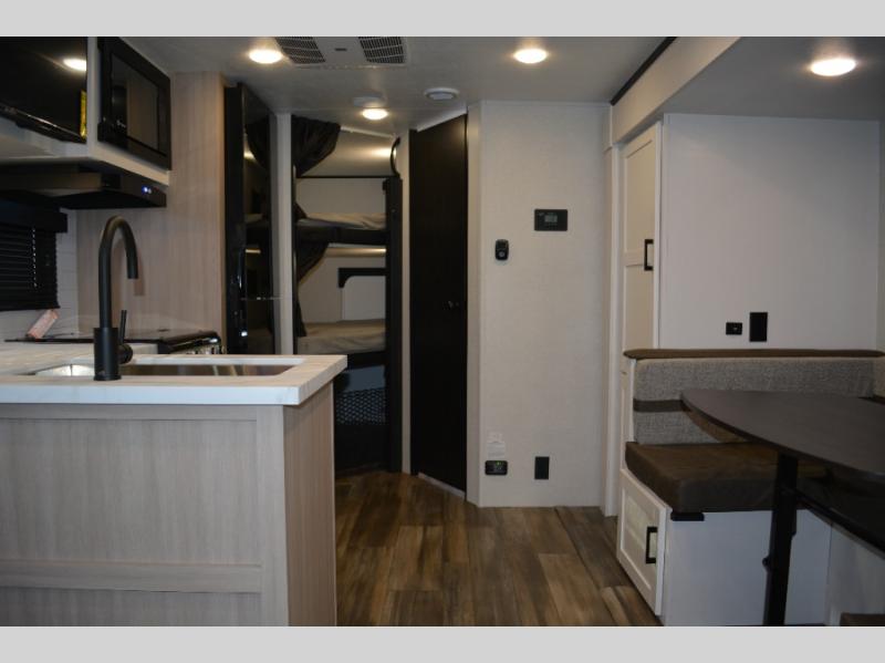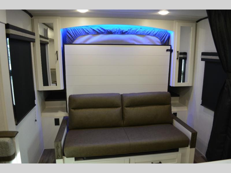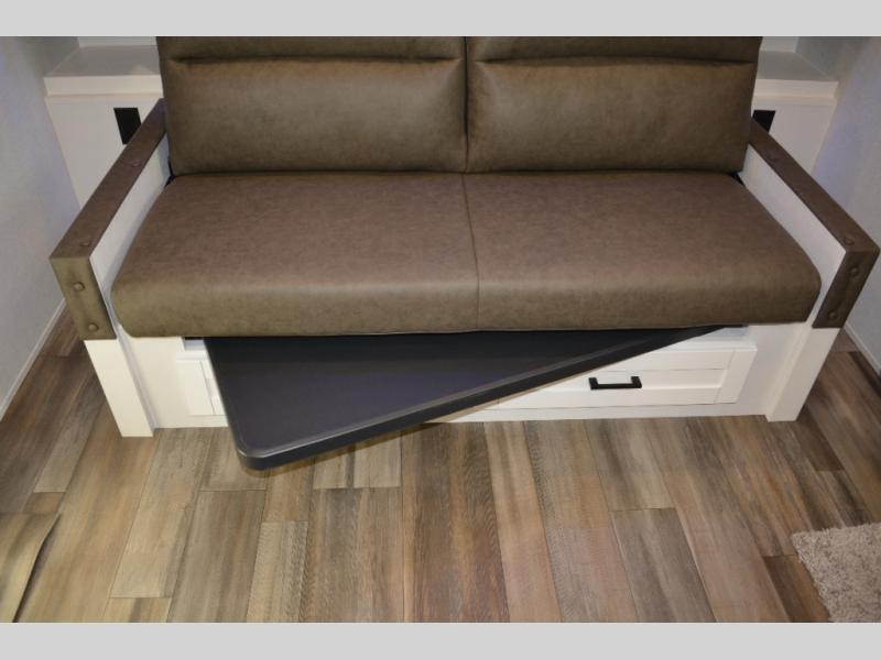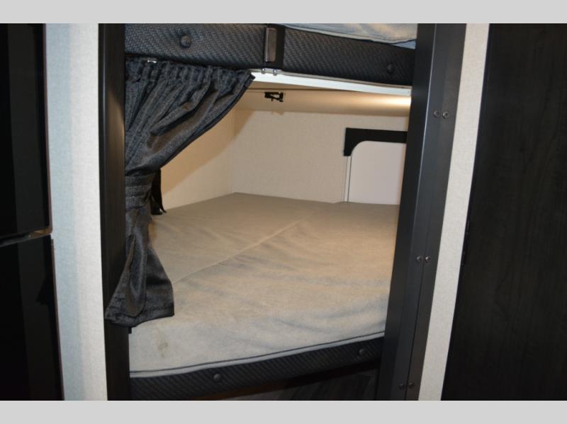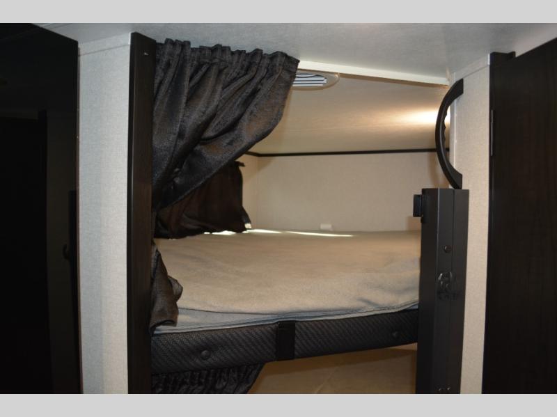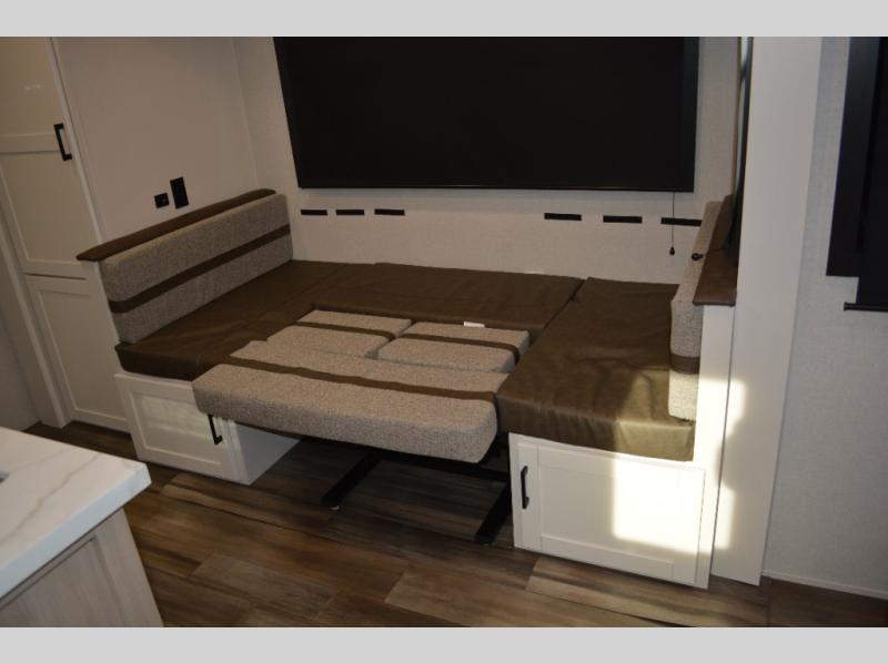 The double-size bunks on this travel trailer feature flip-up storage and a rear cargo door so you can easily load up camp gear! Once you arrive at the campground, you can put out the 19' power awning, then start lunch on the pull-out griddle within the outdoor kitchen. If you don't want to sit outdoors under the awning, you can dine around the U-shaped dinette within the slide out. Along with the bunks and dinette for sleeping space, you'll also find a front Murphy bed, which can be put away in the morning so you can relax on the jack-knife sofa!