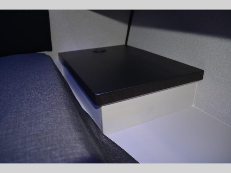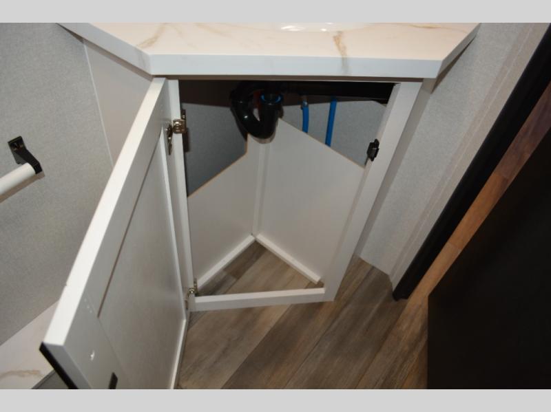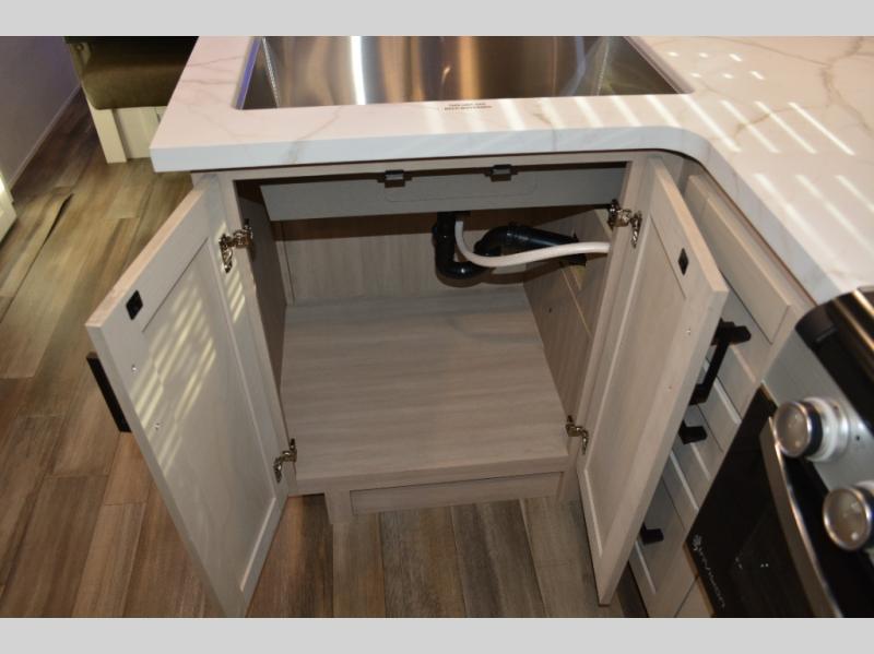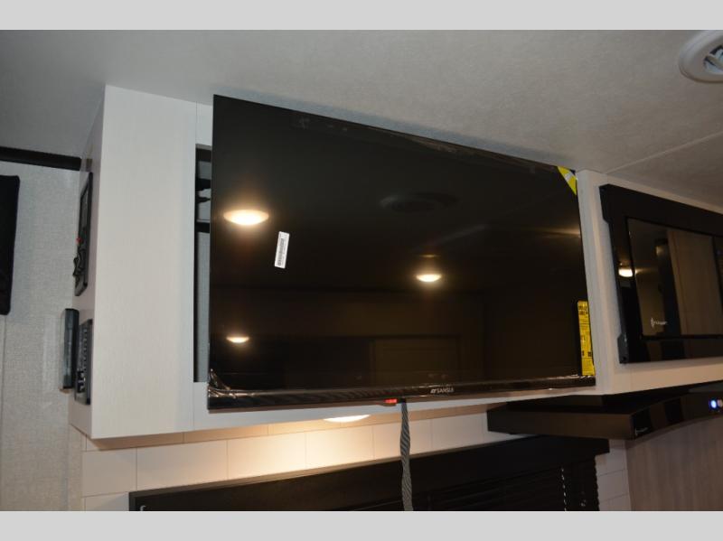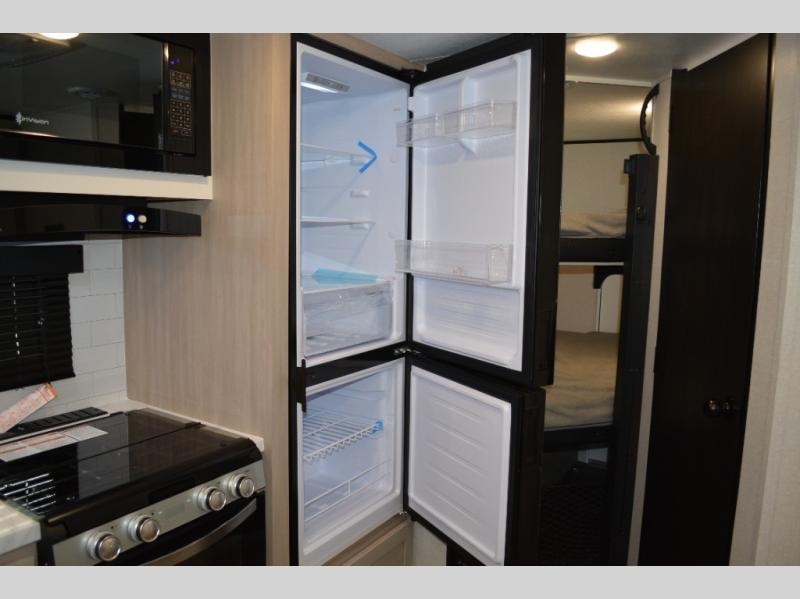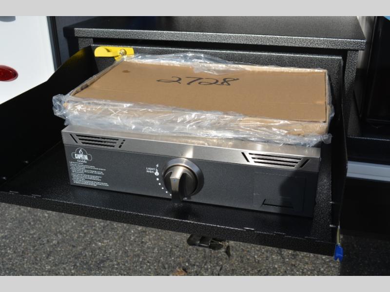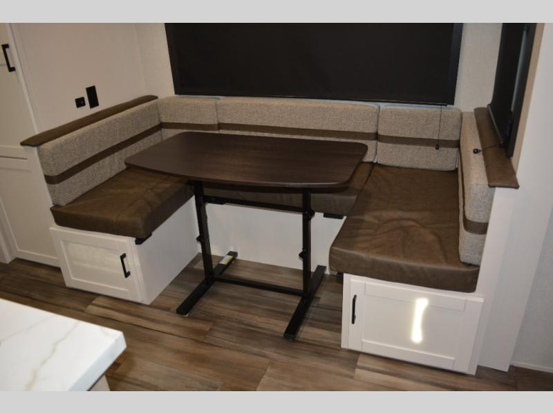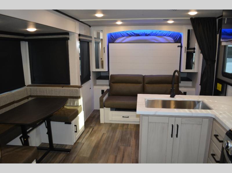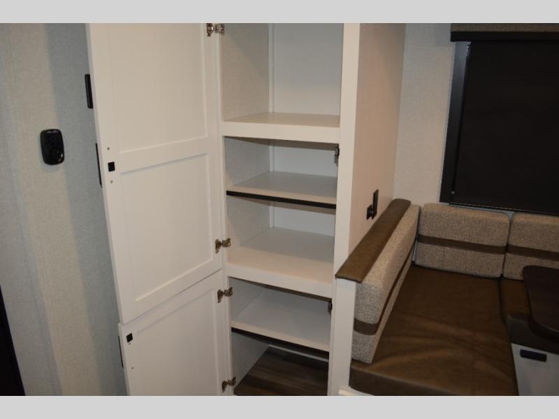 The double-size bunks on this travel trailer feature flip-up storage and a rear cargo door so you can easily load up camp gear! Once you arrive at the campground, you can put out the 19' power awning, then start lunch on the pull-out griddle within the outdoor kitchen. If you don't want to sit outdoors under the awning, you can dine around the U-shaped dinette within the slide out. Along with the bunks and dinette for sleeping space, you'll also find a front Murphy bed, which can be put away in the morning so you can relax on the jack-knife sofa!