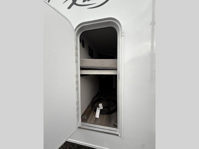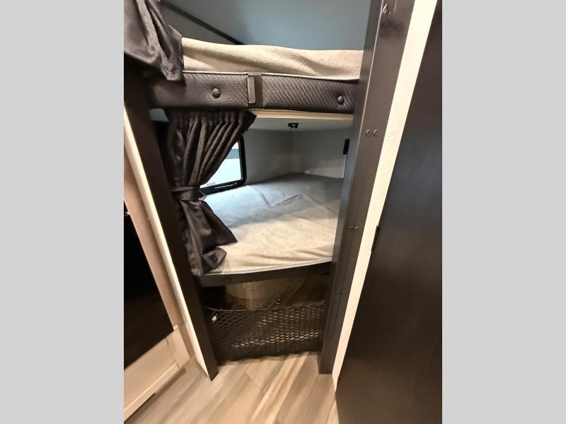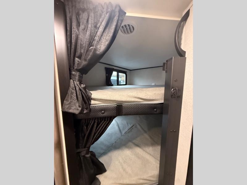 The double-size bunks on this travel trailer feature flip-up storage and a rear cargo door so you can easily load up camp gear! Once you arrive at the campground, you can put out the 19' power awning, then start lunch on the pull-out griddle within the outdoor kitchen. If you don't want to sit outdoors under the awning, you can dine around the U-shaped dinette within the slide out. Along with the bunks and dinette for sleeping space, you'll also find a front Murphy bed, which can be put away in the morning so you can relax on the jack-knife sofa!