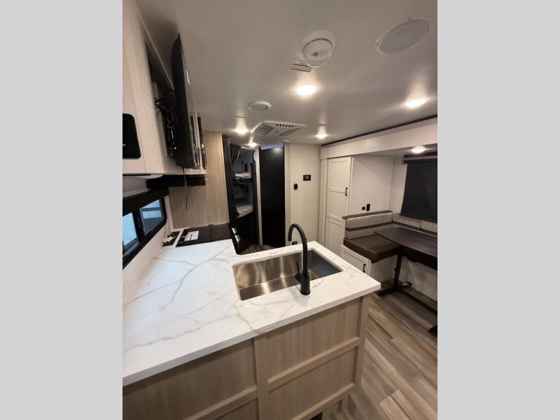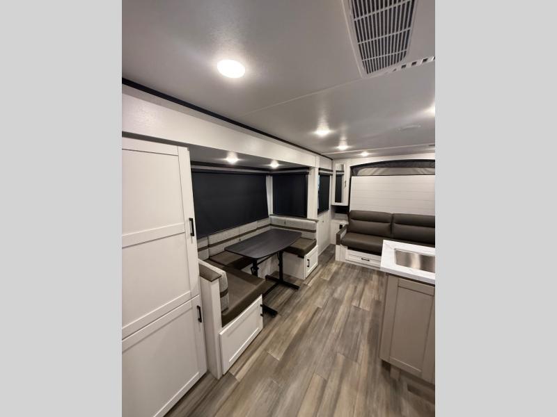 The double-size bunks on this travel trailer feature flip-up storage and a rear cargo door so you can easily load up camp gear! Once you arrive at the campground, you can put out the 19' power awning, then start lunch on the pull-out griddle within the outdoor kitchen. If you don't want to sit outdoors under the awning, you can dine around the U-shaped dinette within the slide out. Along with the bunks and dinette for sleeping space, you'll also find a front Murphy bed, which can be put away in the morning so you can relax on the jack-knife sofa!