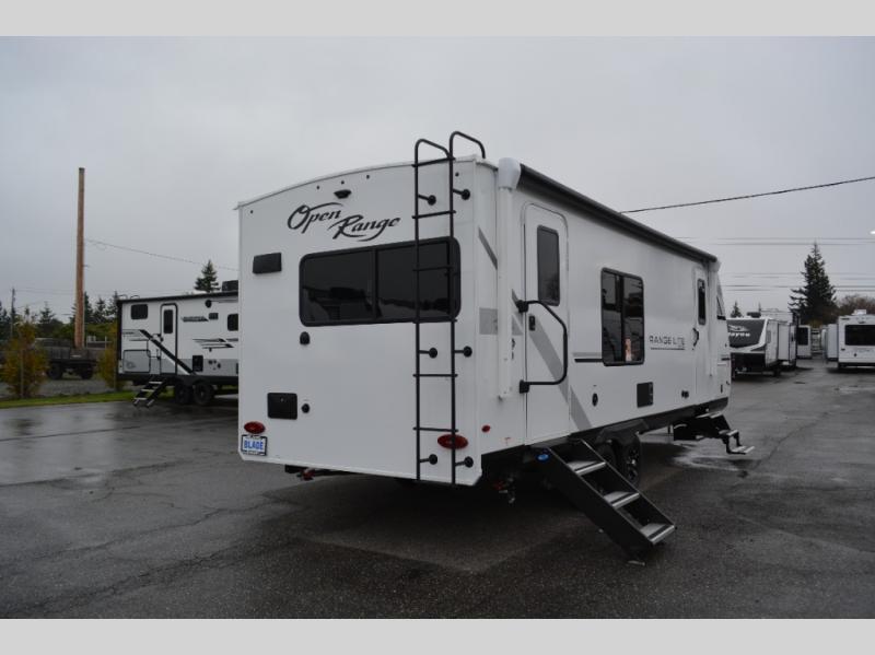With any Range Lite travel trailer by Open Range RV, you will enjoy comfort and convenience at every turn! Each one is built with vacuum bonded sidewalls with interior and exterior Azdel, a 2" TuffShell floor, and front diamond plating to help protect against rock and debris on the way to the campground. The Xtend l Solar Package includes a 200-watt solar panel with a 30-amp solar controller for off-grid capabilities, and you're sure to appreciate the tankless water heater onboard for endless hot showers. Head inside to enjoy residential cabinetry with large doors and drawers, roller shades with radiant barrier backer, Invision kitchen appliance package, and many more comforts! Choose the optional Legacy Package for a molded front cap, 5-point power stabilization system, solid surface countertops, and more optional features to further customize your travel trailer!