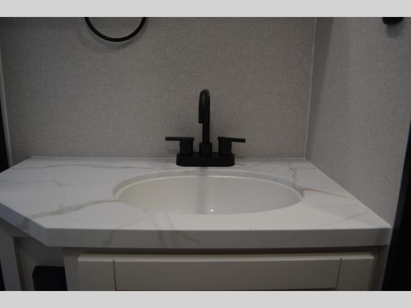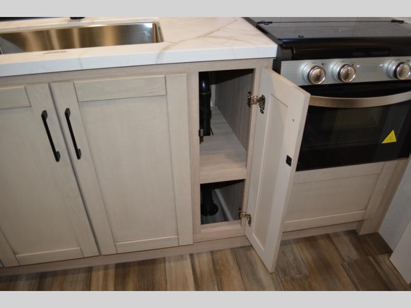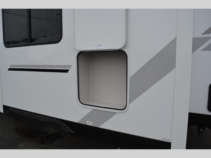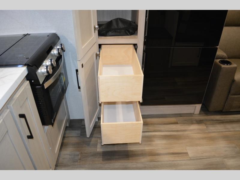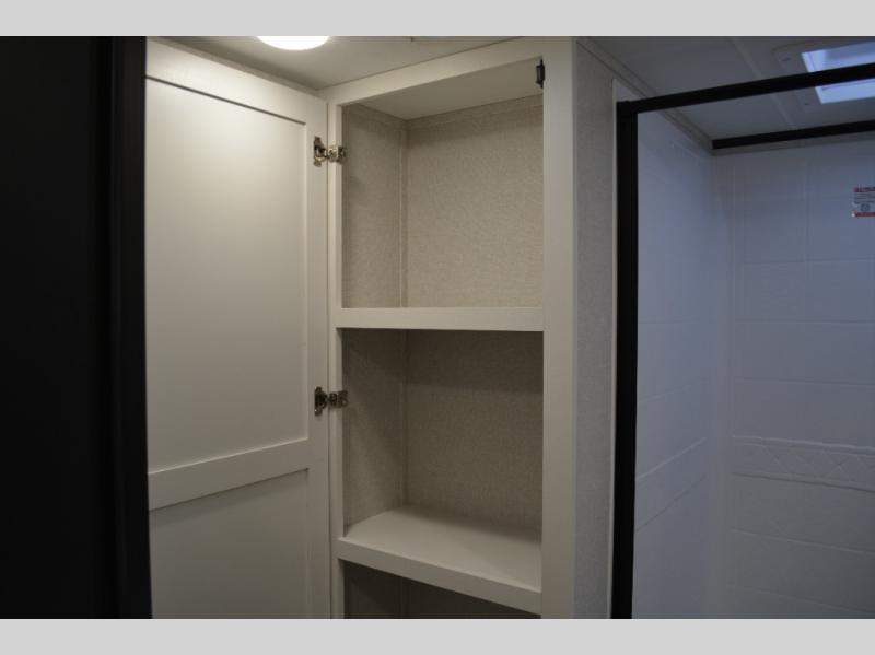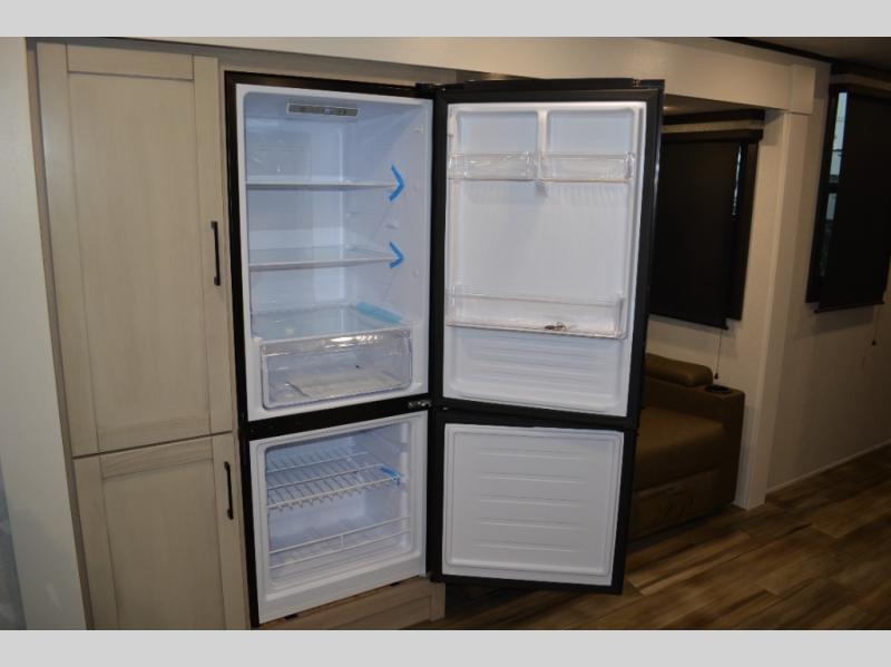 It won't be hard to find comfort in this dual entry travel trailer! The front private bedroom includes one of those entry doors, along with a queen bed, dual nightstands, and overhead storage. A full bath is centrally located for easy use day and night, and you'll appreciate linen storage here to keep towels organized. Head to the rear kitchen where you'll find ample counter space to prep meals, plus a pantry and 12V refrigerator within the large slide out. There is a booth dinette and theater seat for comfortable seating spaces when you don't want to sit outdoors under the 20' power awning!