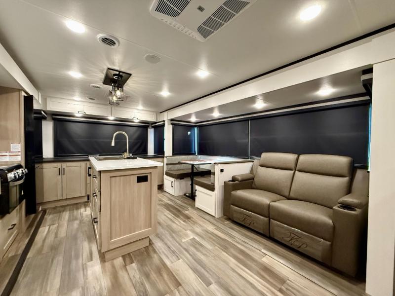 This travel trailer is perfect for those who love to get away but may still need a place to telecommute! There is a rear desk that spans the width of the back, along with an ottoman and generous overhead storage. After work, you can make dinner on the three-burner cooktop, then dine at the booth dinette or relax on the tri-fold sofa! There is also a kitchen island here for extra space and additional counter space above the fireplace. A full bath towards the front will let you stay clean throughout your trip, and the front bedroom with a queen bed will feel just like home.