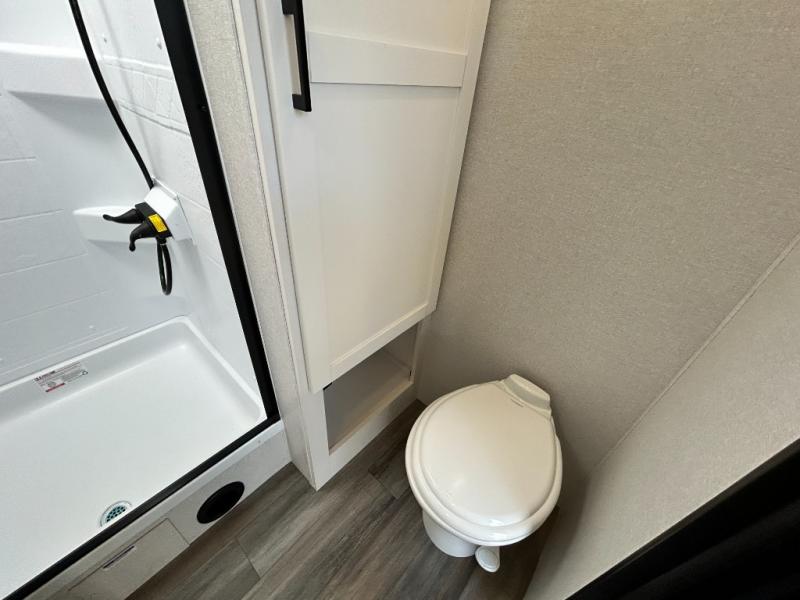 This travel trailer is perfect for those who love to get away but may still need a place to telecommute! There is a rear desk that spans the width of the back, along with an ottoman and generous overhead storage. After work, you can make dinner on the three-burner cooktop, then dine at the booth dinette or relax on the tri-fold sofa! There is also a kitchen island here for extra space and additional counter space above the fireplace. A full bath towards the front will let you stay clean throughout your trip, and the front bedroom with a queen bed will feel just like home.