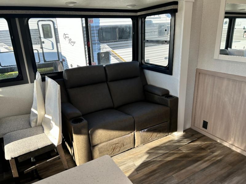 With any Range Lite travel trailer by Open Range RV, you will enjoy comfort and convenience at every turn! Each one is built with vacuum bonded sidewalls with interior and exterior Azdel, a 2" TuffShell floor, and front diamond plating to help protect against rock and debris on the way to the campground. The Xtend l Solar Package includes a 200-watt solar panel with a 30-amp solar controller for off-grid capabilities, and you're sure to appreciate the tankless water heater onboard for endless hot showers. Head inside to enjoy residential cabinetry with large doors and drawers, roller shades with radiant barrier backer, Invision kitchen appliance package, and many more comforts! Choose the optional Legacy Package for a molded front cap, 5-point power stabilization system, solid surface countertops, and more optional features to further customize your travel trailer!